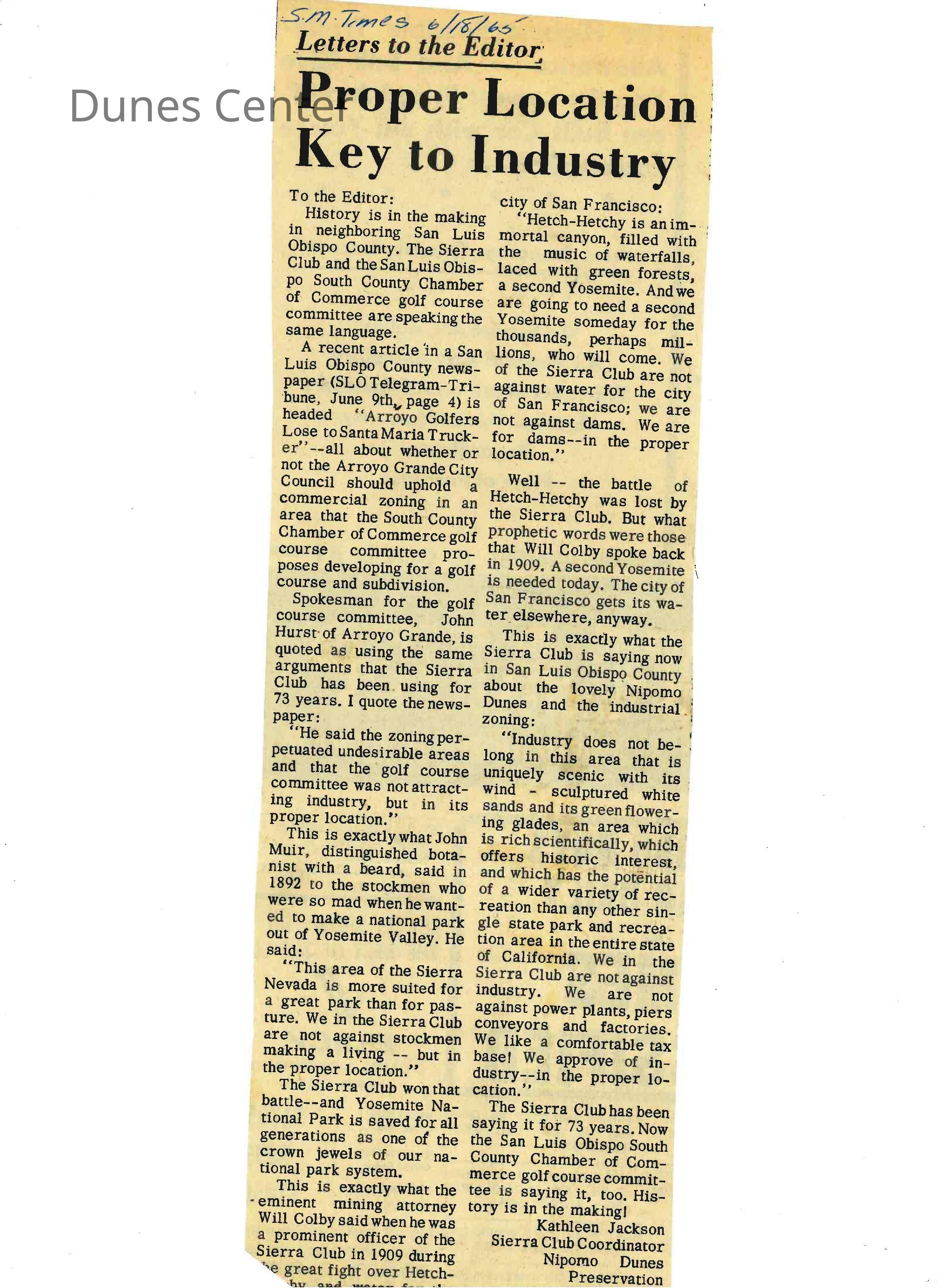 June 18, 1965. Santa Maria Times. Letters to the Editor "Proper Location Key to Industry" from Kathleen Jackson.