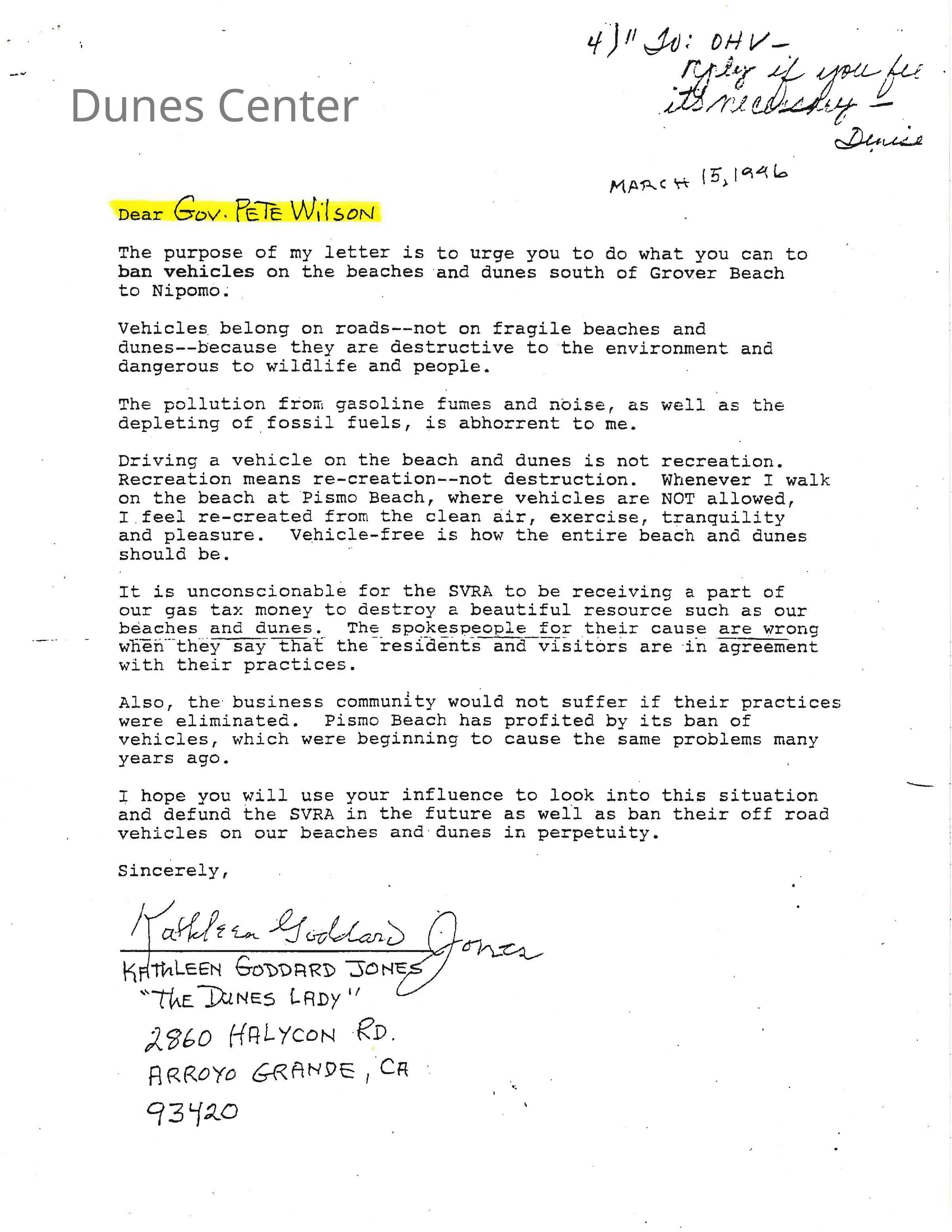 March 15, 1996. Letter from Kathleen Goddard Jones to Gov. Pete Wilson regarding banning vehicles on the beach.