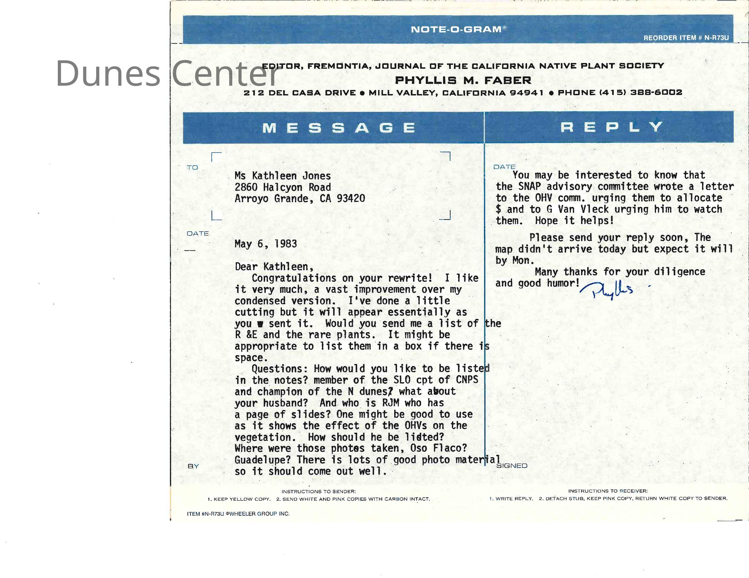 May 6, 1983. Letter from Phyllis M. Faber to Kathleen Jones