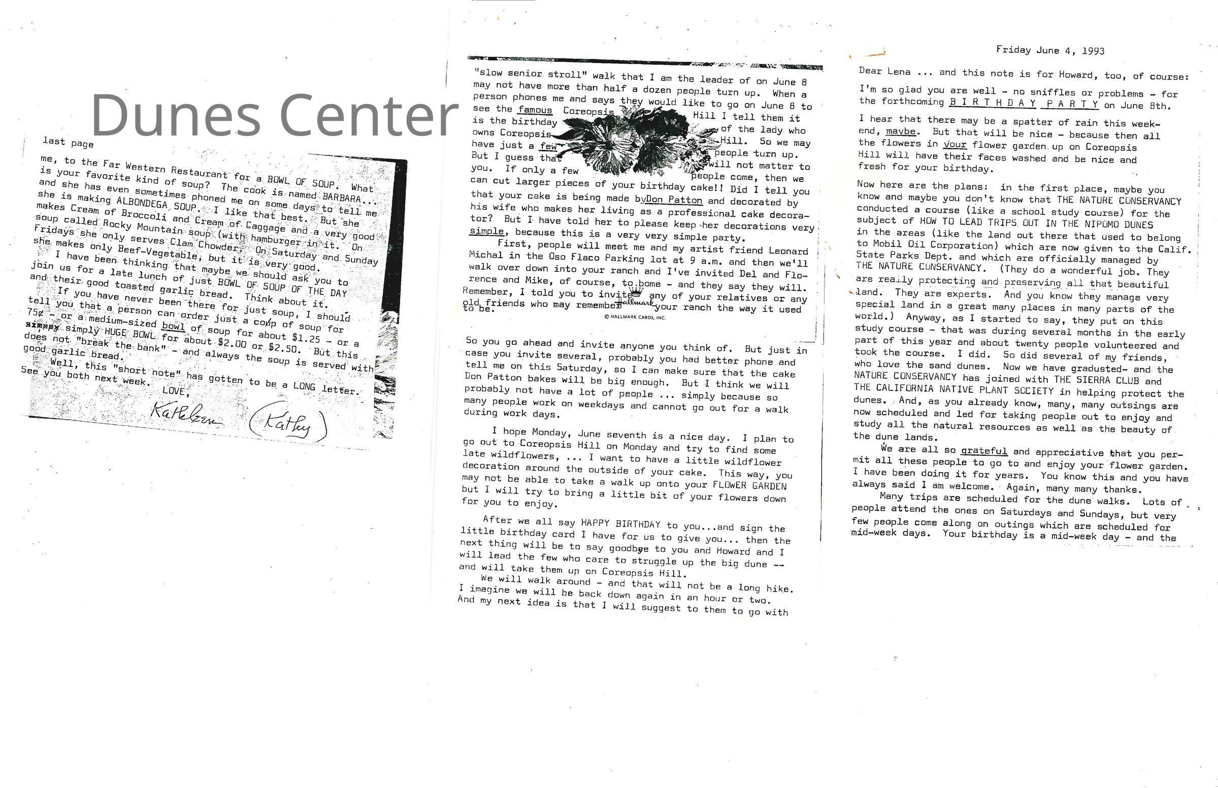 June 4, 1993. Letter from Kathleen Goddard Jones to Lena Enos Buss on plans for her 90th birthday party.