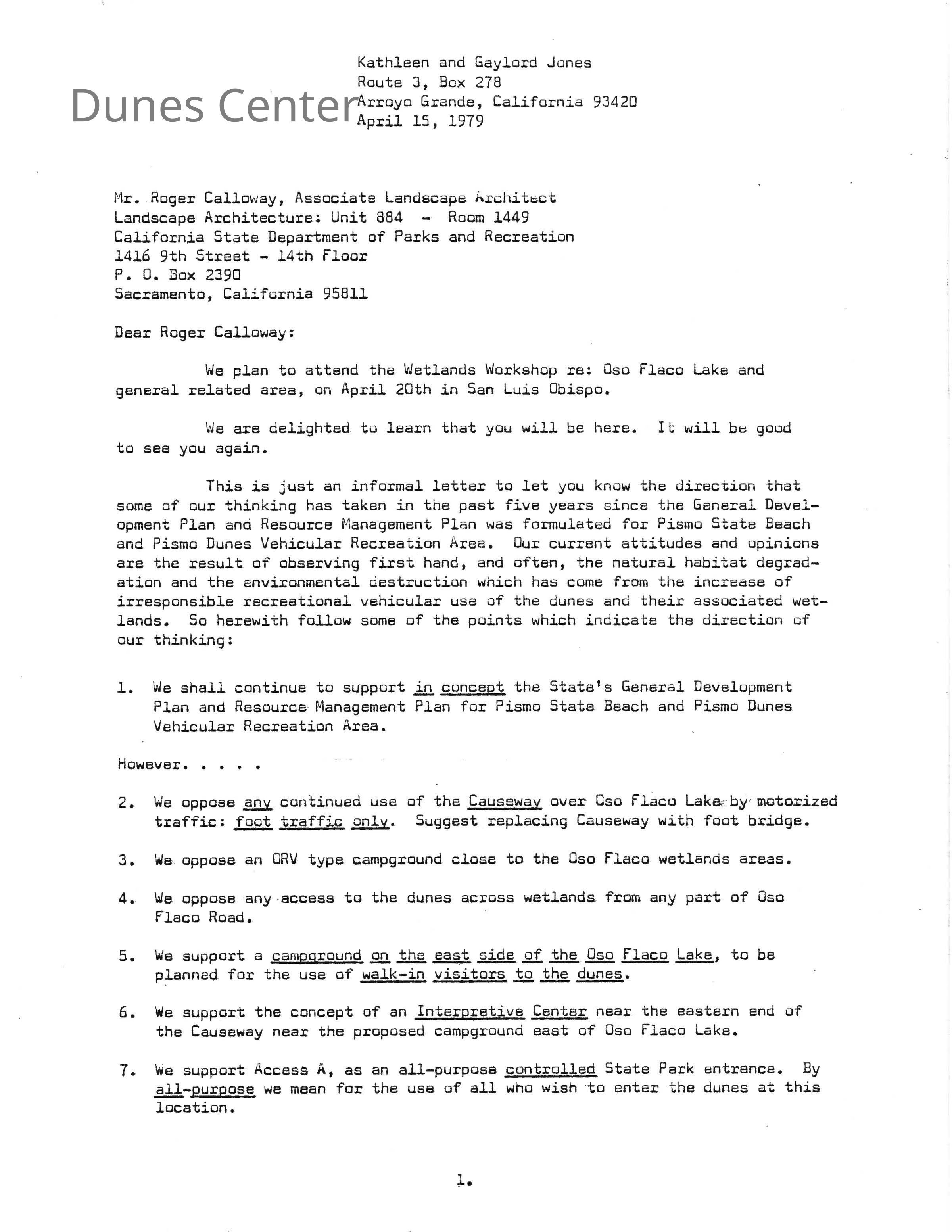 April 15, 1979. Letter from Kathleen and Gaylord Jones to Roger Calloway, Associate Landscape Architect at the Dept. of Parks and Recreation.