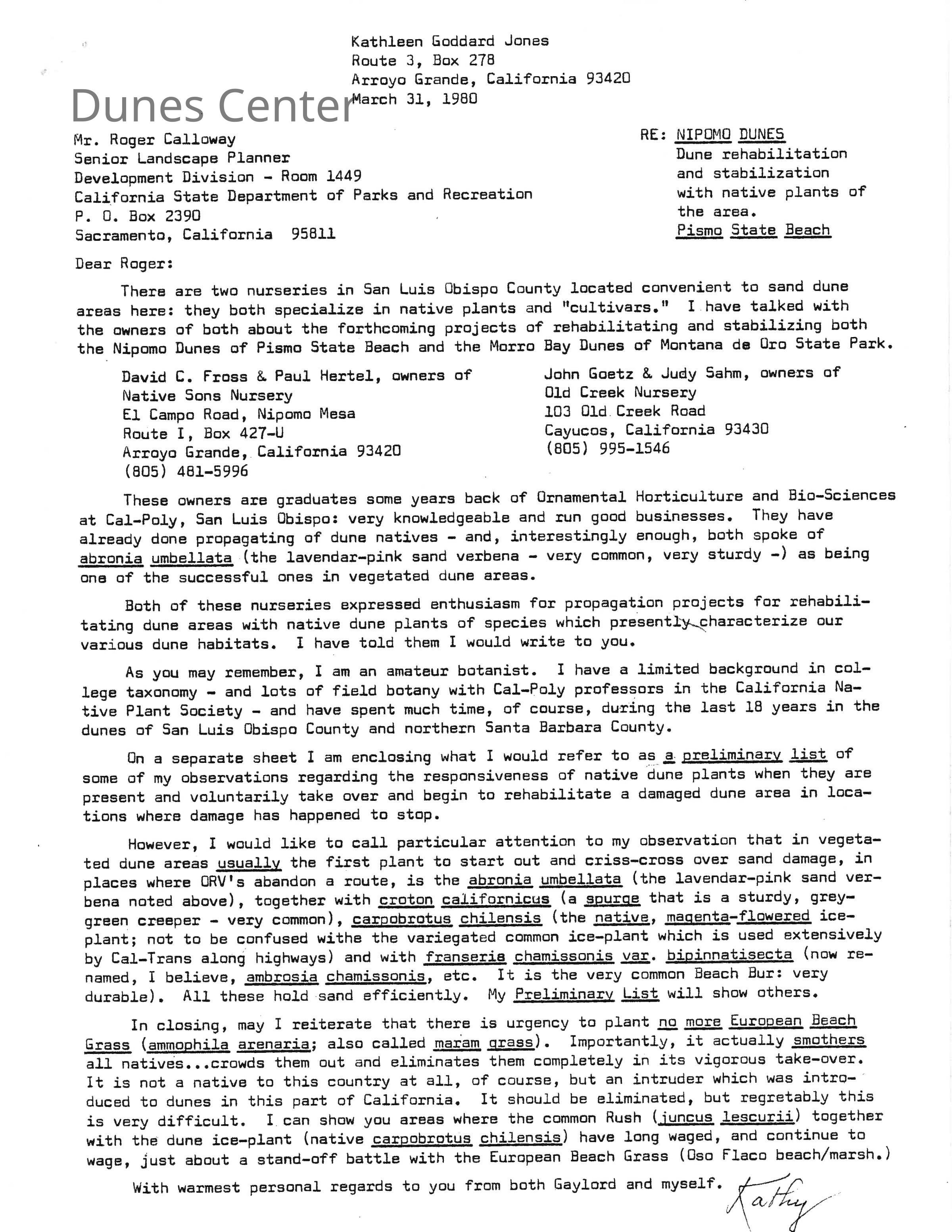 March 31, 1980. Letter to Roger Calloway, Senior Landscape Planner, at the Dept. of Parks and Recreation, from Kathleen Goddard Jones regarding dune stabilization and rehabilitation with native plants at the Pismo State Beach.