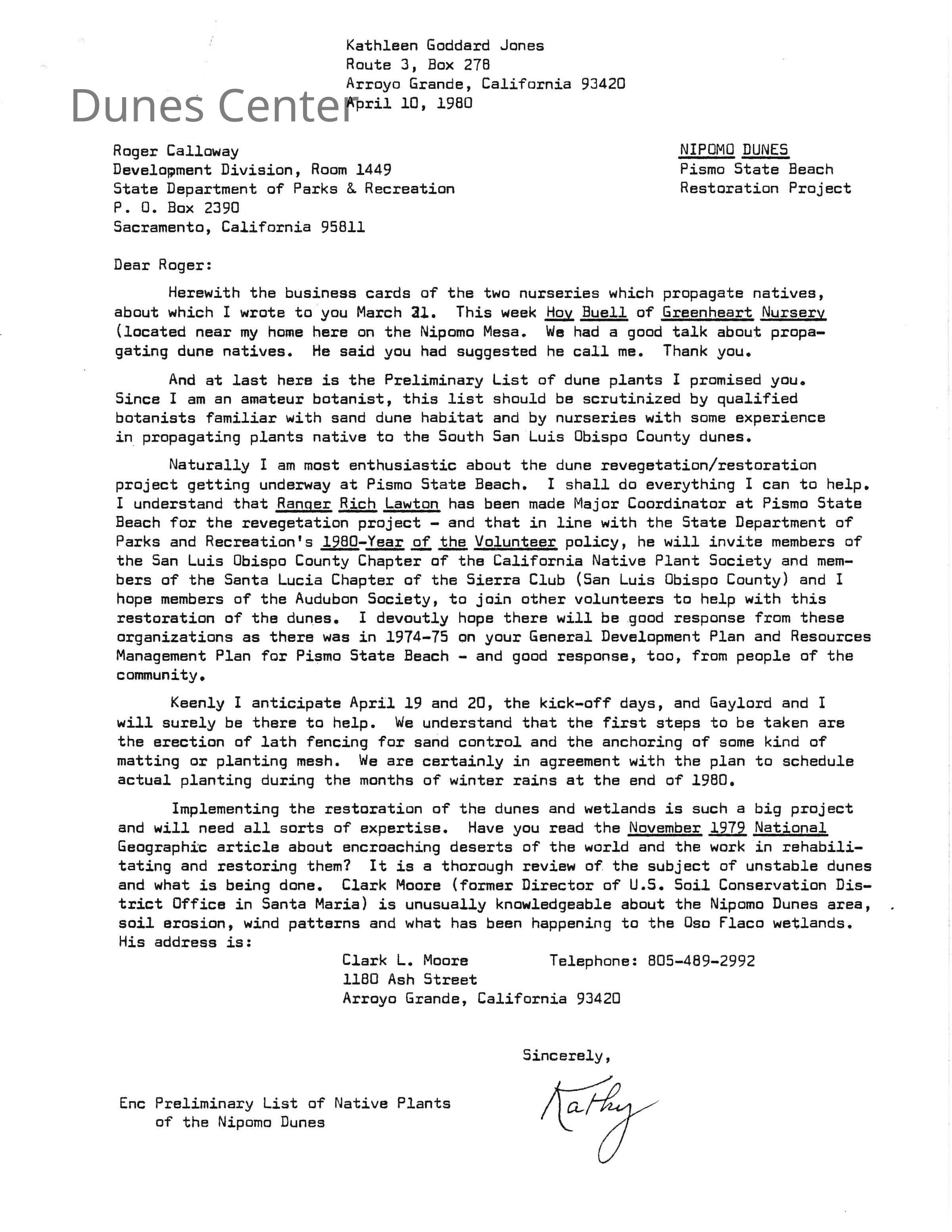 April 10, 1980. Letter to Roger Calloway from Kathleen Goddard Jones regarding the Nipomo Dunes Pismo State Beach restoration project.