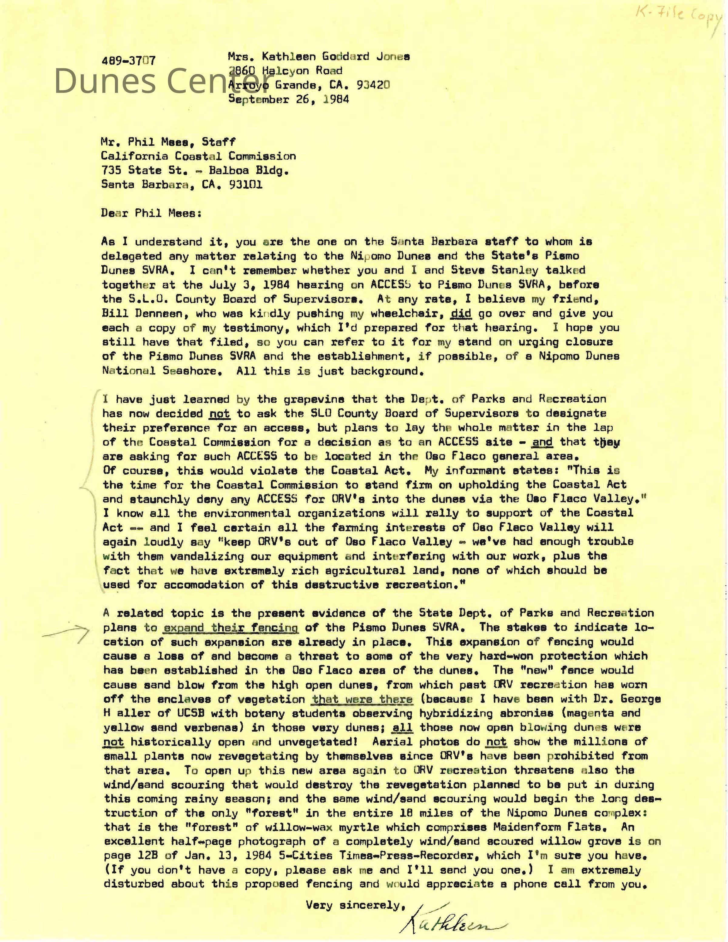 September 26, 1984. Letter to Phil Mees, staff at the California Coastal Commission, from Kathleen Goddard Jones regarding the Dept. of Parks and Recreation wants to ask the Coastal Commission for an access site in the Oso Flaco Lake area, this violating the Coastal Act. Jones also mentions further plans of the department to expand the fencing of the Pismo Dunes SVRA to enroach on Oso Flaco Dunes area.