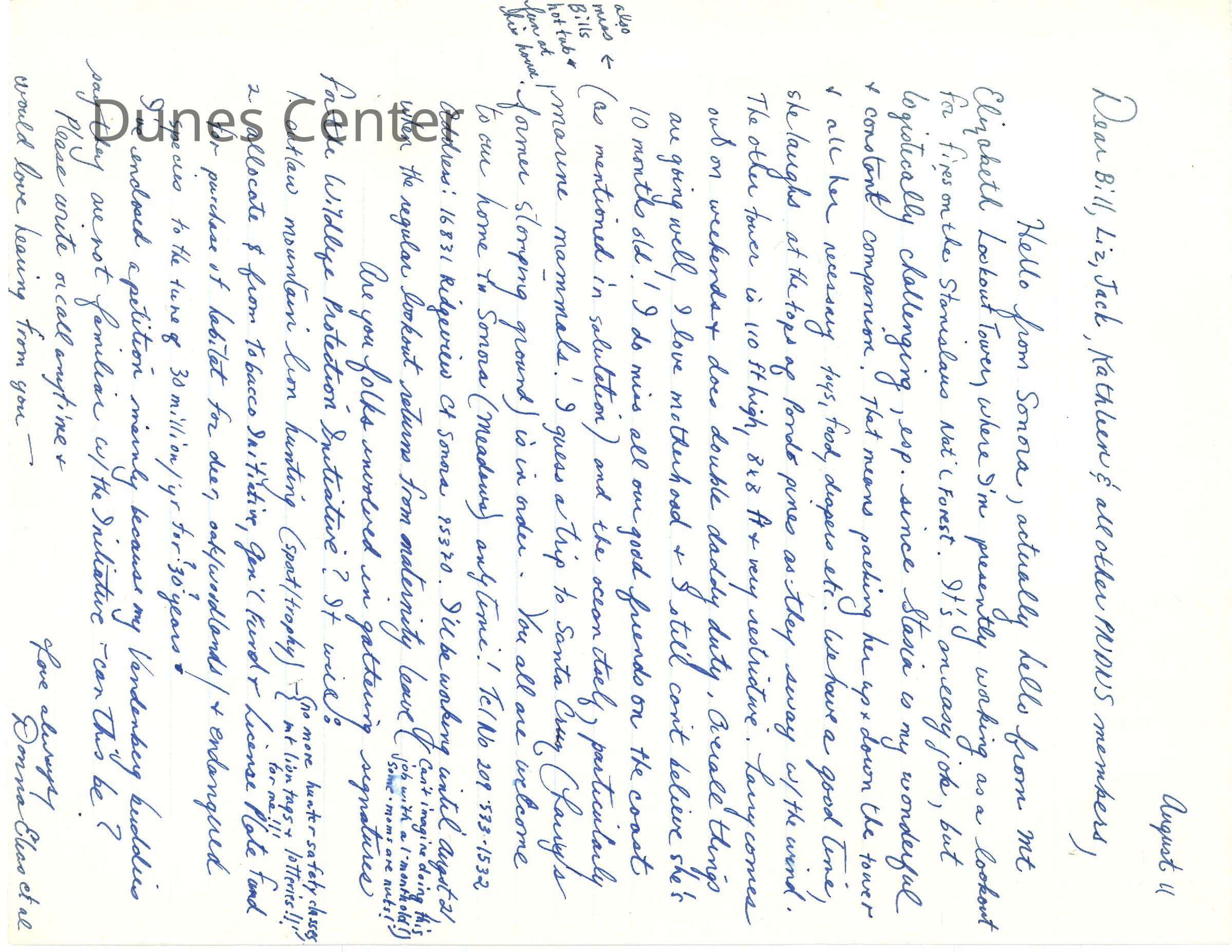 Dated August 4, year unknown, letter from Donna Elias to Bill, Liz (Elizabeth Scott-Graham), Jack, Kathleen, and all other PNDNS members, describes goals of the Wildlife Protection Initiative