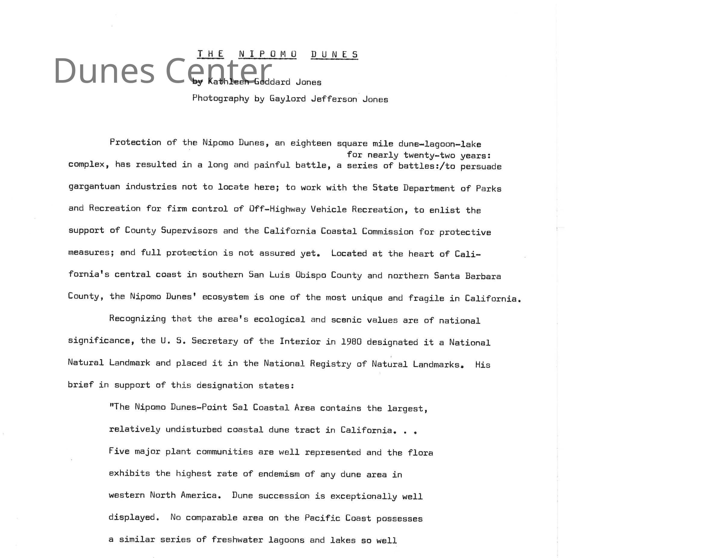 "The Nipomo Dunes" by Kathleen Goddard Jones written for publication in Freemontia January 1984 issue.Collection