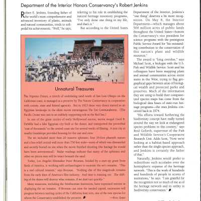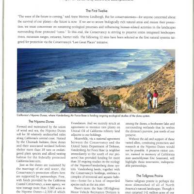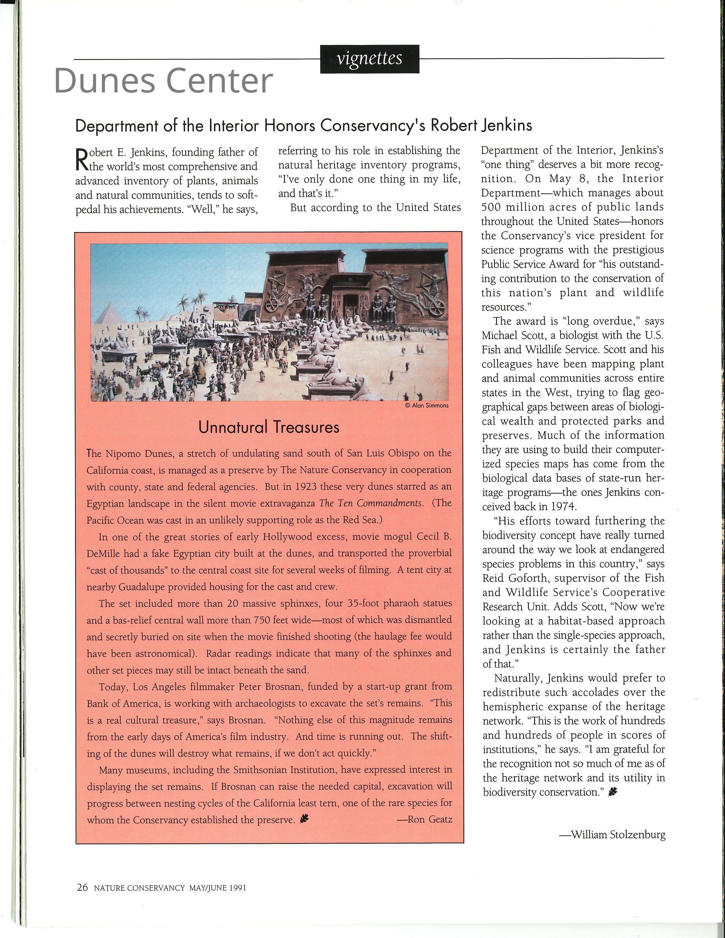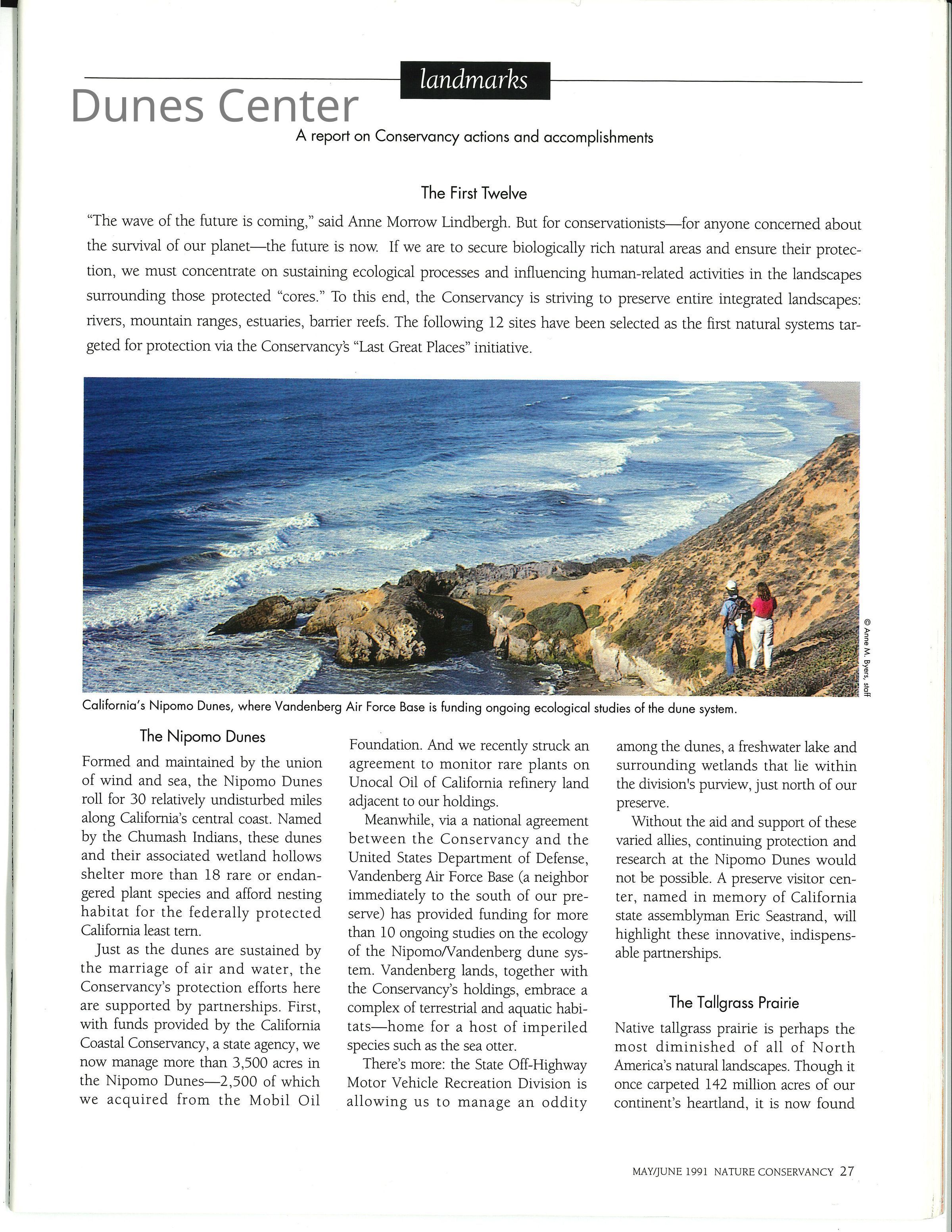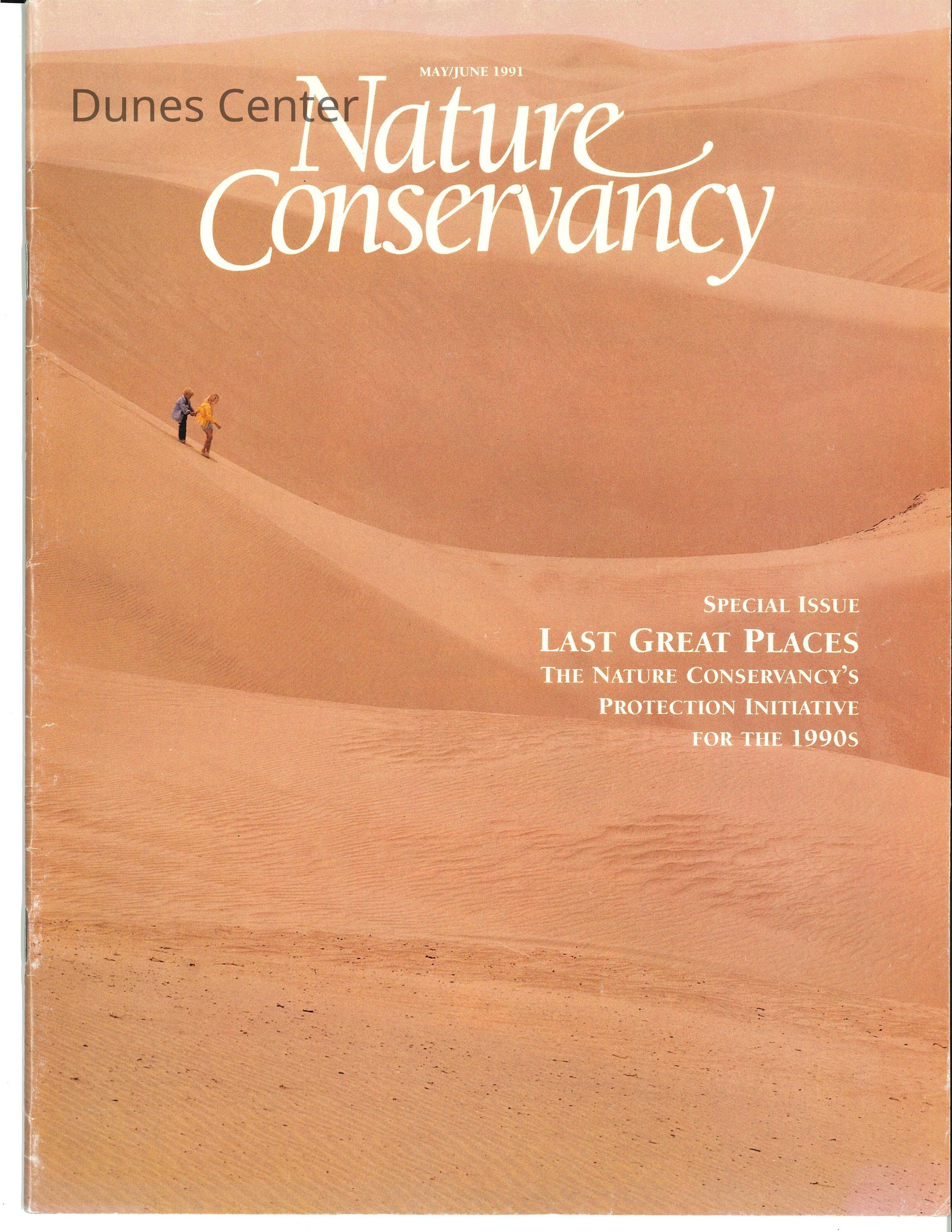 May/June 1991 special issue of the Nature Conservancy magazine focusing on an initiative called "Last Great Places: An Alliance for People and the Environment", features photo of the Nipomo Dunes on the cover. Photo of Kathleen Goddard-Jones on page 13. Article about The Ten Commandments and the set recovery effort on page 26. Article about the Nipomo Dunes on page 27, lists it is one of the first 12 natural systems selected for protection under the "Last Great Places" initiative.Collection