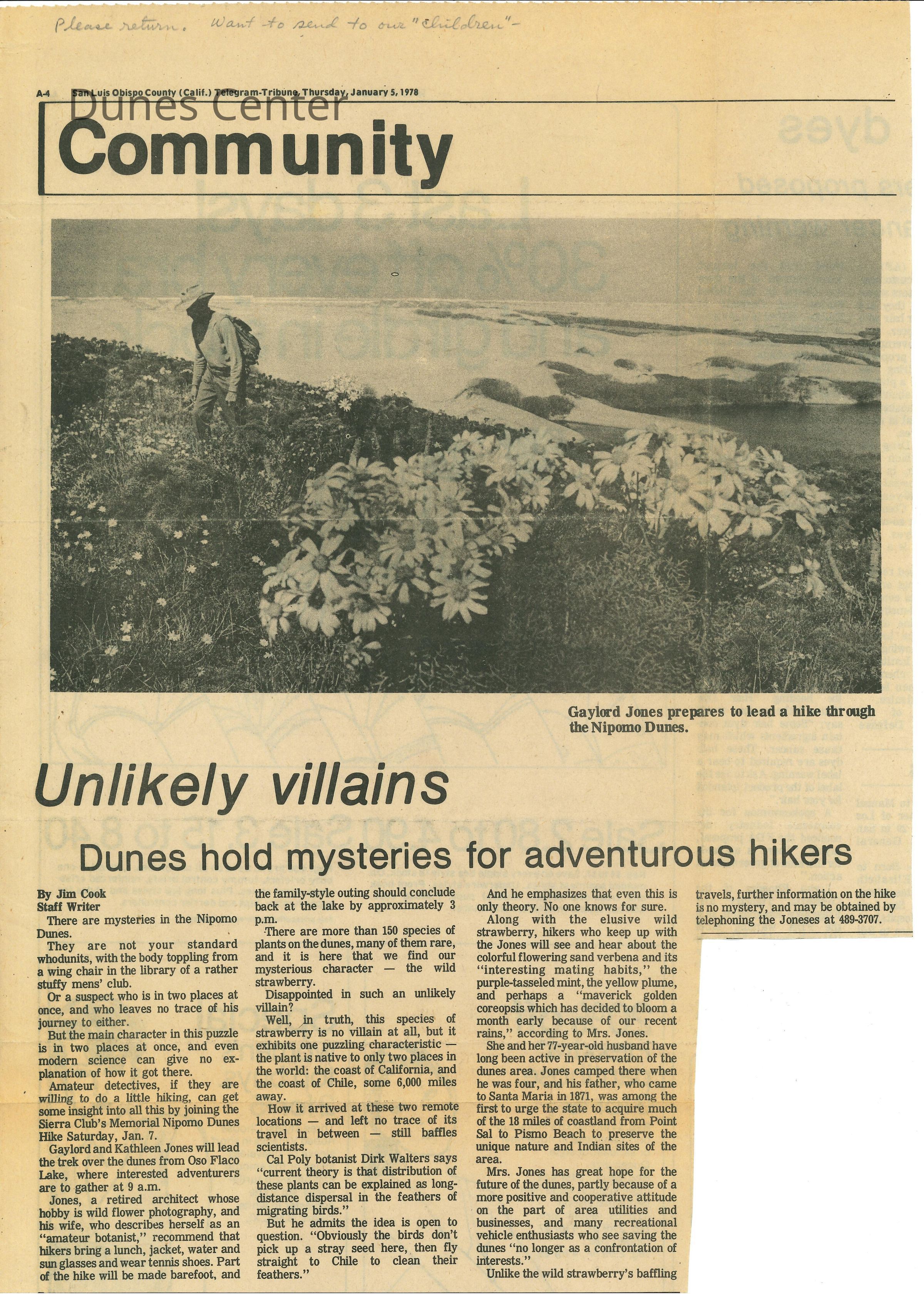 January 5, 1978, San Luis Obispo County Telegram-Tribune article titled "Unlikely Villains: Dunes Hold Mysteries for Adventure", provides information about a hike on the dunes being led by Kathleen and Gaylord Jones, talks about strawberries and other wildlife on the dunes, includes a photo of Gaylord Jones on the dunes.Collection