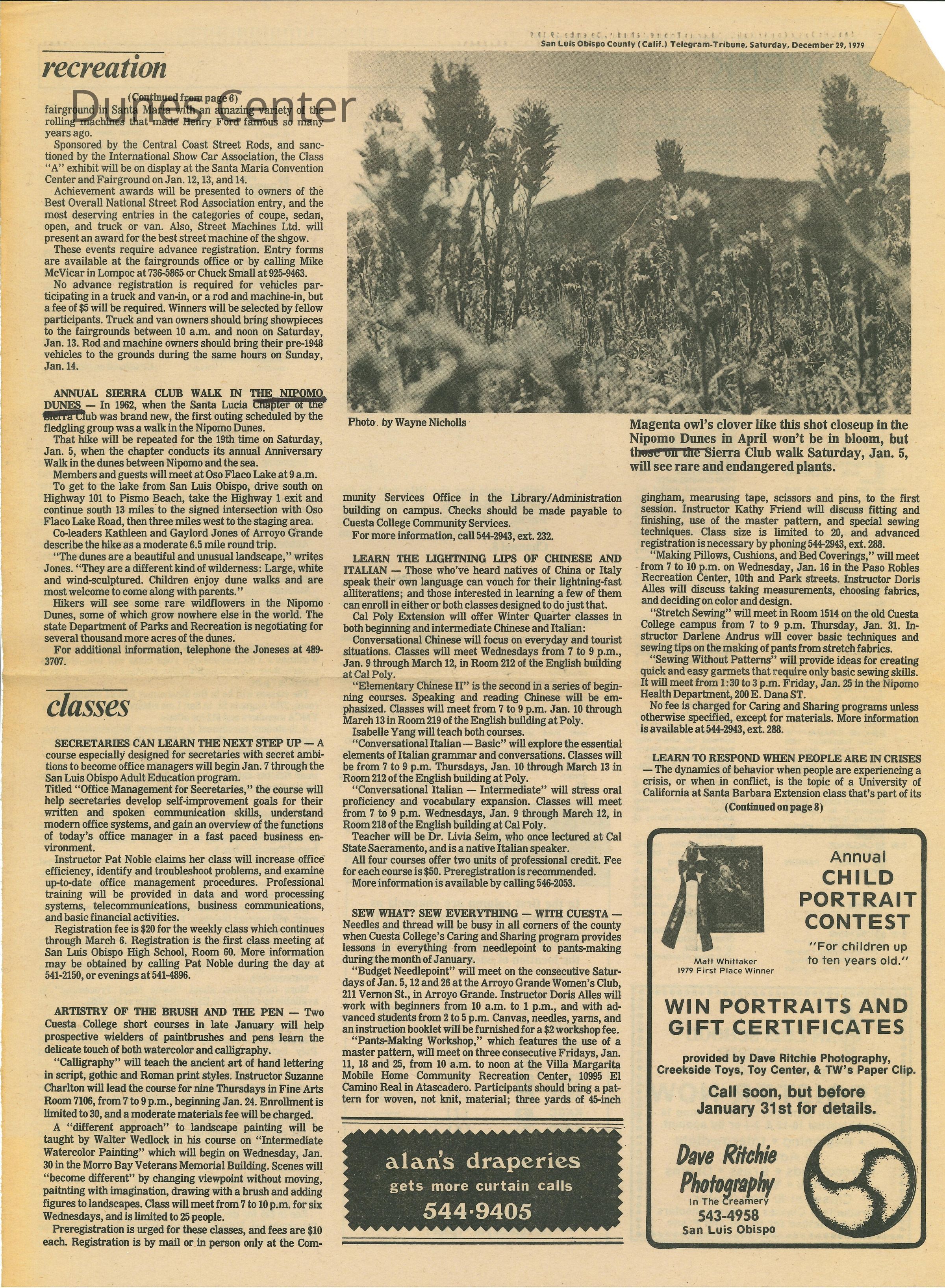 December 29, 1979, San Luis Obispo County Telegram-Tribune article titled "Annual Sierra Club Walk in the Nipomo Dunes", provides information about a planned dunes hike led by Kathleen and Gaylord Jones, includes a photo of magenta owl's clover on the dunesCollection