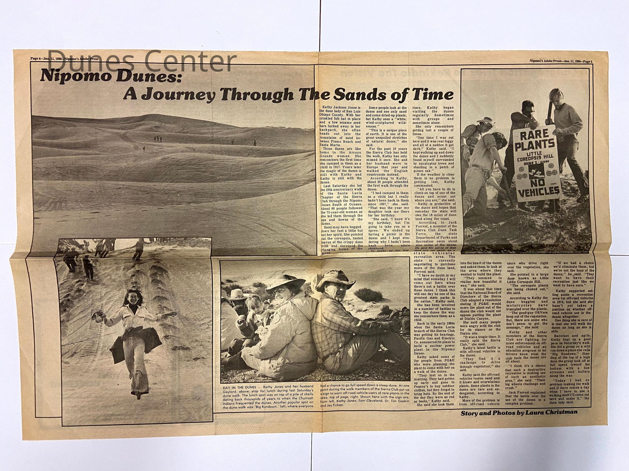January 11, 1980, Nipomo's Adobe Press article titled "Nipomo Dunes: A Journey Through the Sands of Time", interviews Kathleen Goddard-Jones about the landscape of the dunes and the threats posed to it by off-road vehicles, includes photos of Kathleen and Gaylord Jones and the dunesCollection