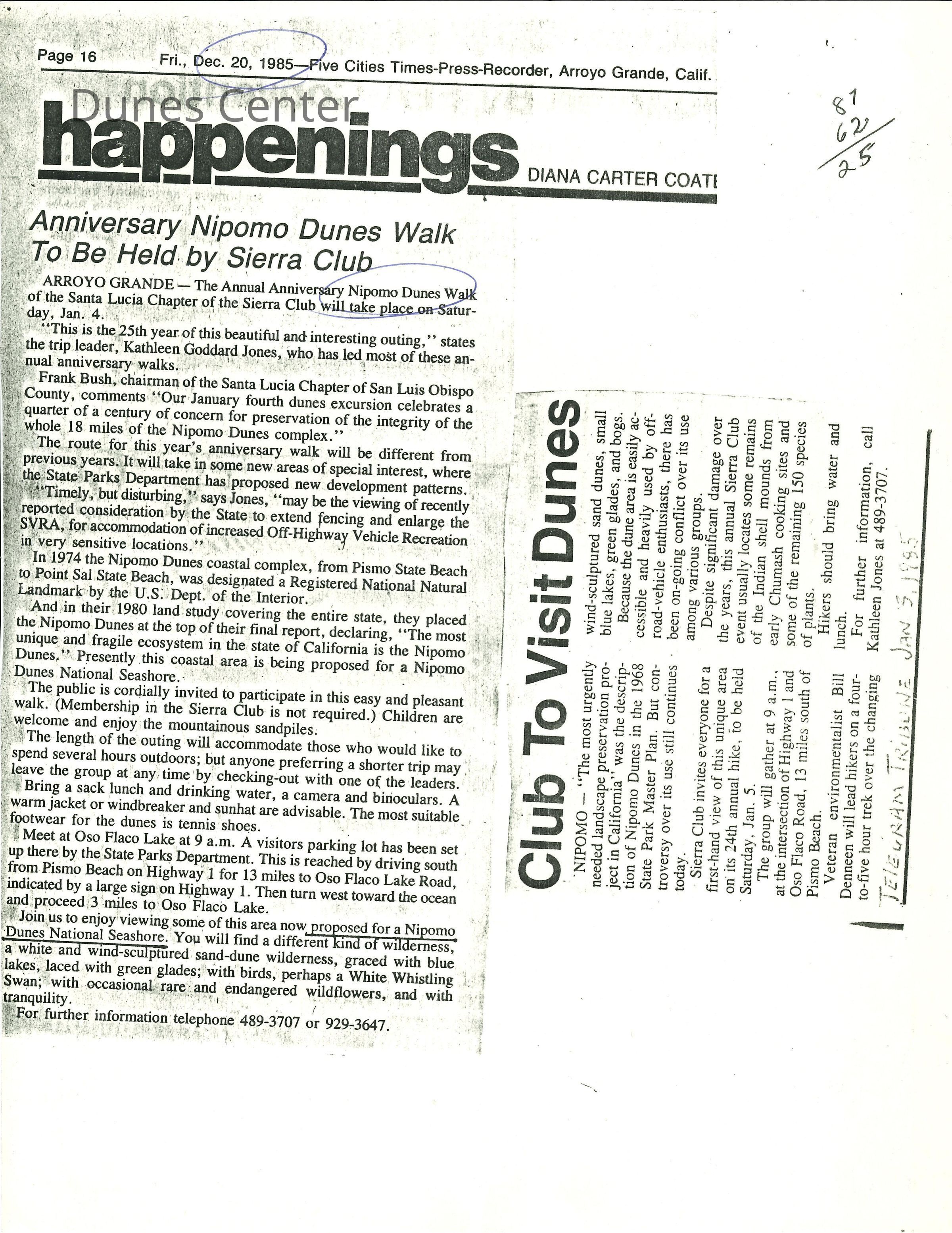 December 20, 1985, Five Cities Times-Press-Recorder article titled "Anniversary Nipomo Dunes Walk To Be Held by Sierra Club, provides information about and directions to the Annual Anniversary Nipomo Dunes Walk led by Kathleen Goddard-JonesCollection