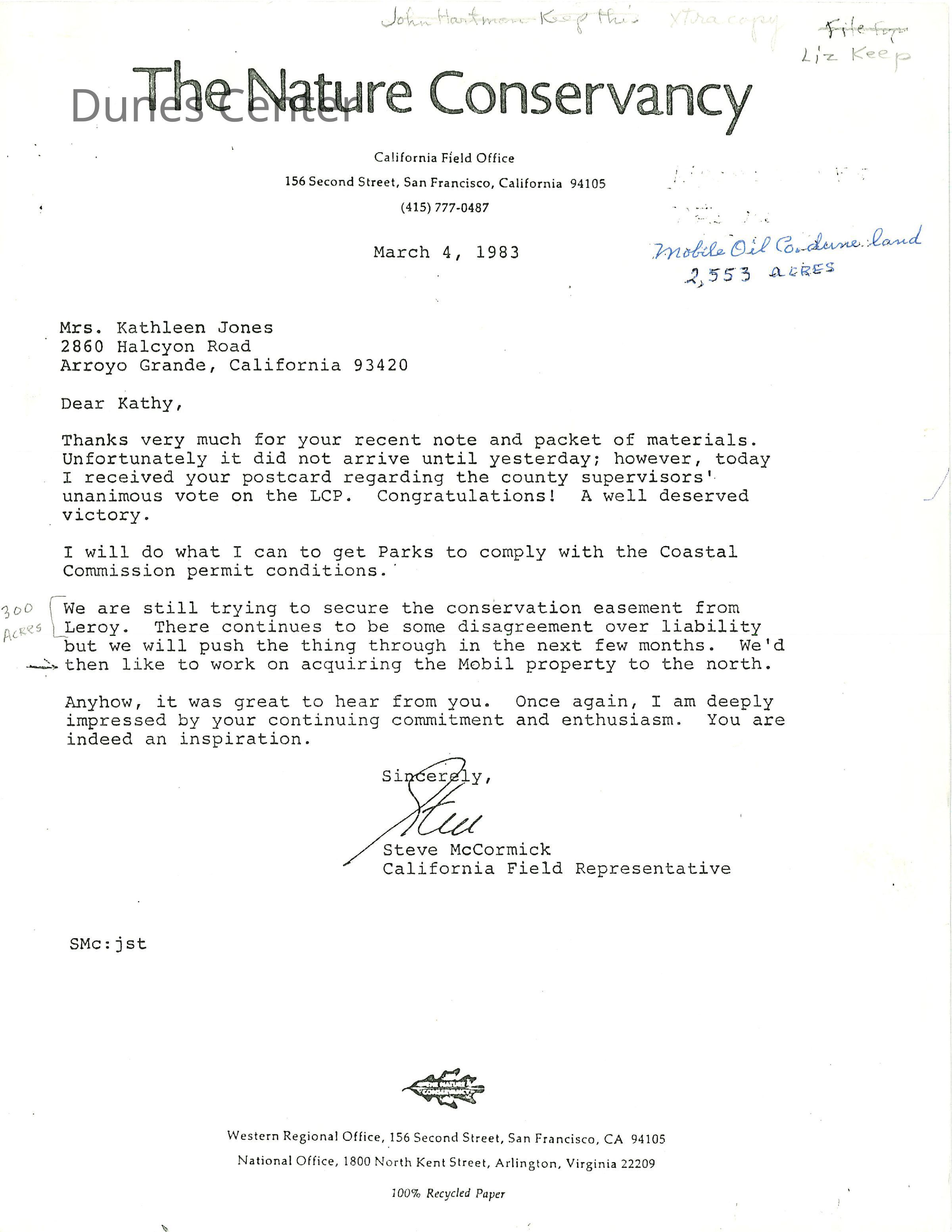 March 4, 1983, Letter from Steve McCormick of The Nature Conservancy to Kathleen Goddard-Jones about the Nature Conservancy's attempts to acquire the Dunes land, including the Mobil Oil property.