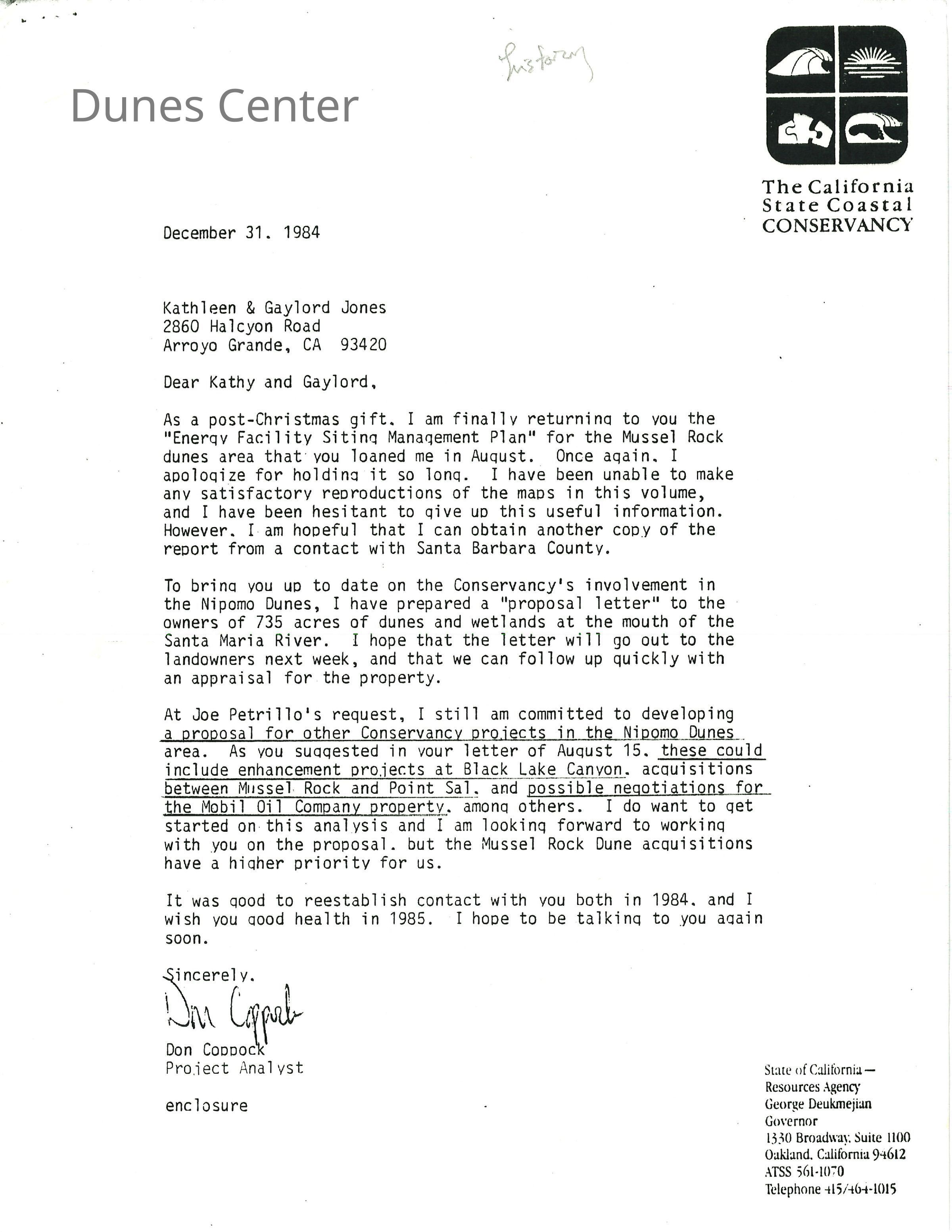 December 31, 1984, letter from Don Coppock of the California State Coastal Conservancy to Kathleen & Gaylord Jones discussing the development of a proposal for future Conservancy projects in the Nipomo Dunes