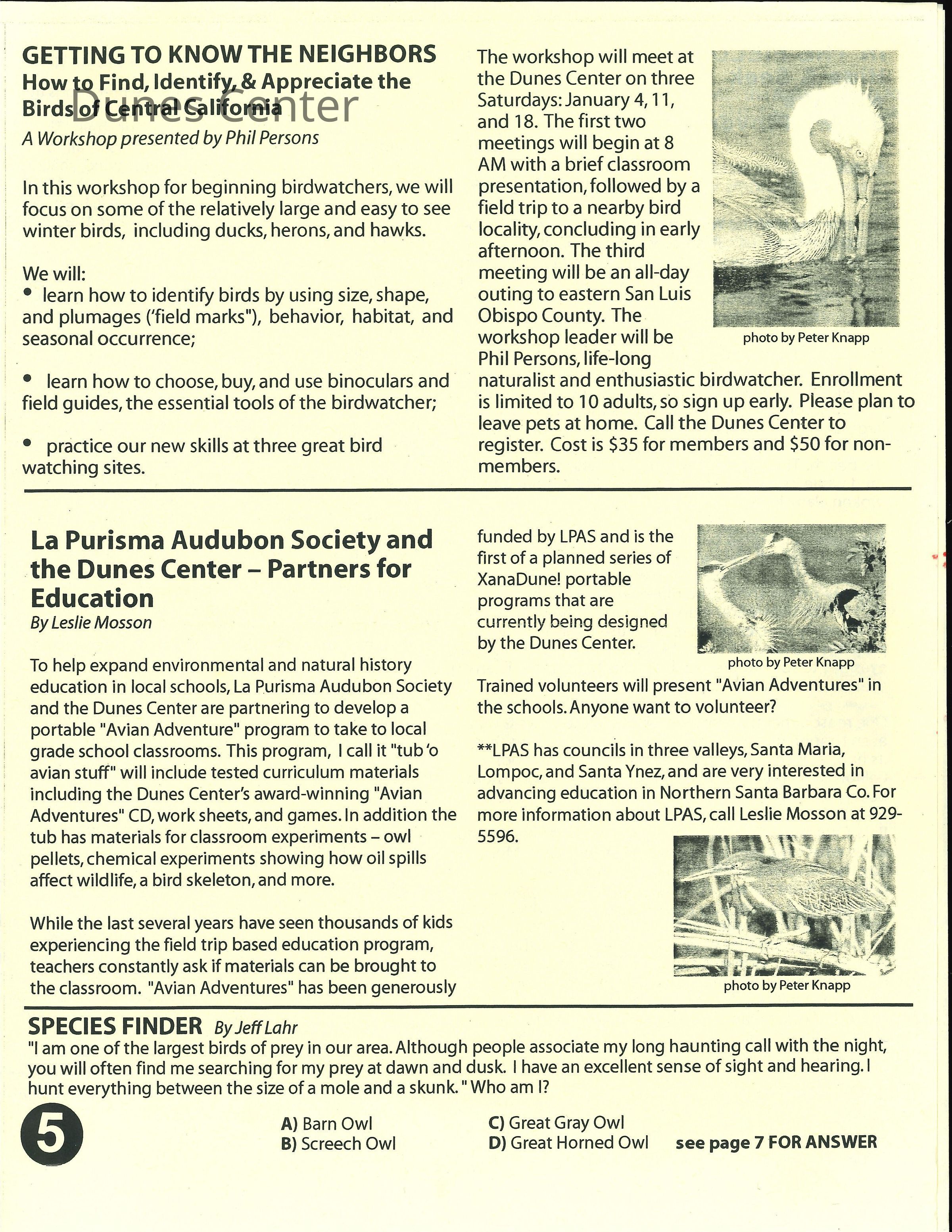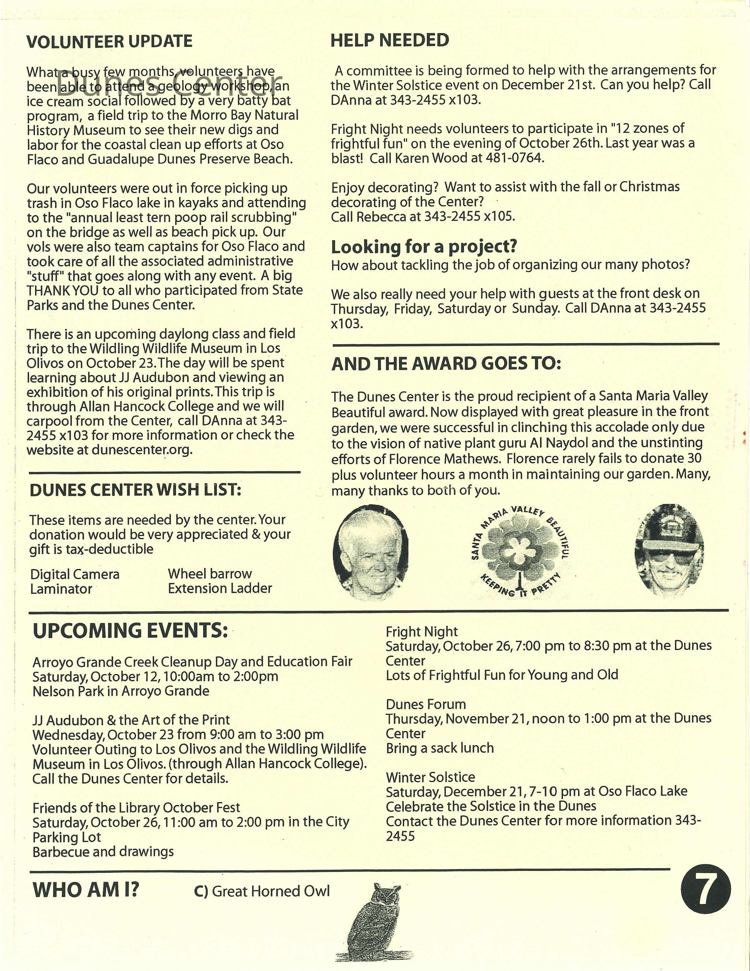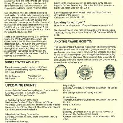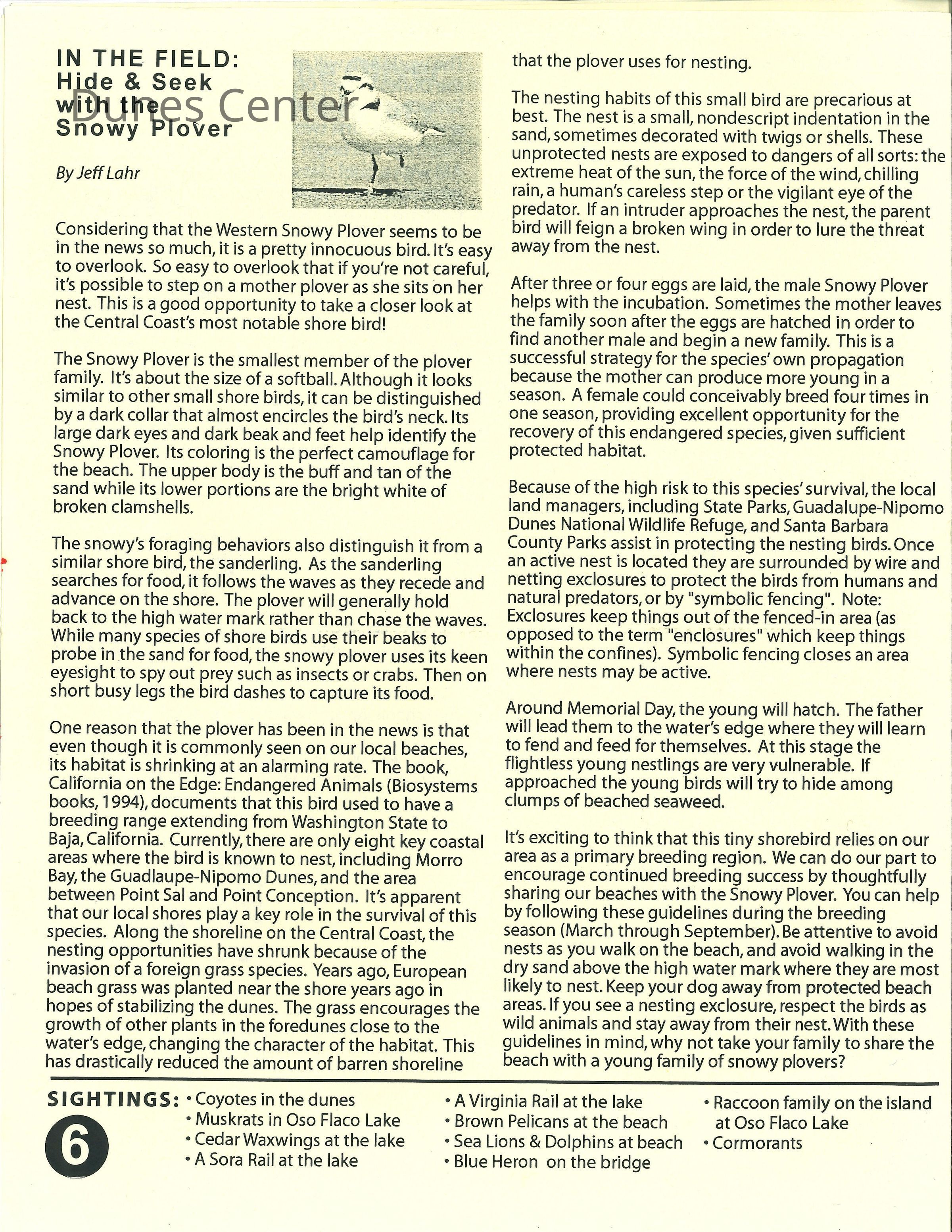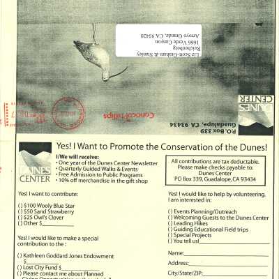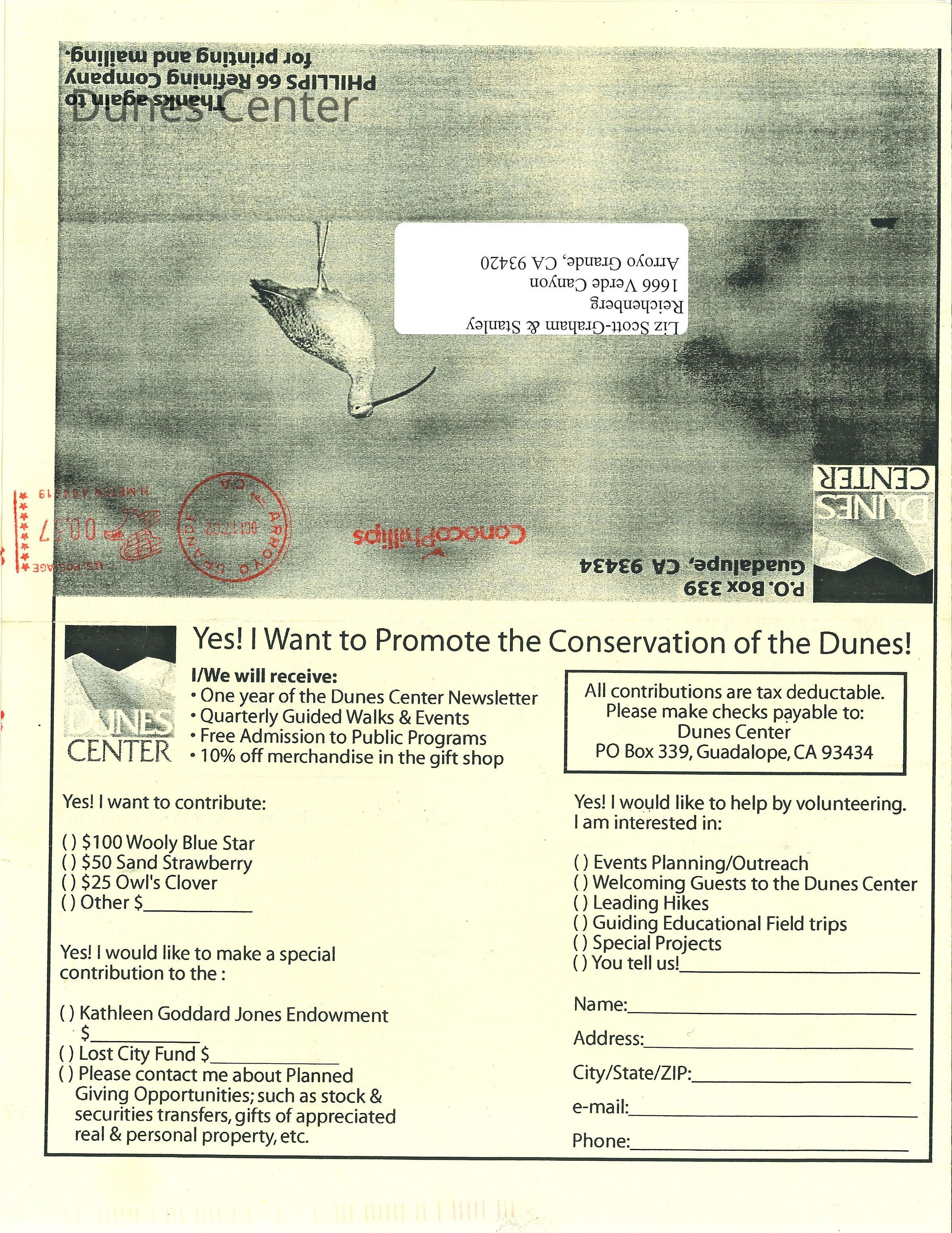Fall 2002 edition of Dunes Center News, includes articles about the Snowy Plover, Kathleen Goddard-Jones, and other Dunes Center ongoings, addressed to Elizabeth Scott-GrahamCollection