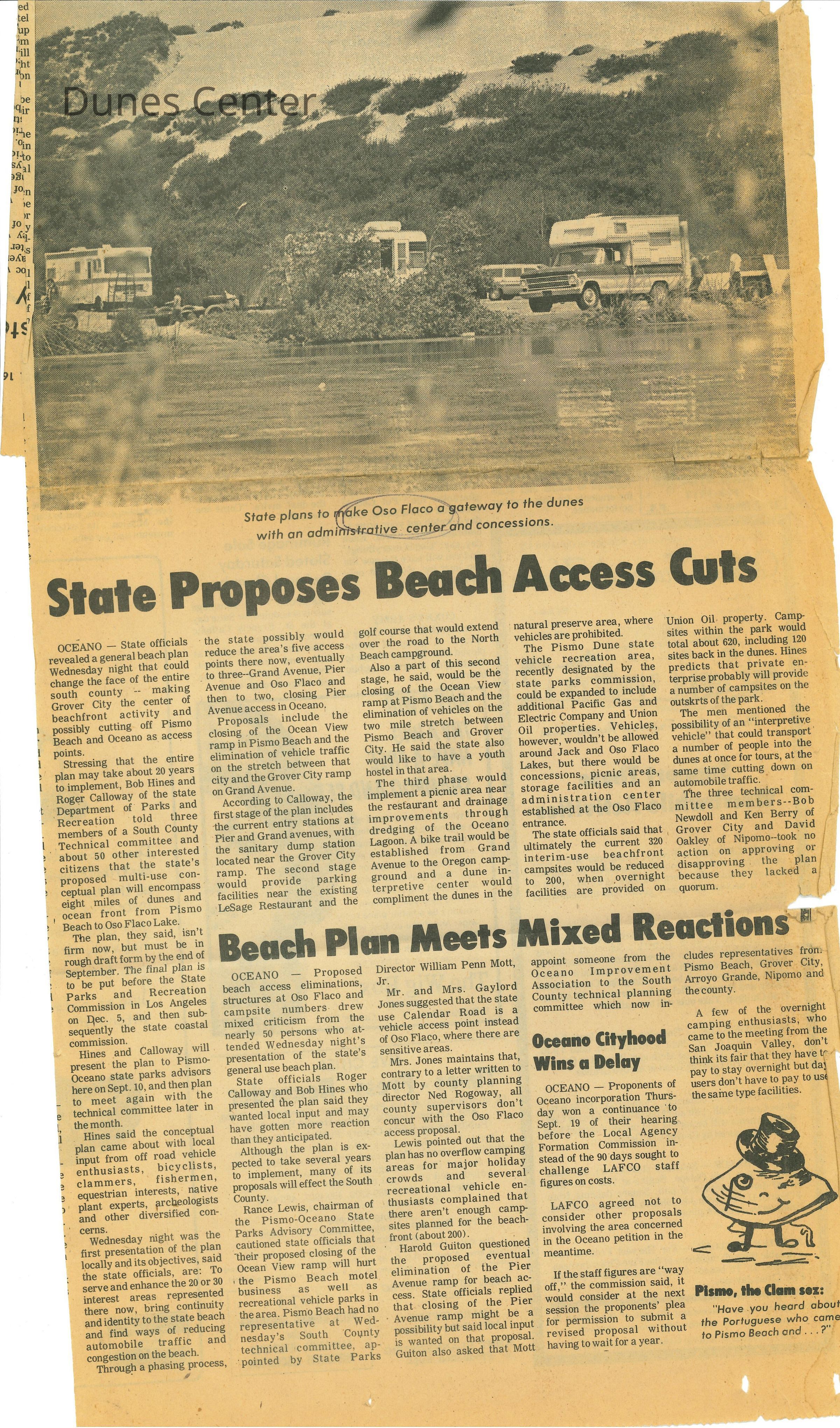 August 16, 1974, Five Cities Times-Press-Recorder article titled "State Proposes Beach Access Cuts", covers dunes access and interviews Kathleen Goddard Jones about the dangers of an access point at Oso Flaco, includes photoCollection