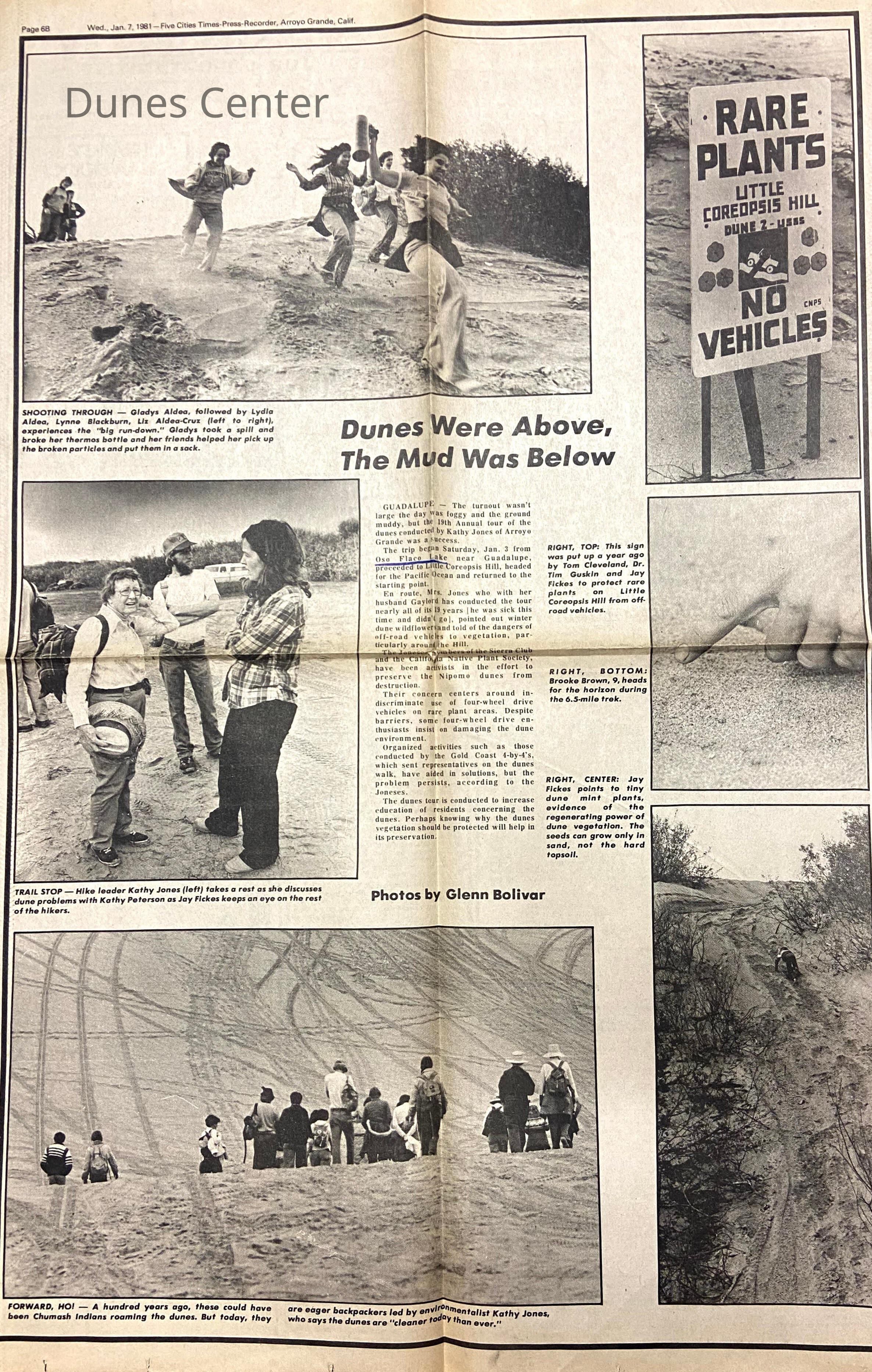January 7, 1981, Five Cities Times-Press-Recorder article titled "Dunes Were Above, The Mud Was Below", covers the annual hike on the dunes done by Kathleen Goddard-Jones, includes photos.Collection
