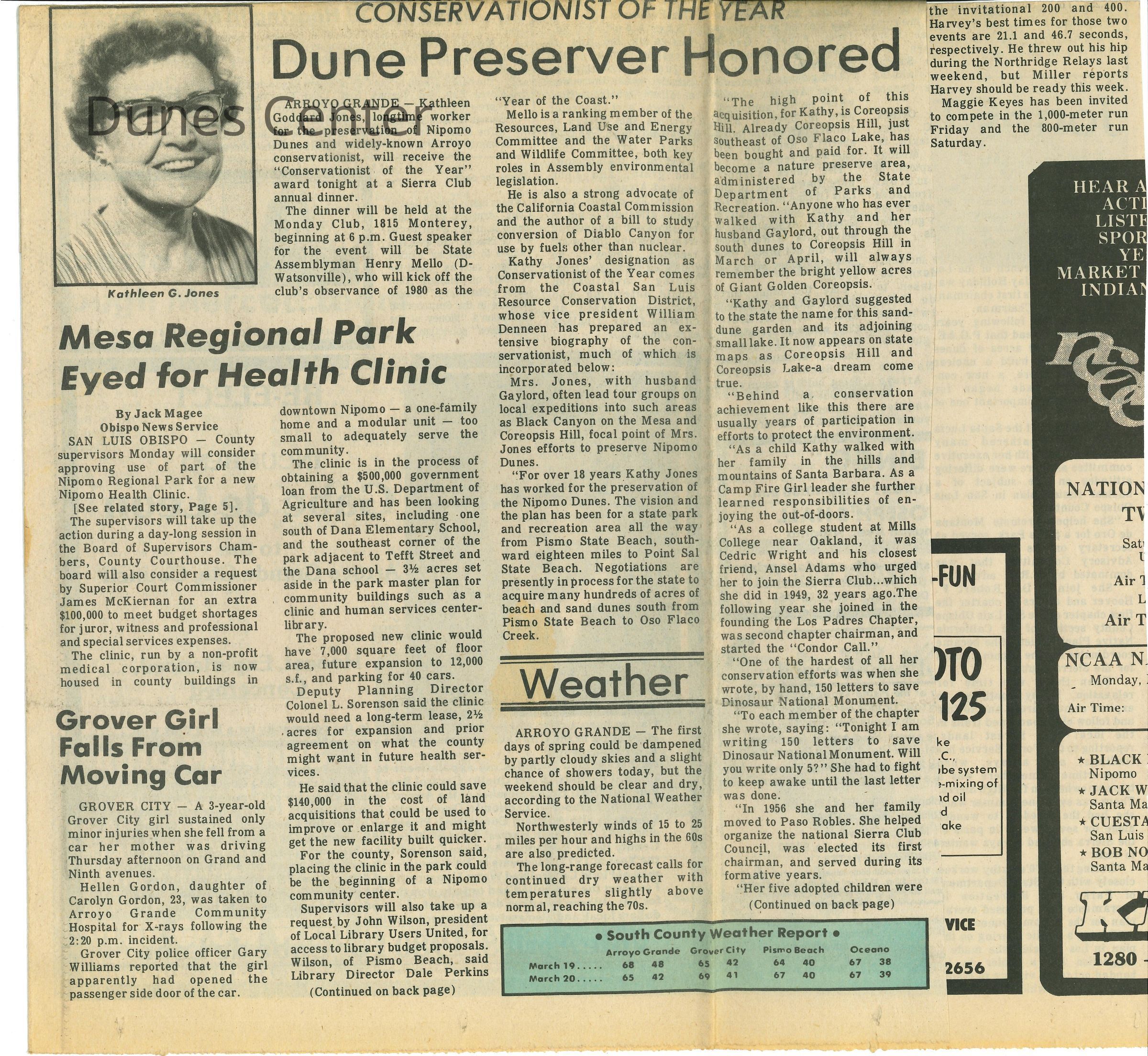 March 21, 1980, Five Cities Times-Press-Recorder article titled "Conservationist of the Year: Dunes Preserver Honored", covers Kathleen Goddard-Jones being awarded the "Conservationist of the Year" award at a Sierra Club annual dinner. Includes description of work done by Kathleen Goddard-Jones on the dunes. Includes a photo of Kathleen Goddard-Jones.Collection