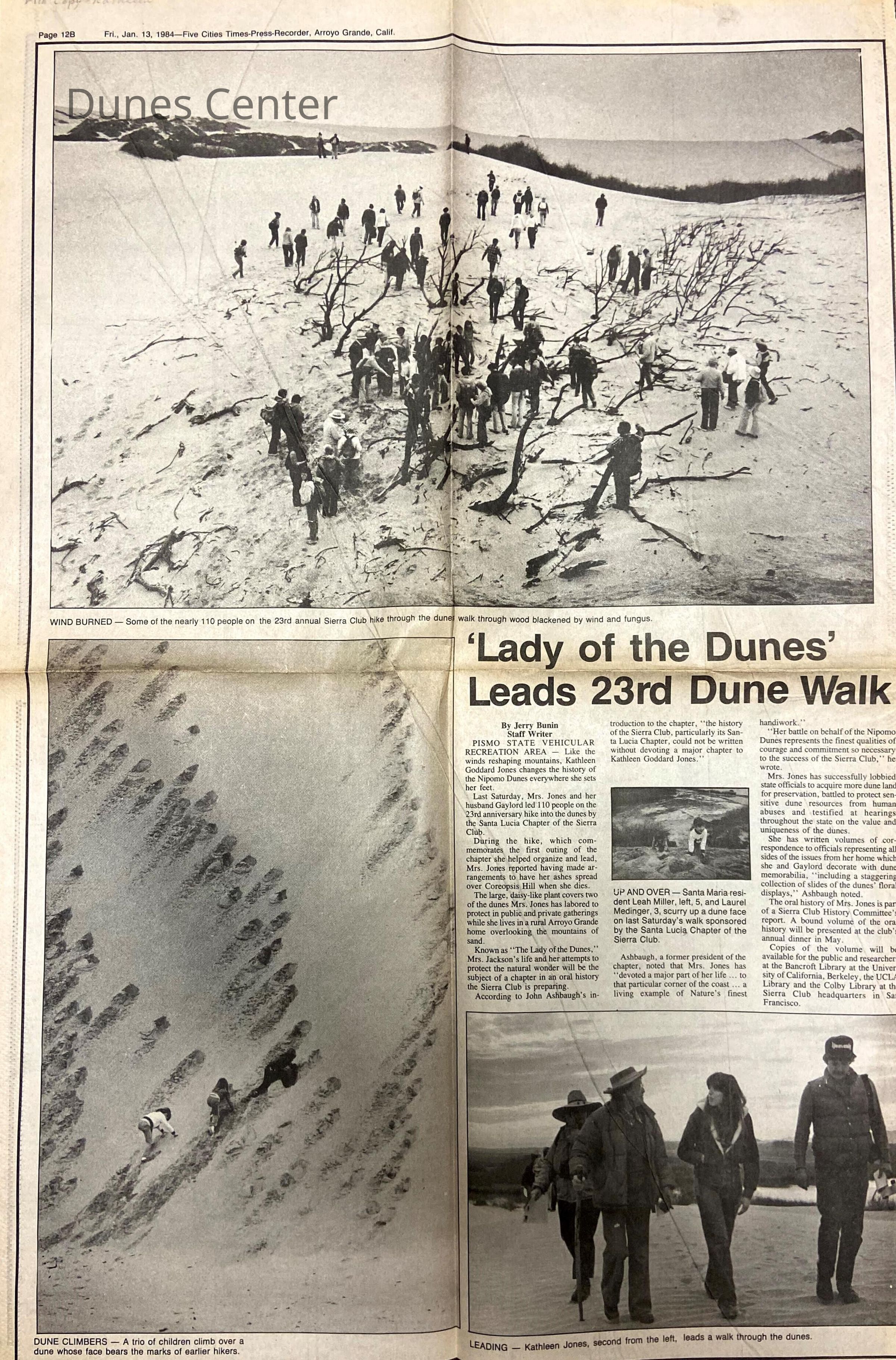 January 13, 1984, Five Cities Times-Press-Recorder article titled "'Lady of the Dunes' Leads 23rd Dune Walk", covers a dunes hike led by Kathleen Goddard Jones, includes photos of Kathleen Goddard-Jones and hikers.Collection