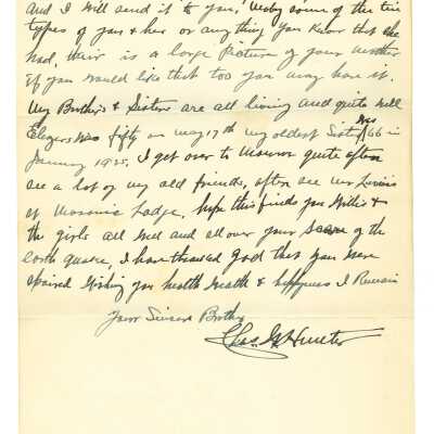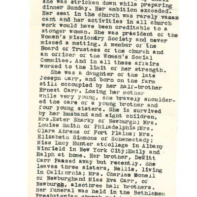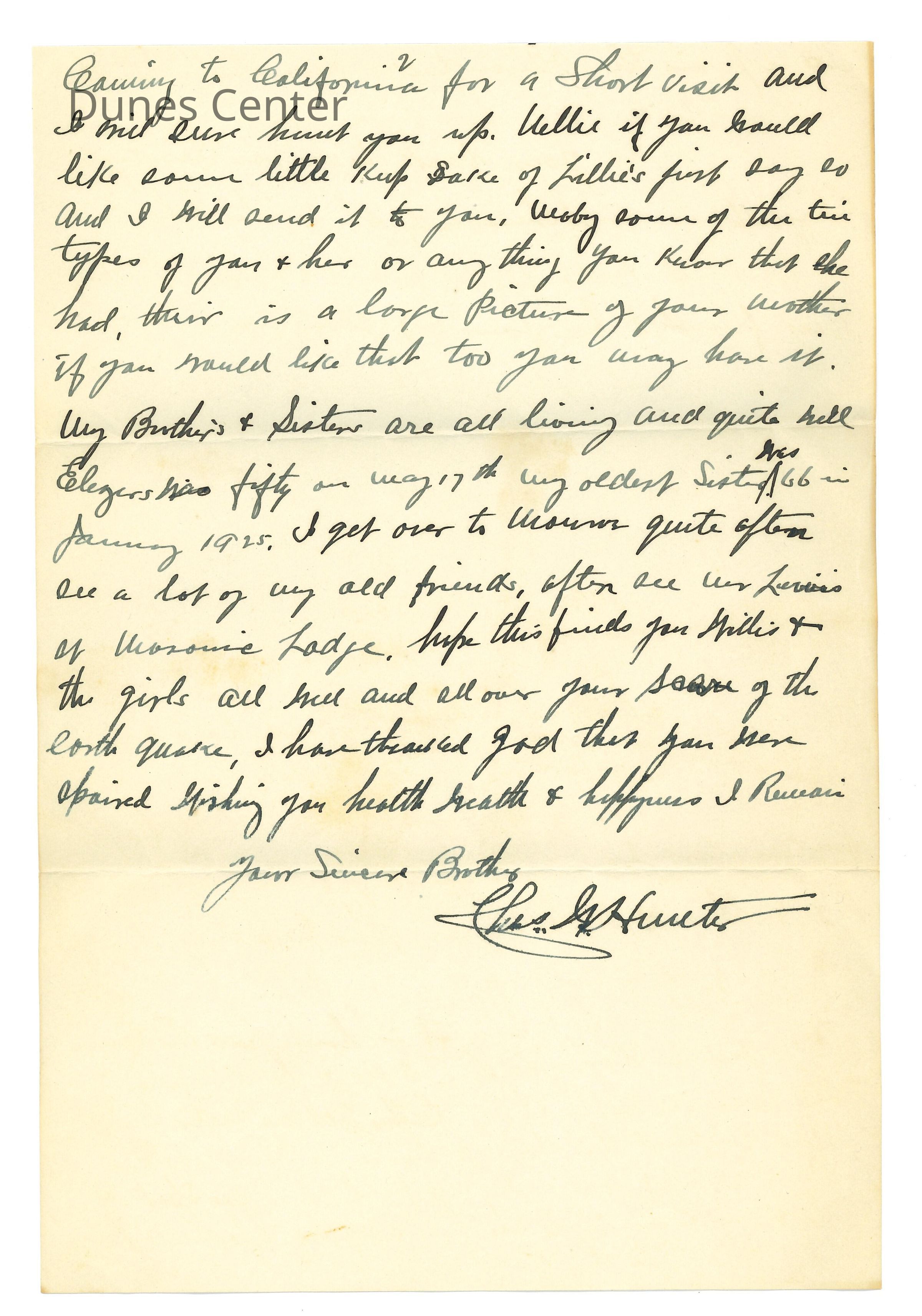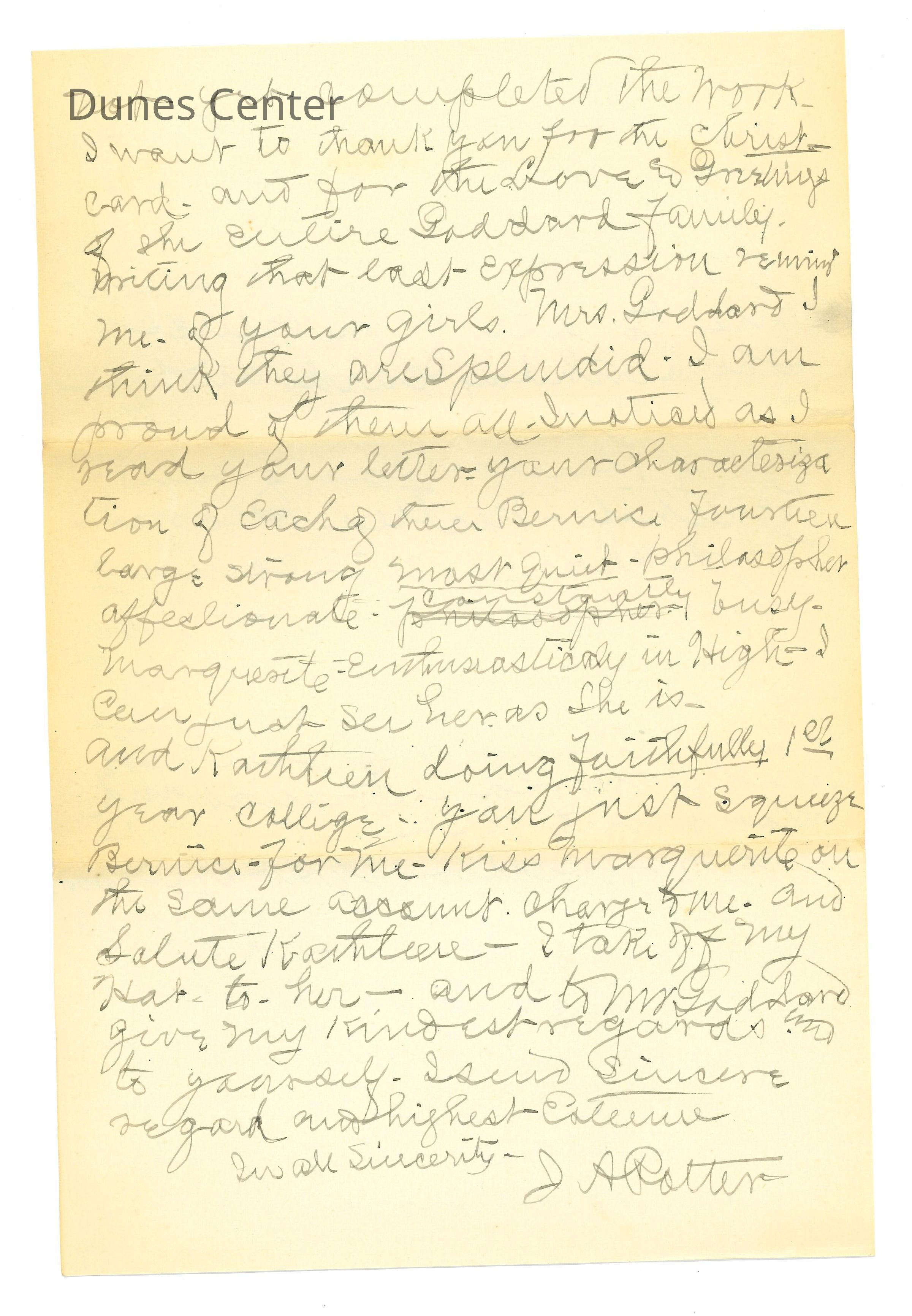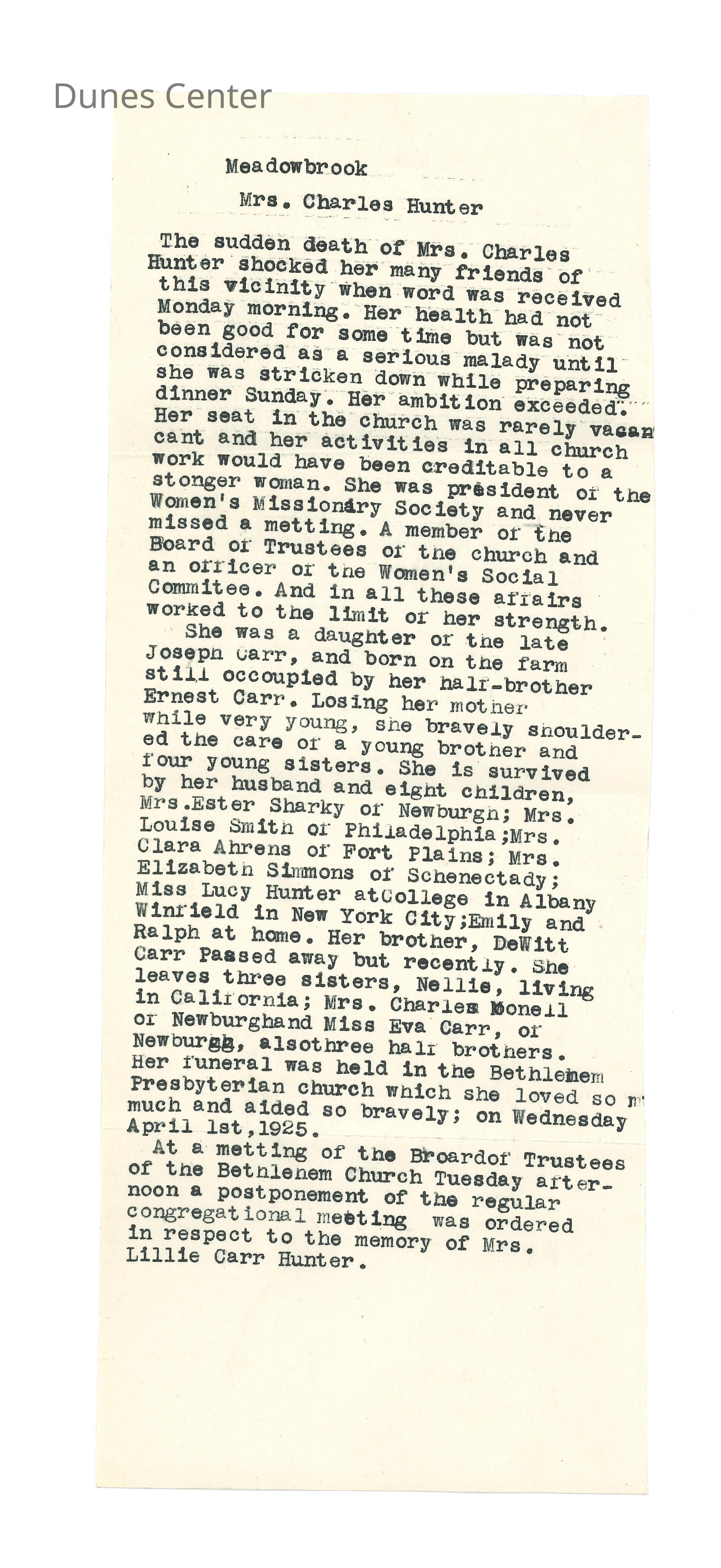 July 4, 1925, Letter to Mrs.Nellie Goddard from her sister Mrs. Charles Hunter (Lillie Carr-Hunter); Typed obituary for Mrs. Charles Hunter after her sudden death; December 30 1929, Letter to Mrs. Goddard from J.A. Potter