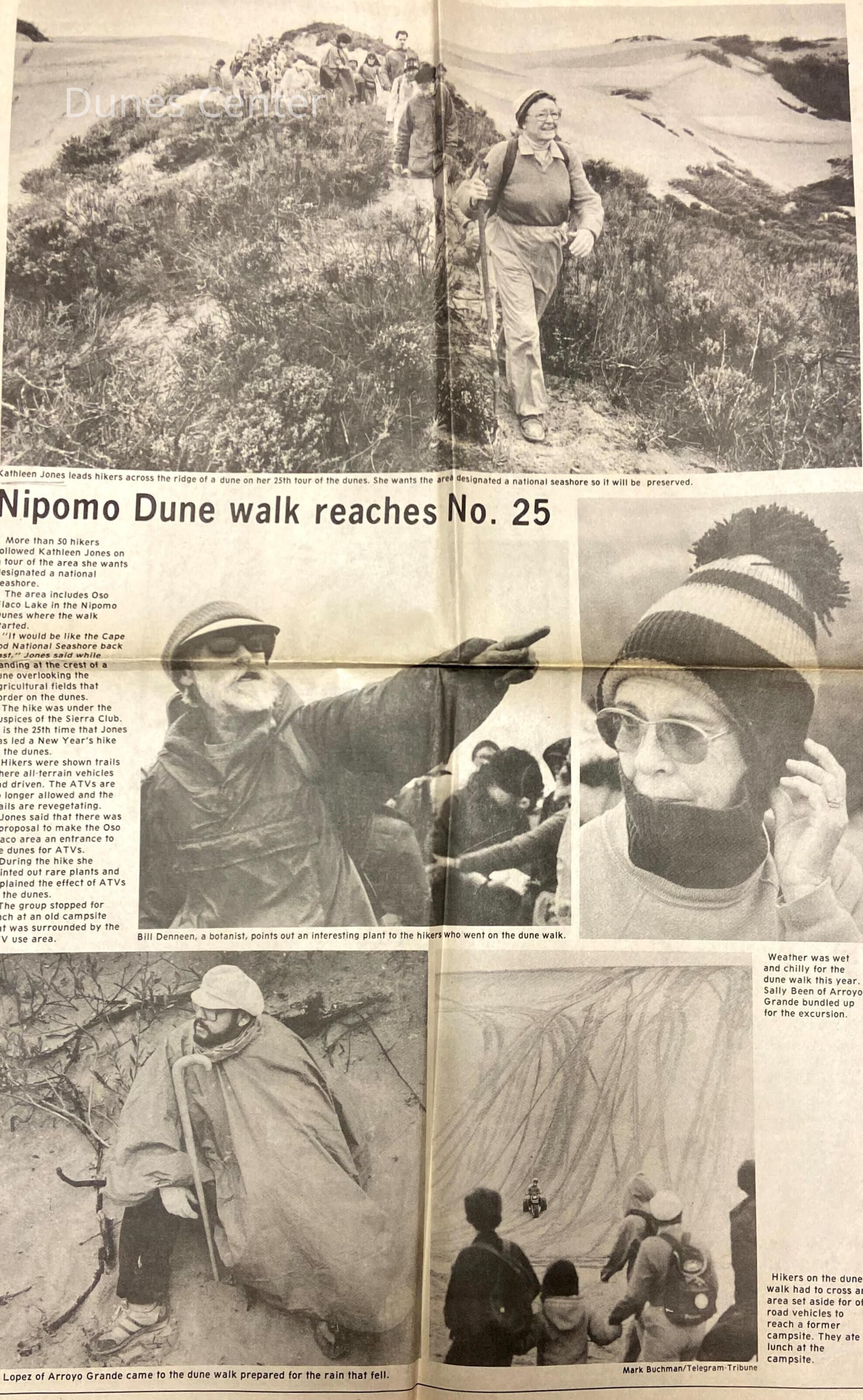 January 9, 1986, South County Tribune article titled "Nipomo Dune walk reaches No. 25", covers the 25th annual Sierra Club dunes hike, led by Kathleen Goddard-Jones. Includes photos of hikers, Kathleen Goddard-Jones, and Bill Denneen.Collection