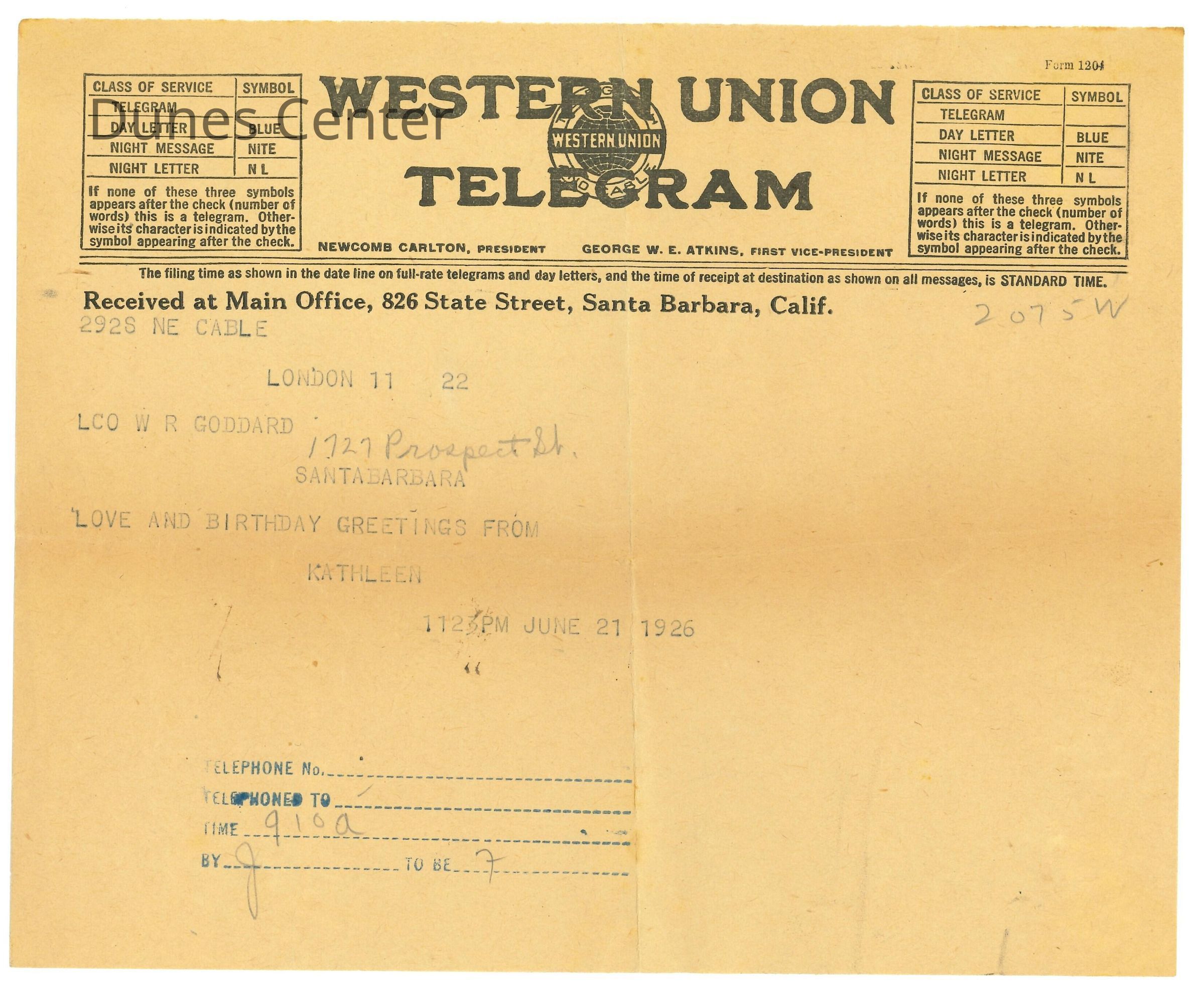 Western Union Telegraph, birthday greeting from Kathleen Goddard to W.R. Goddard, June 21, 1926
