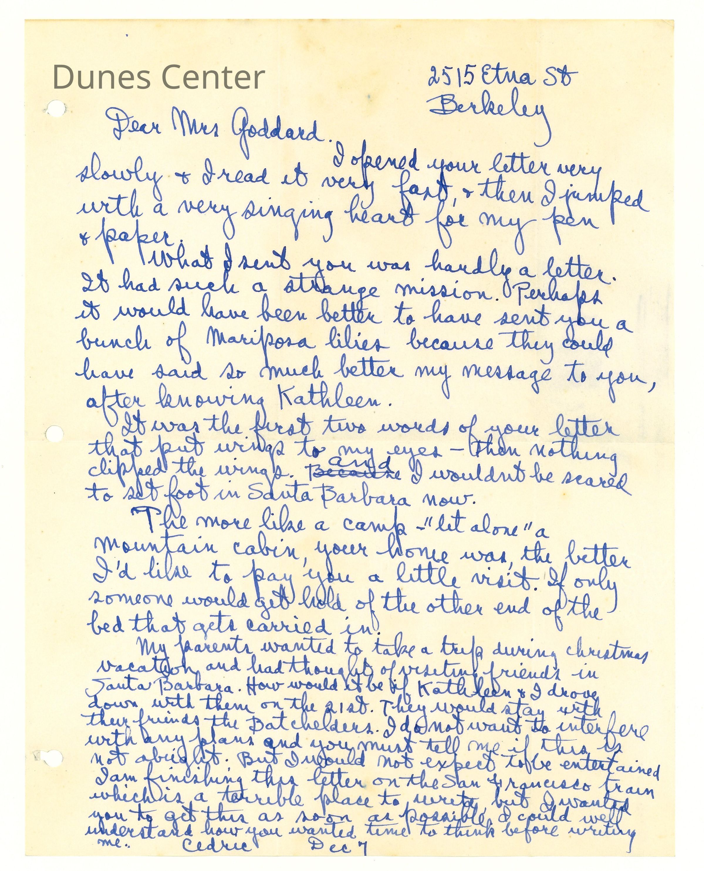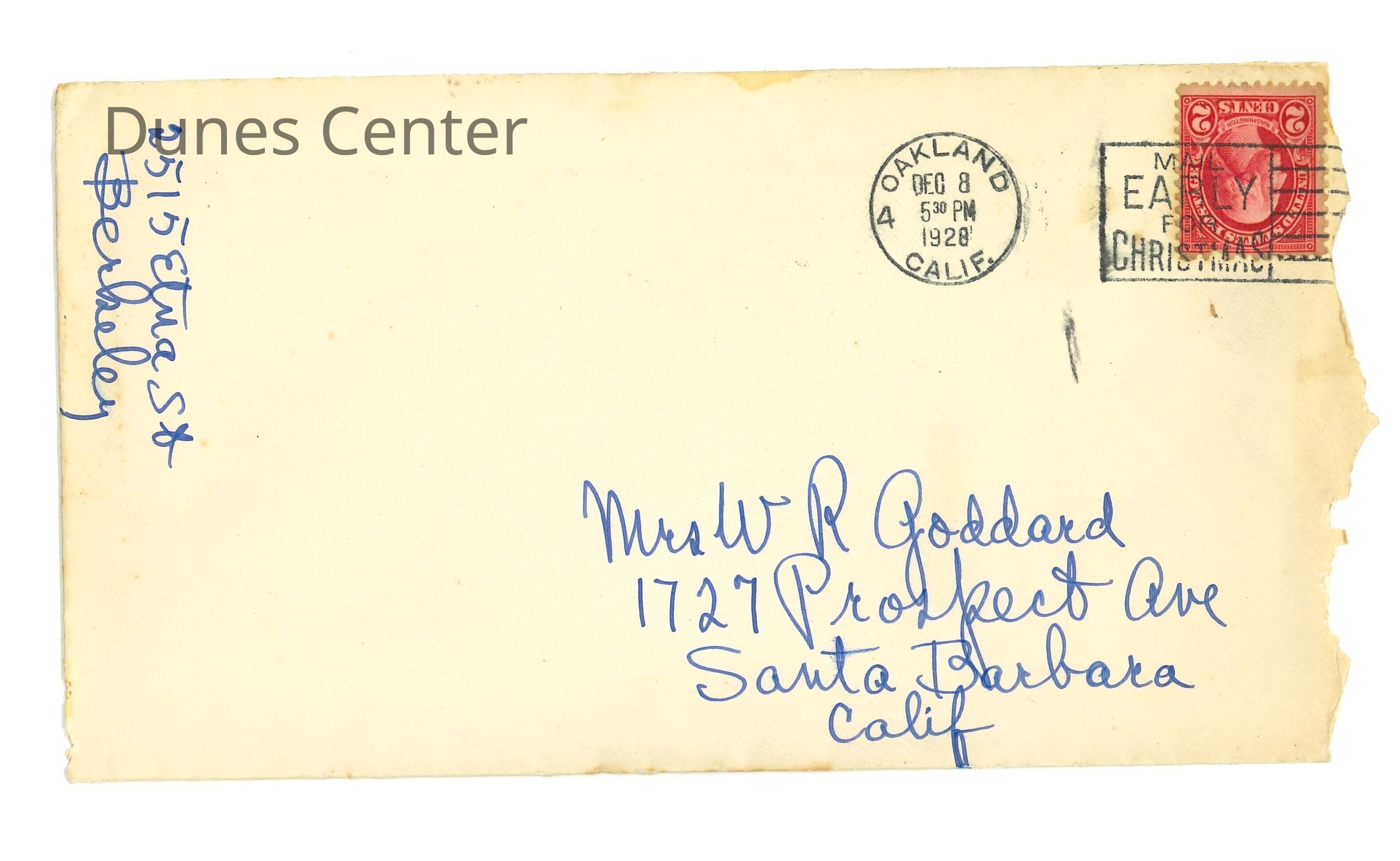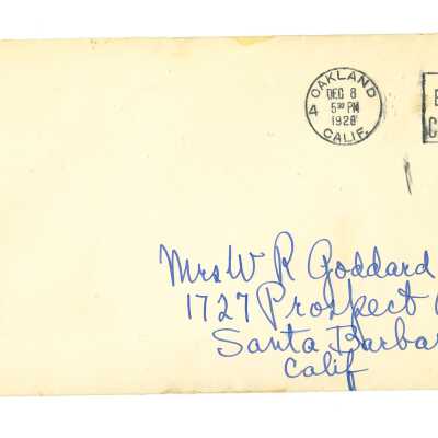 December 8, 1928, Personal Coorespondence from Cedric Wright to Mrs. Goddard, Berkeley, CA, letter about travels and mentions knowing Kathleen, envelope includedEntry/Object ID