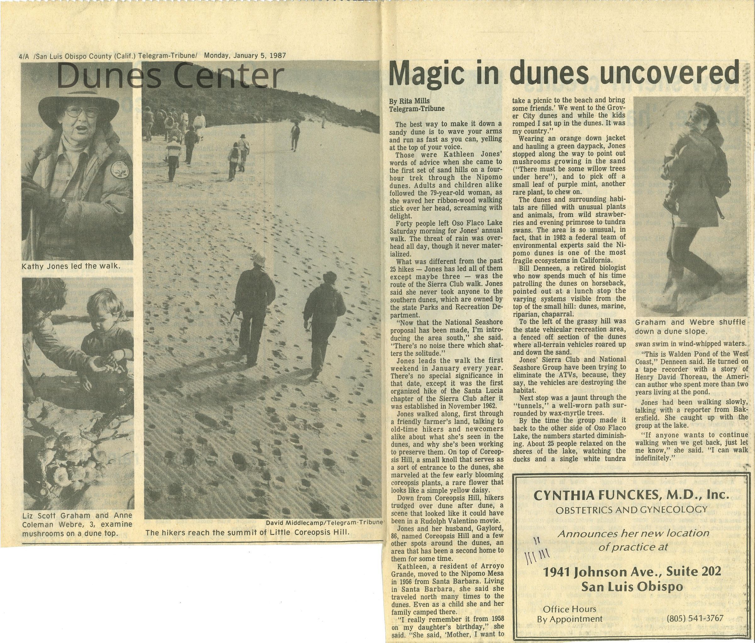 January 5, 1987, San Luis Obispo County Telegram-Tribune article titled "Magic in dunes uncovered", covers a dunes walk led by Kathleen Goddard Jones, includes photos of Kathleen Goddard-Jones and Elizabeth Scott Graham.Collection