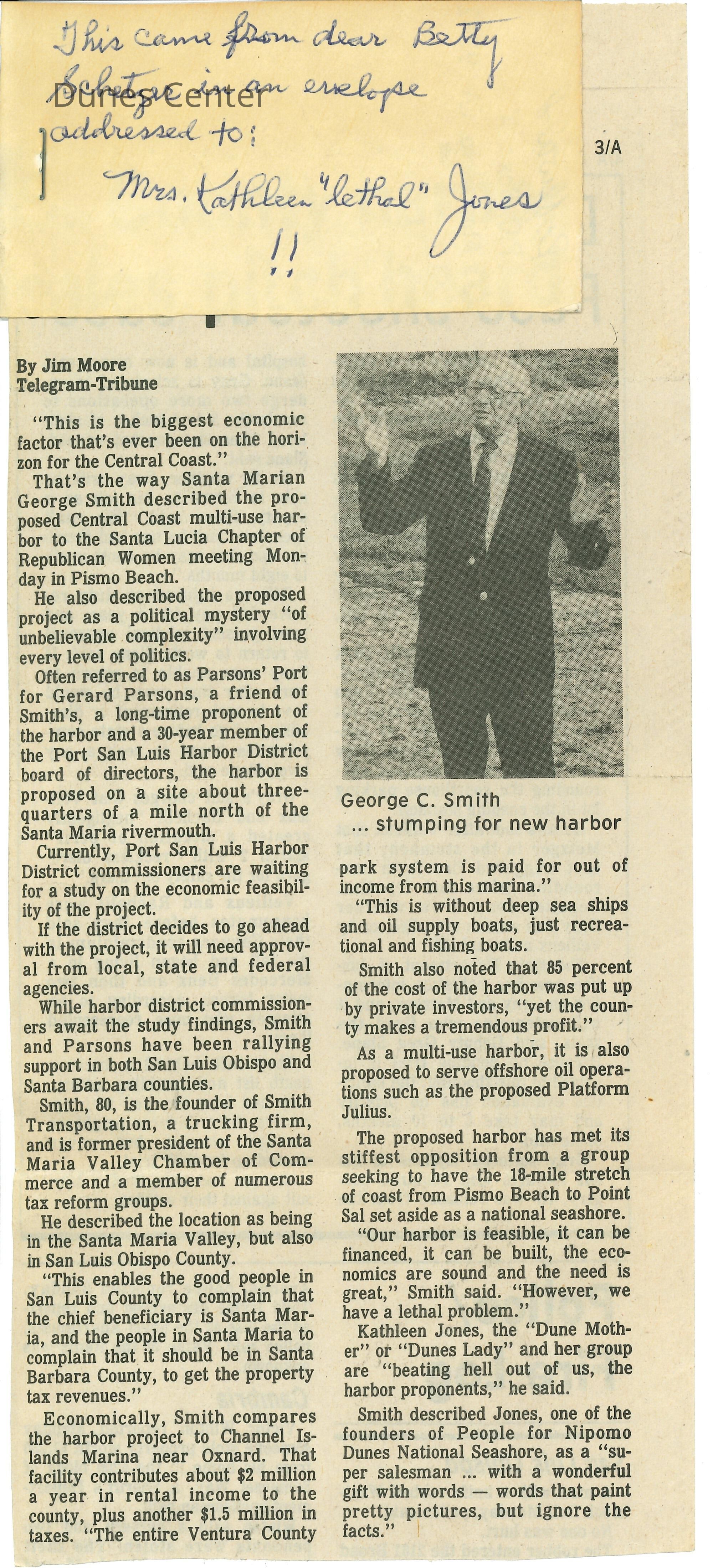 March 31, 1987, San Luis Obispo County Telegram-Tribune article titled "S. County harbor sales pitch heard", interviews George Smith about the proposed harbor project and mentions Kathleen Goddard-Jones' opposition to the harbor. Includes an attached note from Kathleen Goddard-Jones.Collection