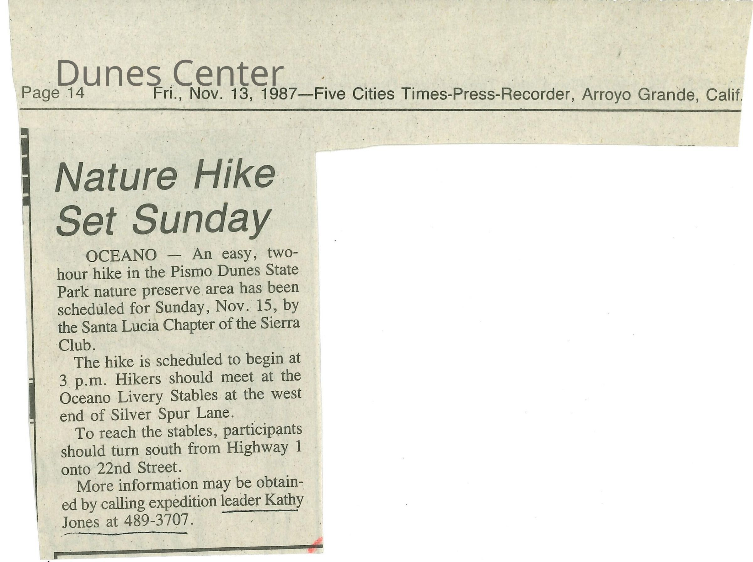 November 13, 1987, Five Cities Times-Press-Recorder article titled "Nature Hike Set Sunday", provides information about and directions to a dunes walk led by Kathleen Goddard-JonesCollection