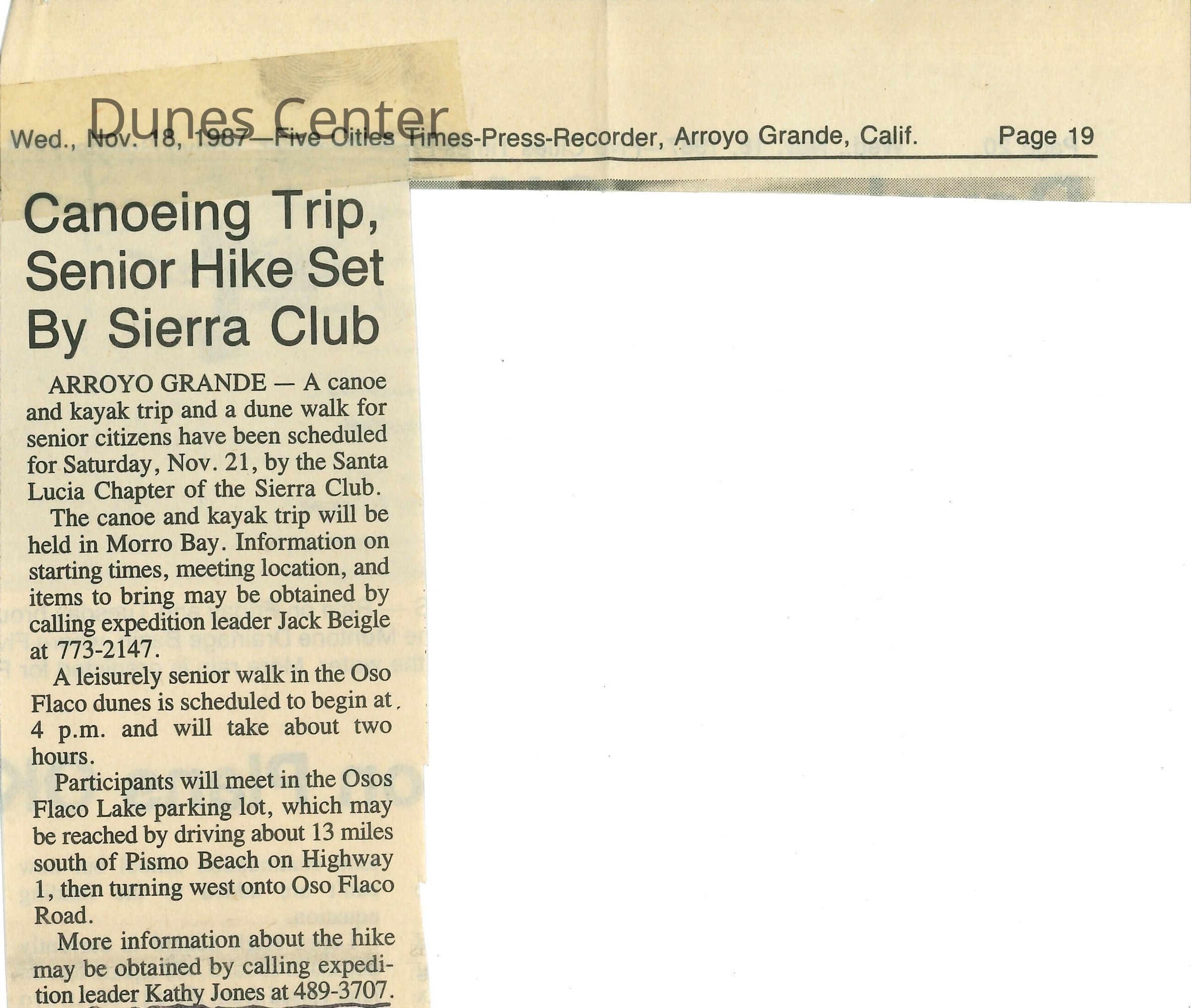 November 18, 1987, Five Cities Times-Press-Recorder article titled "Canoeing Trip, Senior Hike Set By Sierra Club", provides information about and directions to a dune walk led by Kathleen Goddard-Jones.Collection
