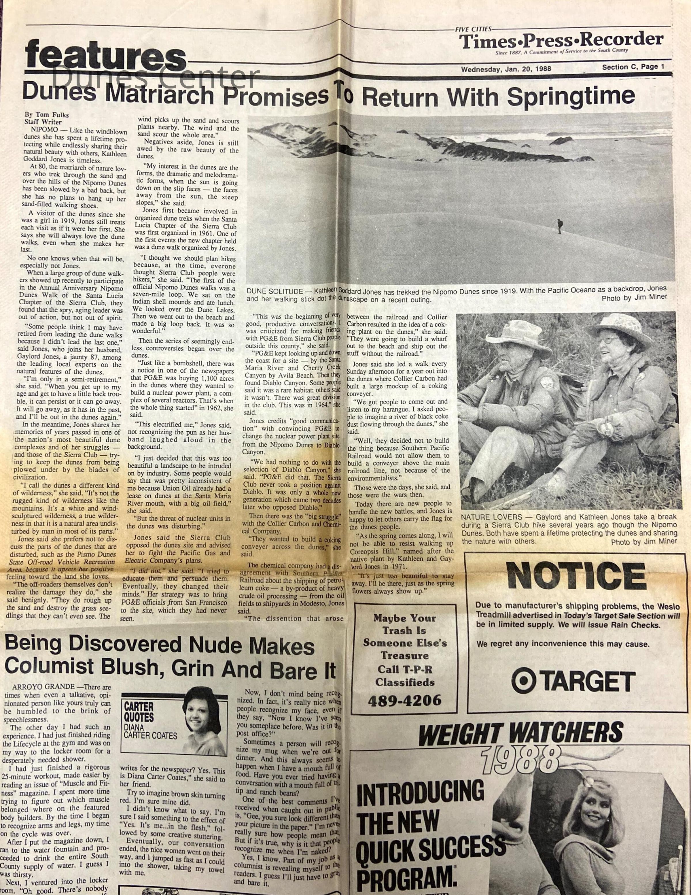 January 20, 1988, Five Cities Times-Press-Recorder article titled "Dunes Matriarch Promises To Return With Springtime", interviews Kathleen Goddard Jones about her fight to protect the dunes, includes photos.Collection