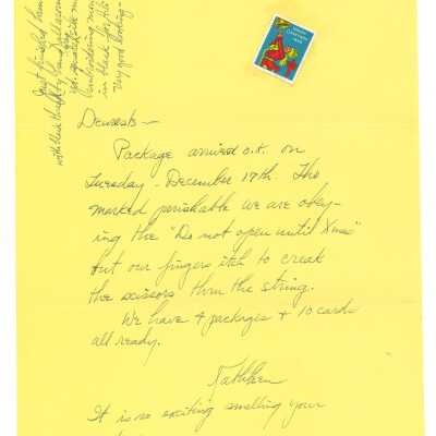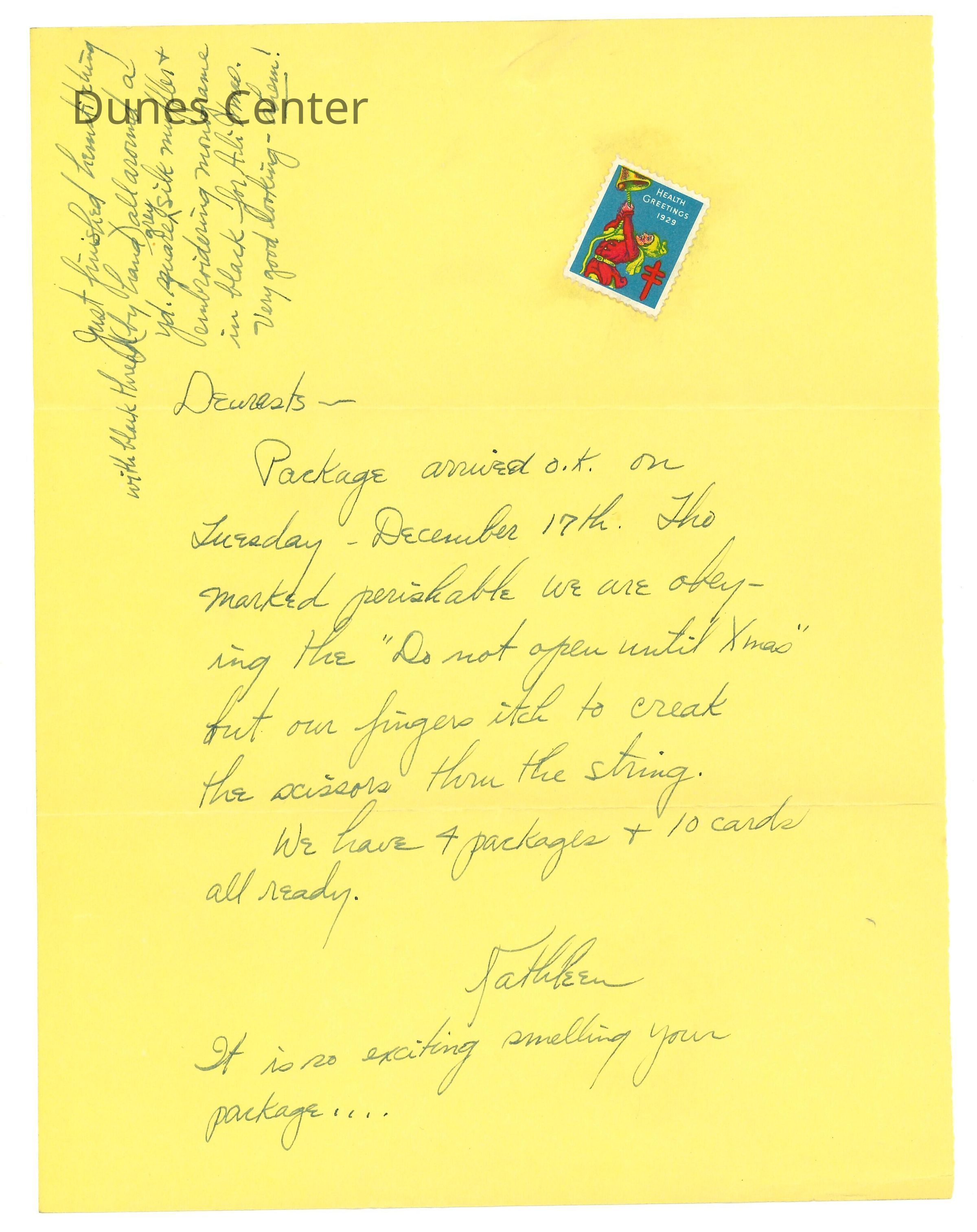 December 21, 1929, New York City, Letter from Kathleen Ali to W.R. Goddard & Family, letter confirming arrival of Christmas packages, envelope includedEntry/Object ID