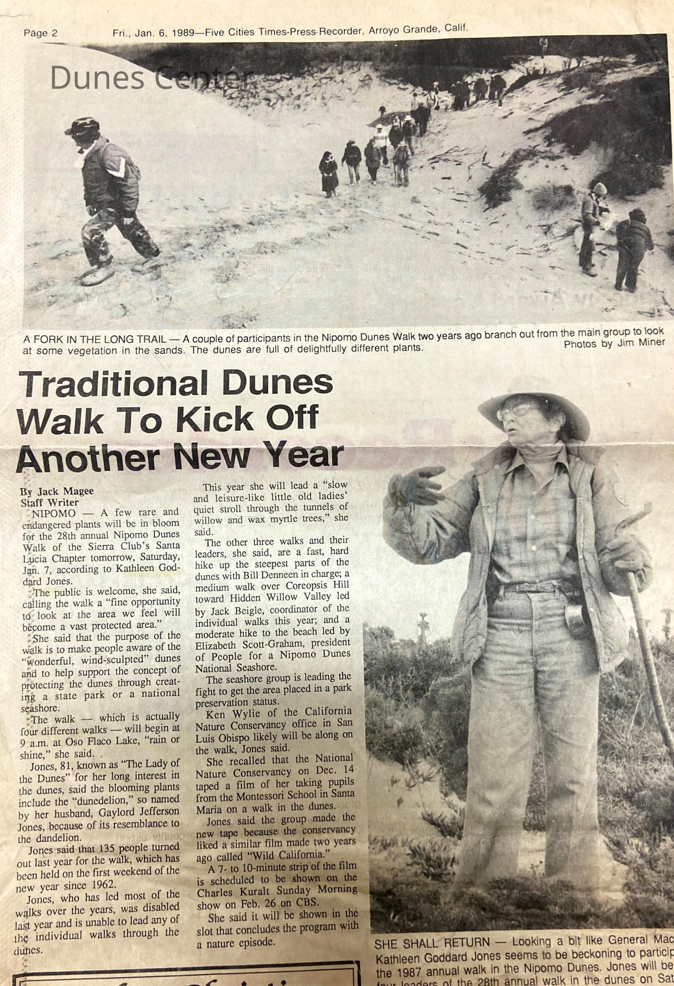 January 6, 1989, Five Cities Times-Press-Recorder article titled "Traditional Dunes Walk To Kick Off Another New Year", provides information about a planned walk on the dunes and includes a photo of Kathleen Goddard-Jones.Collection