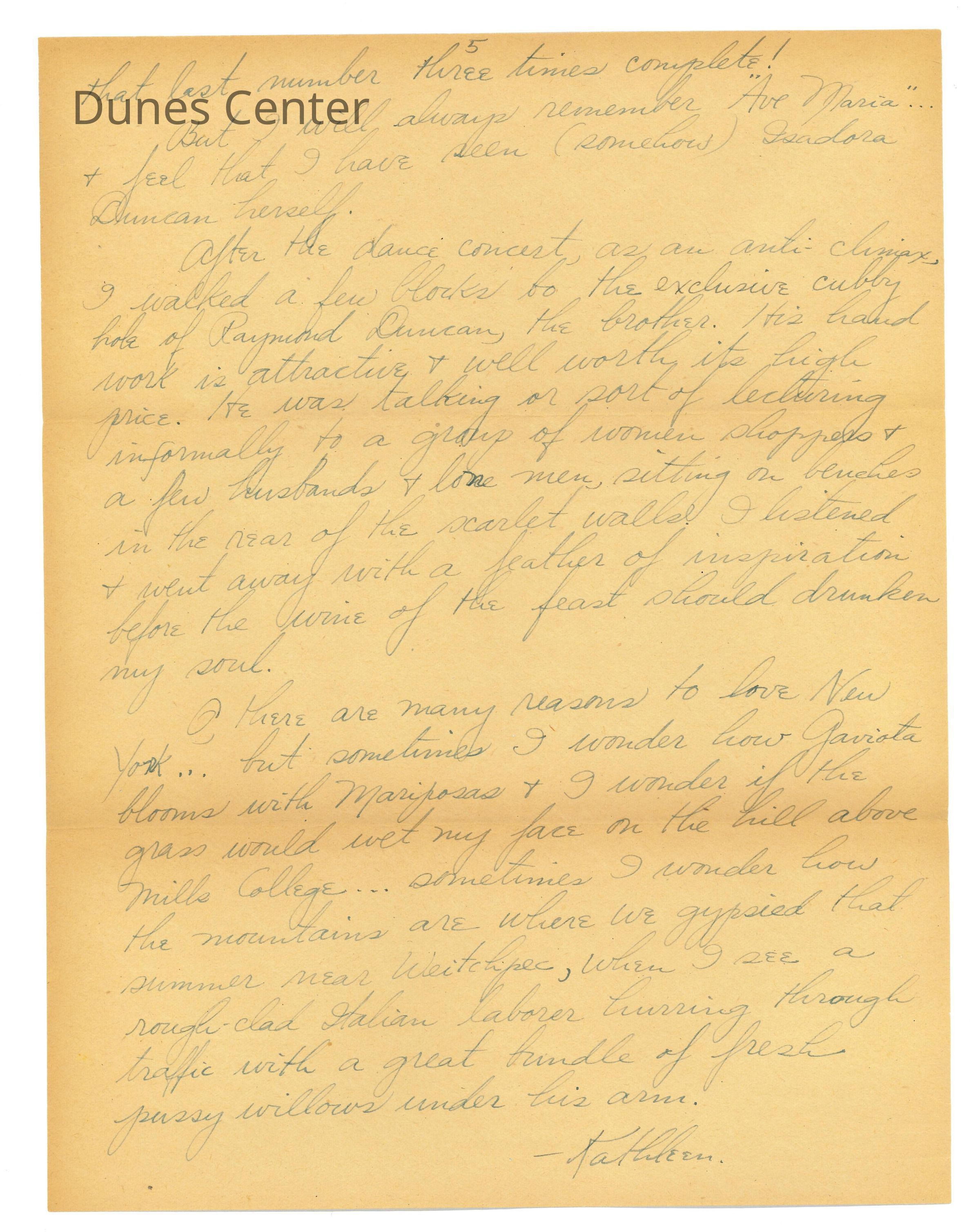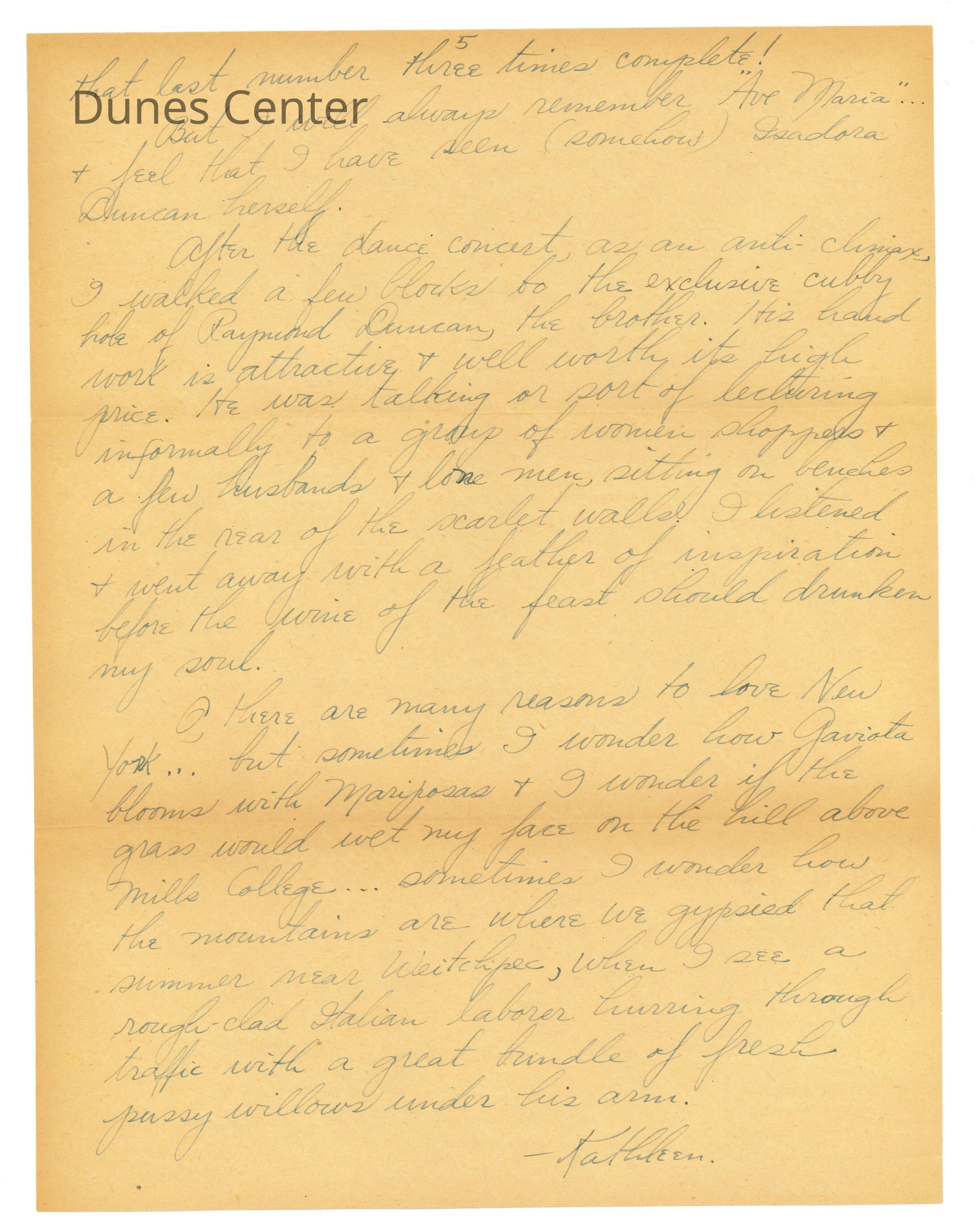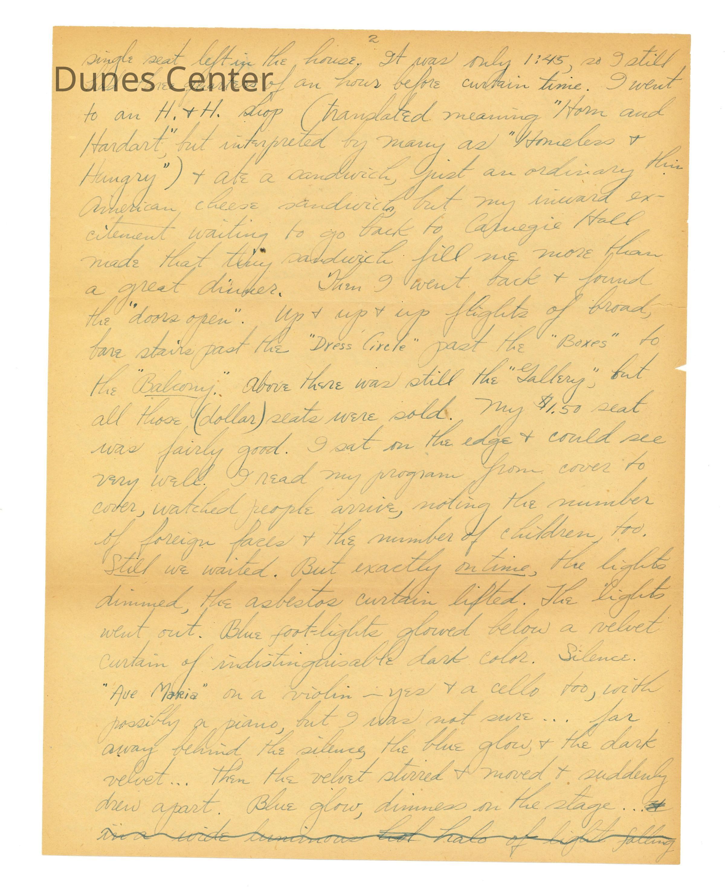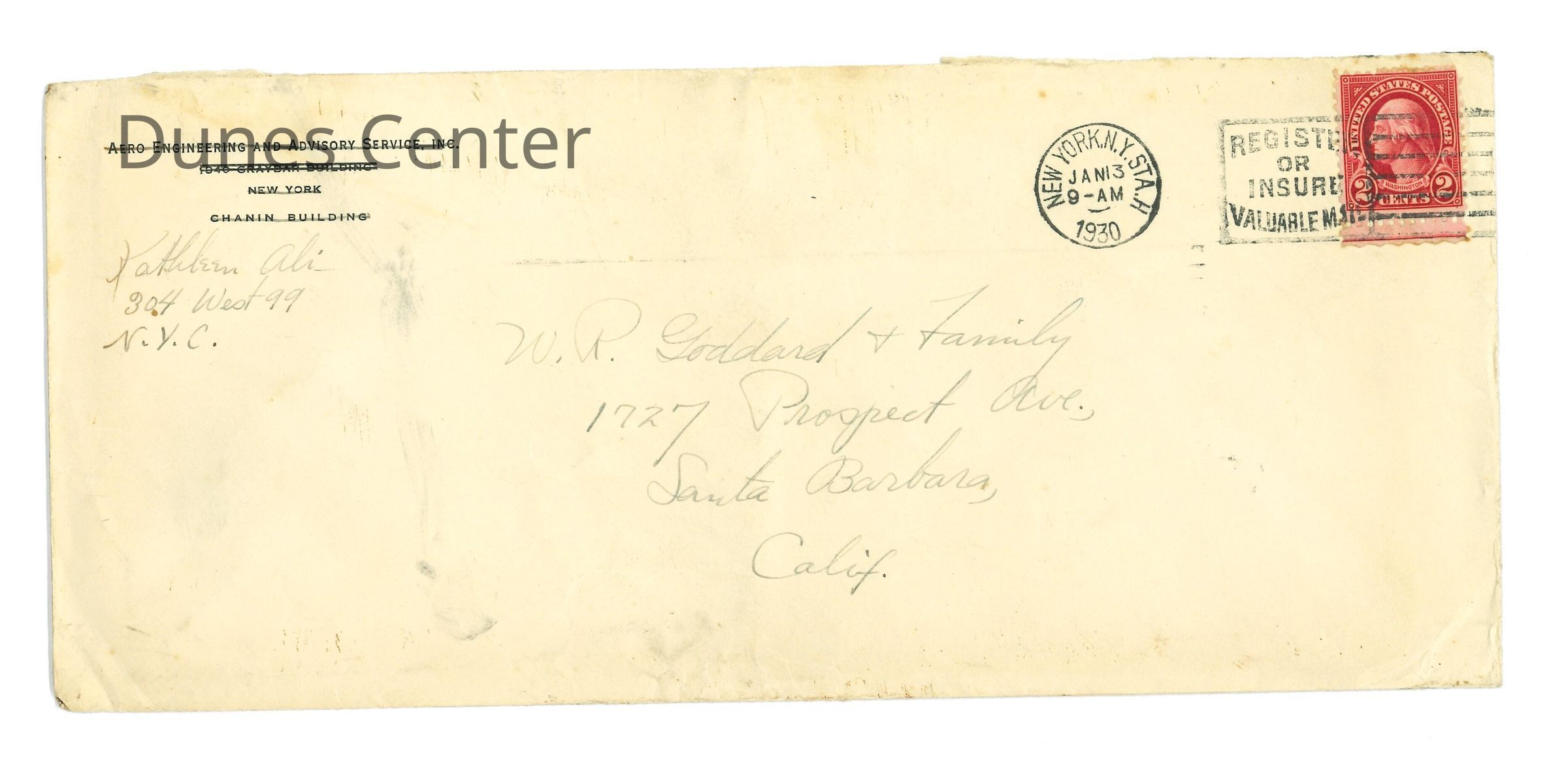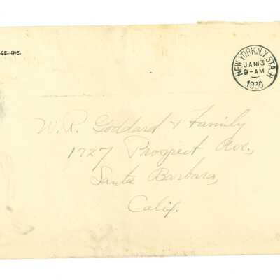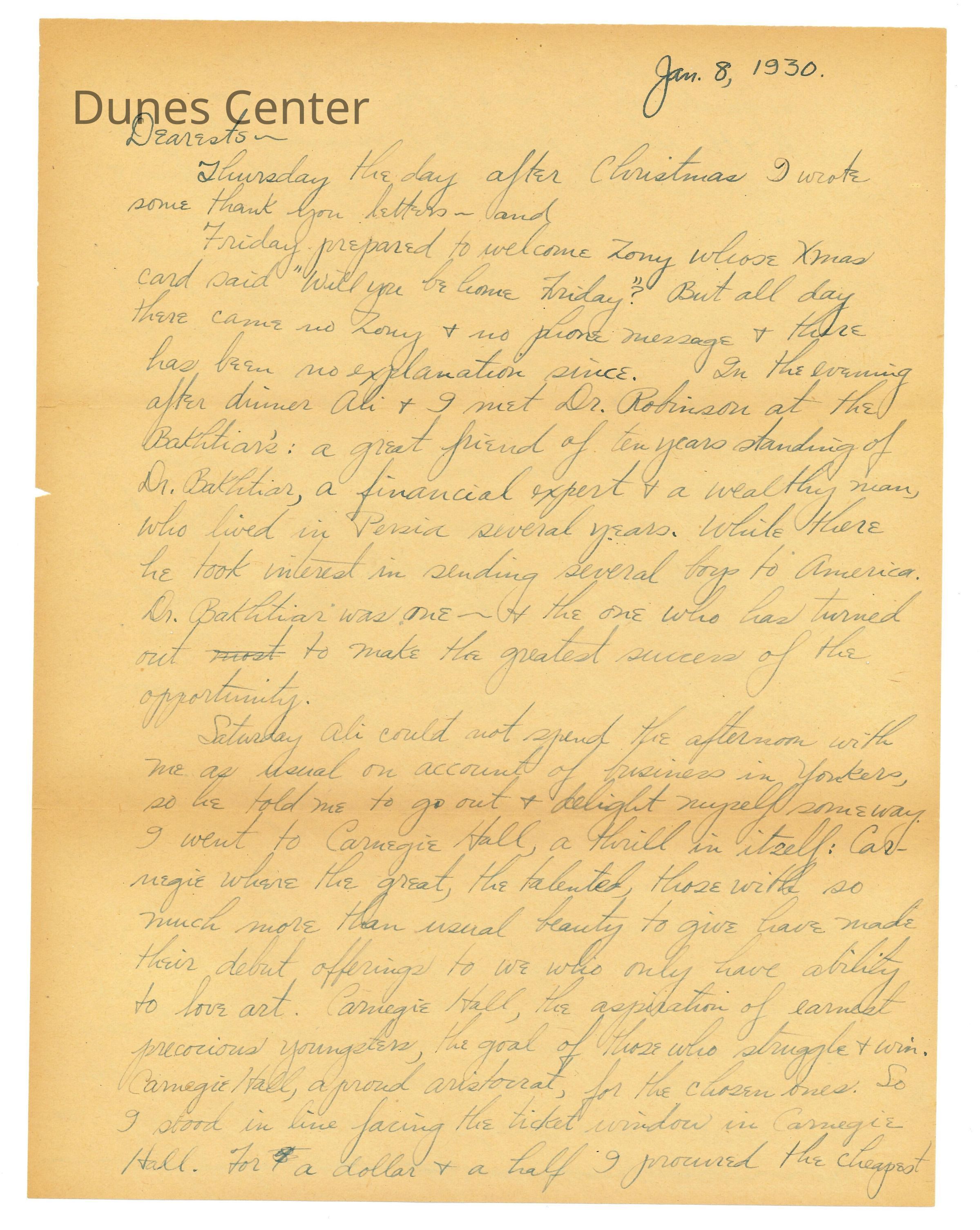 January 8, 1930, New York City, Letter from Kathleen Ali to W.R. Goddard & Family, letter describing Carnegie Hall performance, admissions was $1.45, program from Carnegie Hall included from her visit on Dec 28th, envelope included