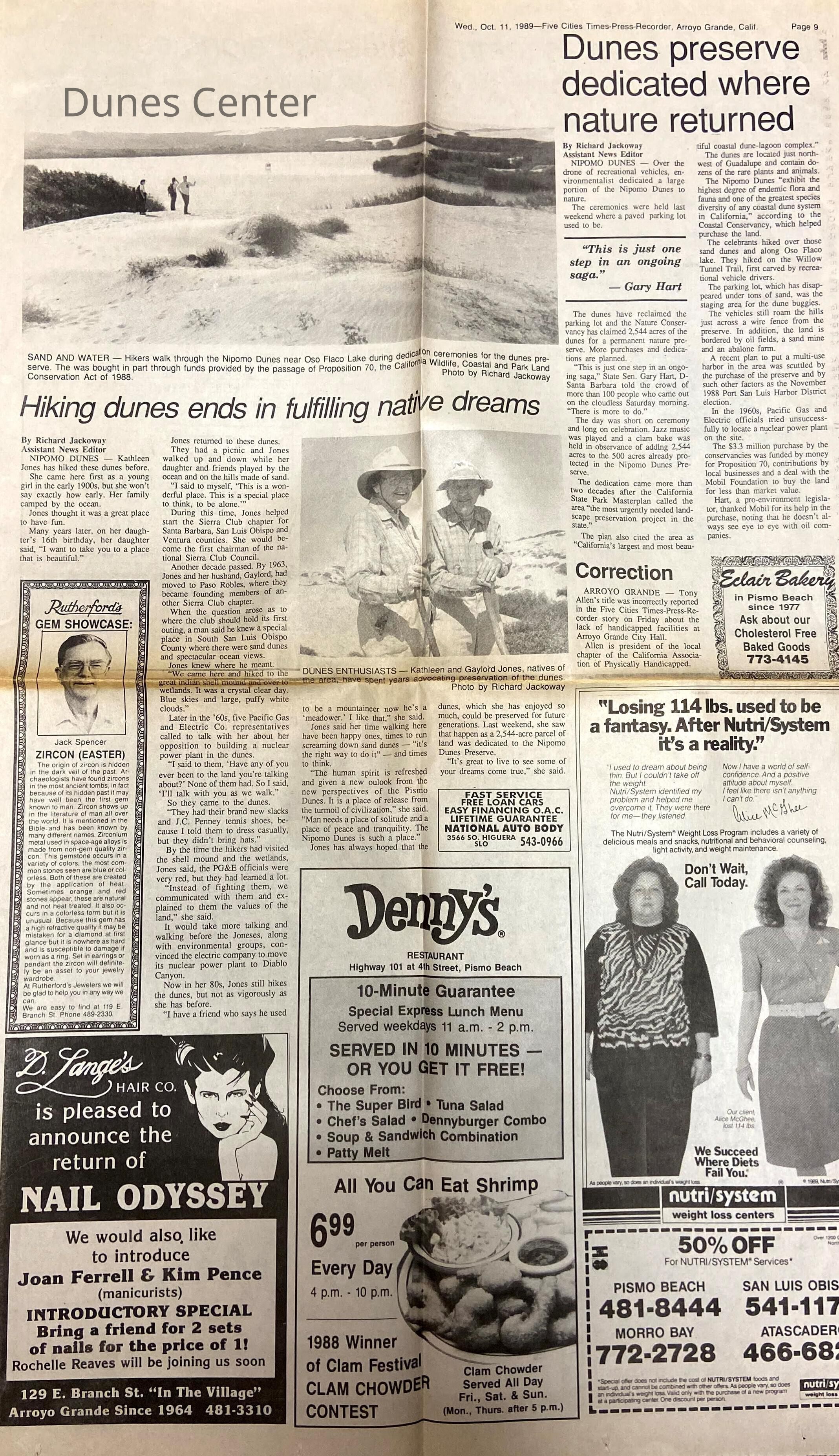 October 11, 1989, Five Cities Times-Press-Recorder articles titled "Dunes preserve dedicated where nature returned" and "Hiking dunes ends in fulfilling native dreams", covers the purchase of a parcel of the dunes by the Nature Conservancy and profiles Kathleen Goddard-Jones.Collection