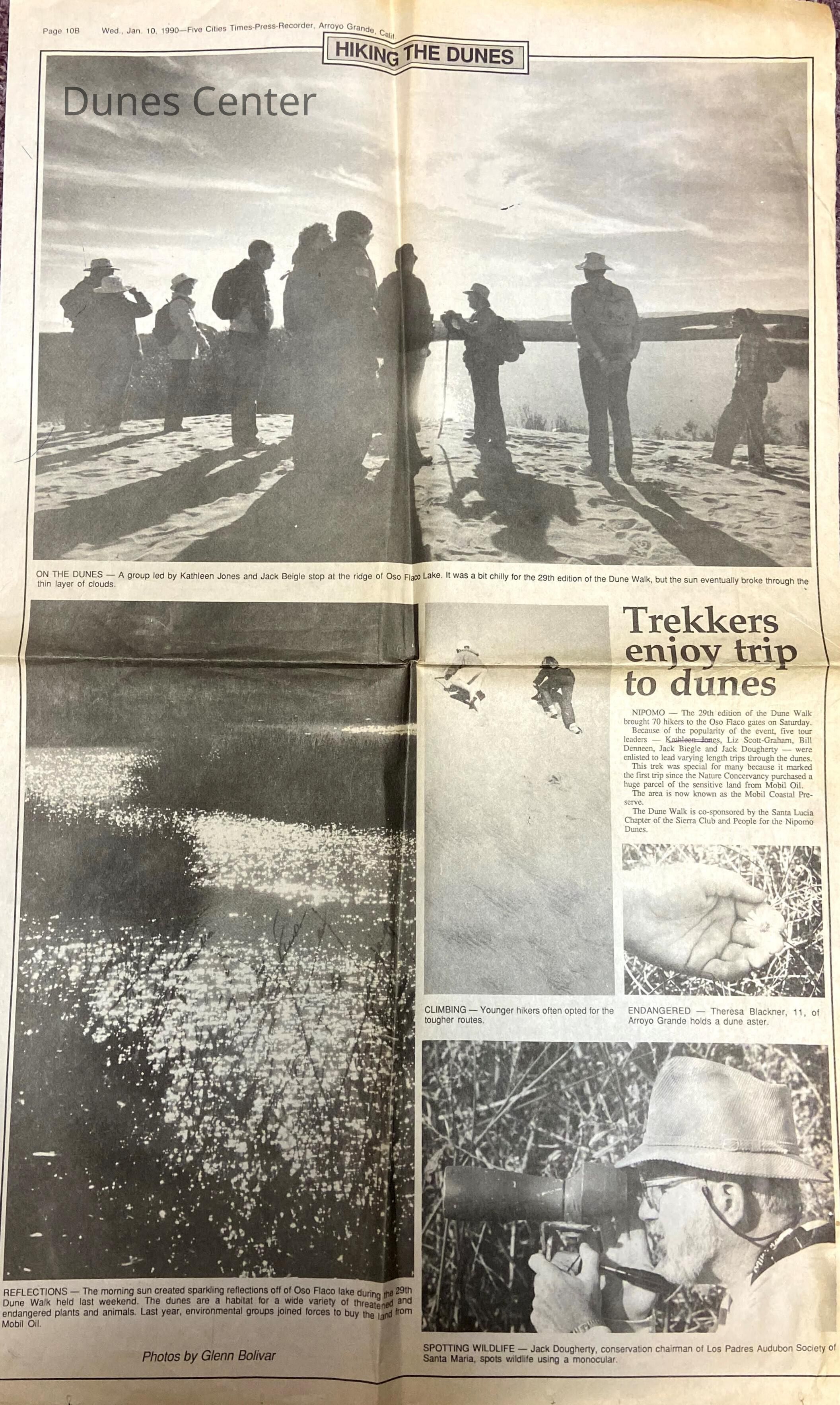 January 10, 1990, Five Cities Times-Press-Recorder article titled "Trekkers enjoy trip to dunes", covers a dunes walk led by Kathleen Goddard-Jones, Elizabeth Scott-Graham, Bill Denneen, Jack Biegle, and Jack Dougherty, includes photos.Collection