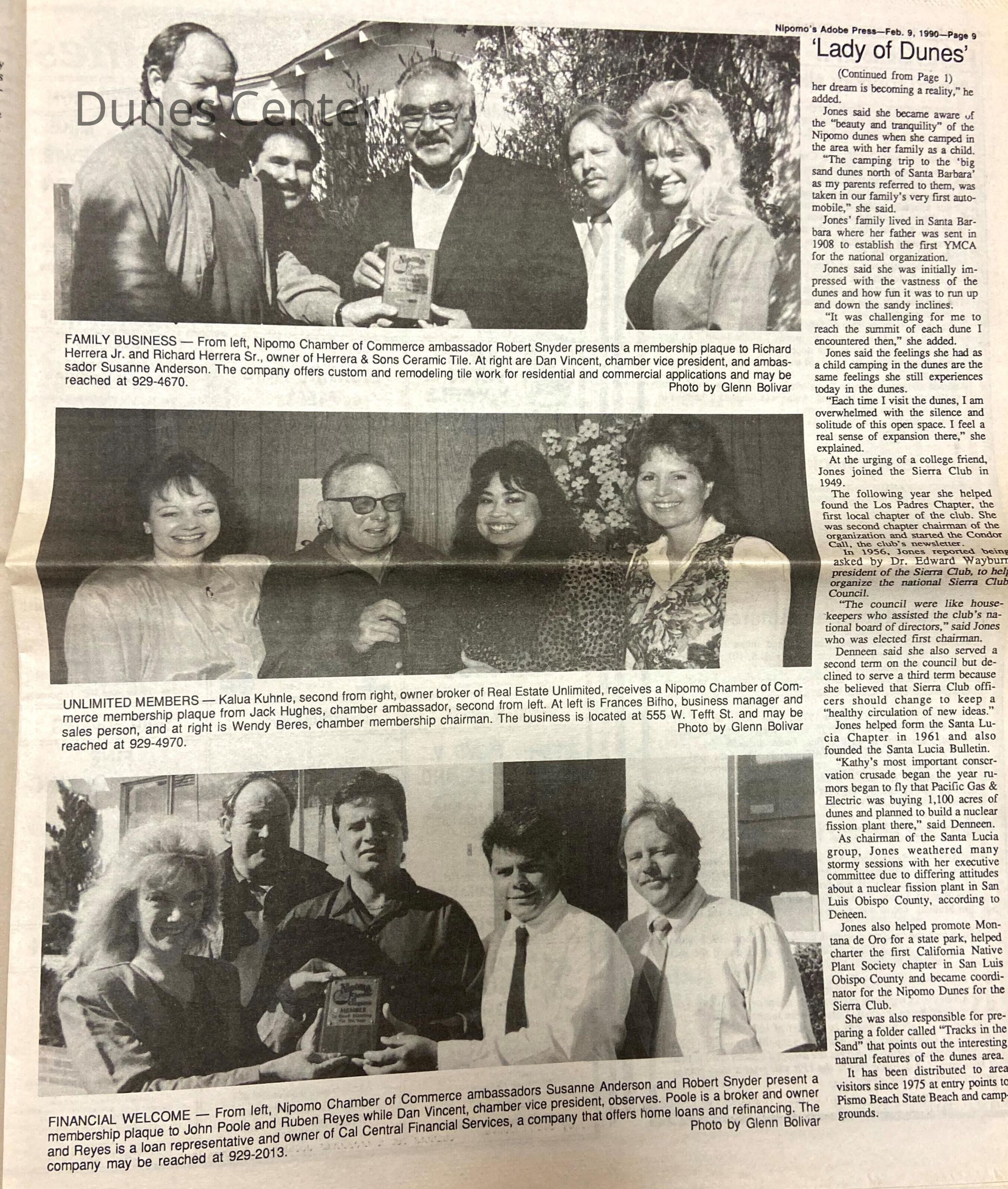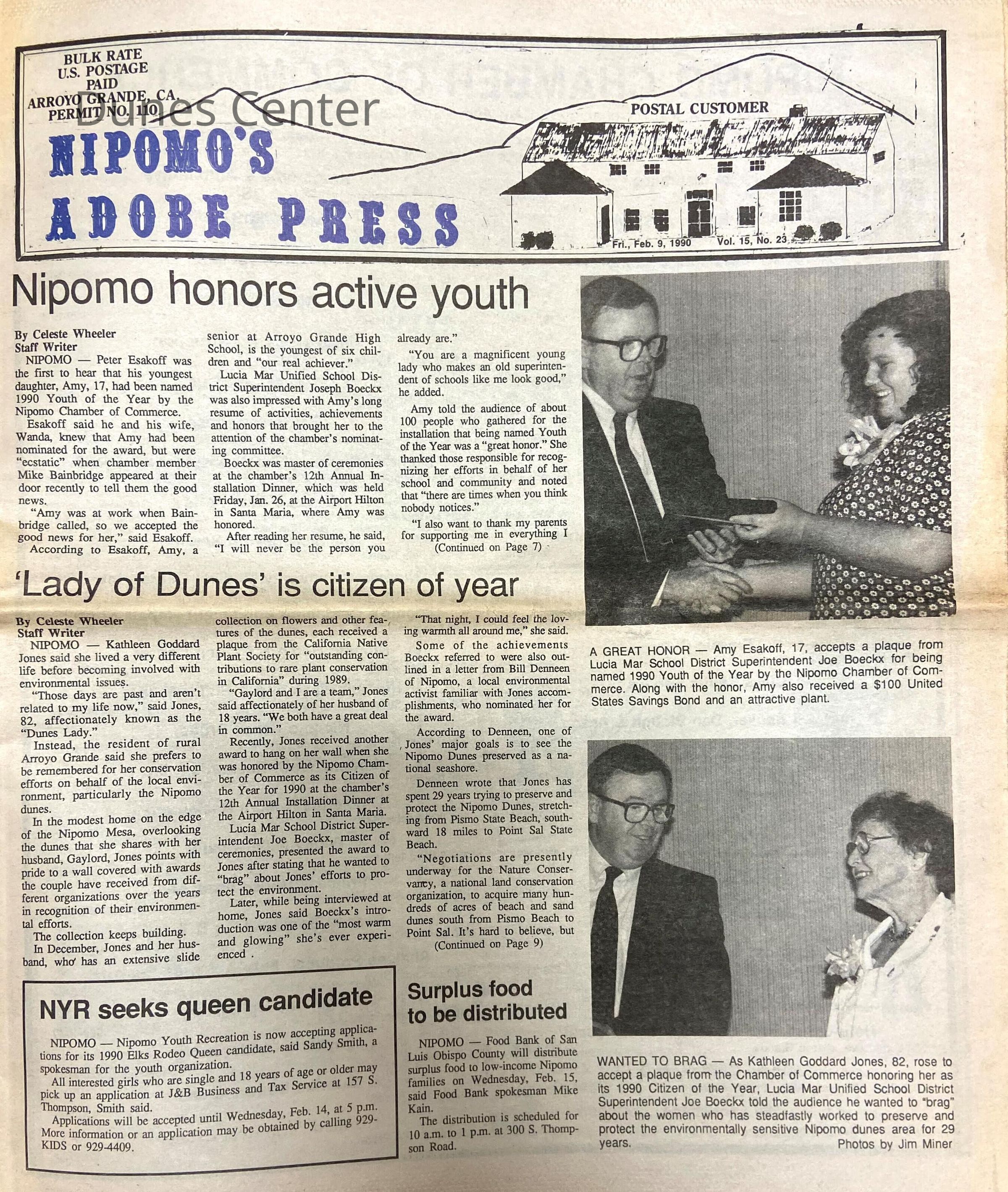 February 9, 1990, Nipomo's Adobe Press article titled "'Lady of Dunes' is citizen of year", interviews Kathleen Goddard-Jones about her work preserving the dunes.Collection