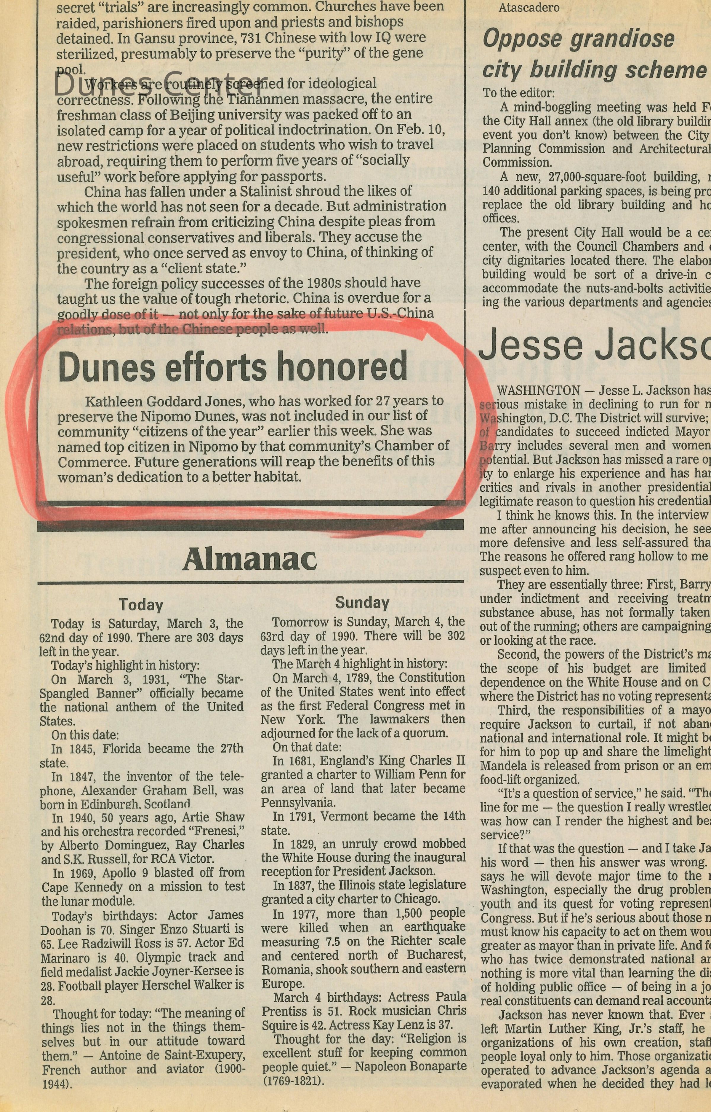 March 3, 1990, San Luis Obispo County Telegram-Tribune article titled "Dunes efforts honored", covers Kathleen Goddard-Jones being awarded "citizen of the year".Collection