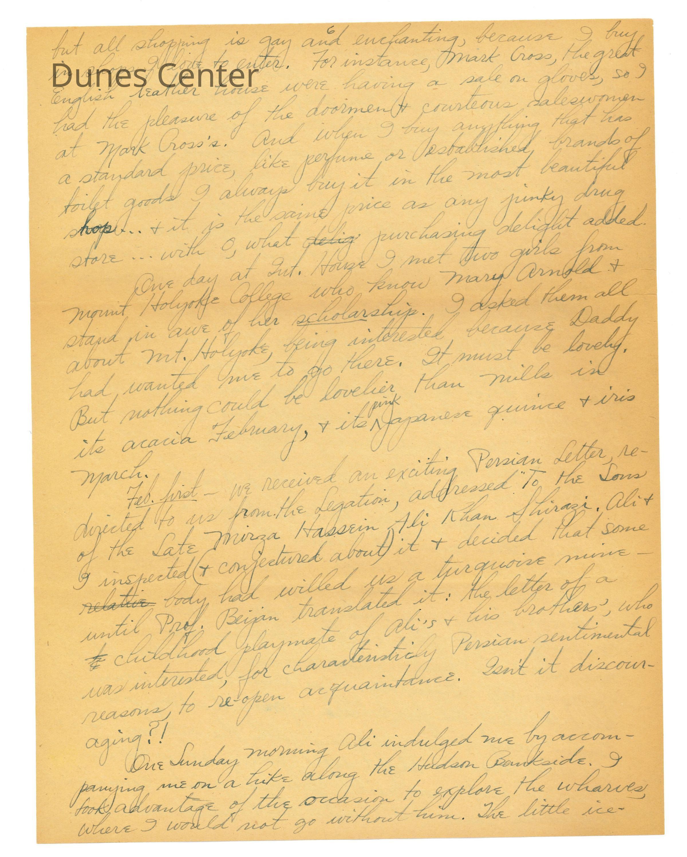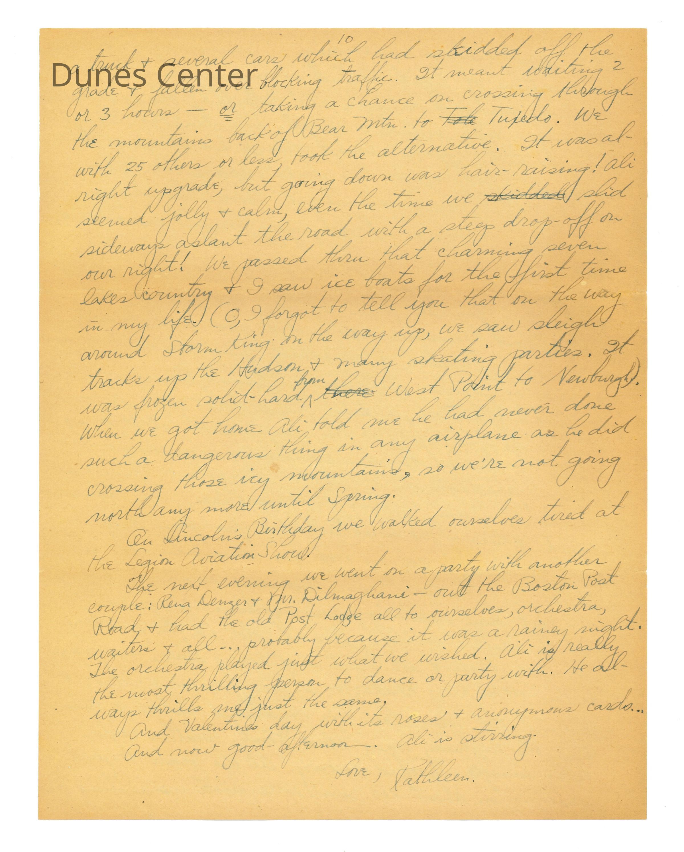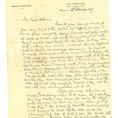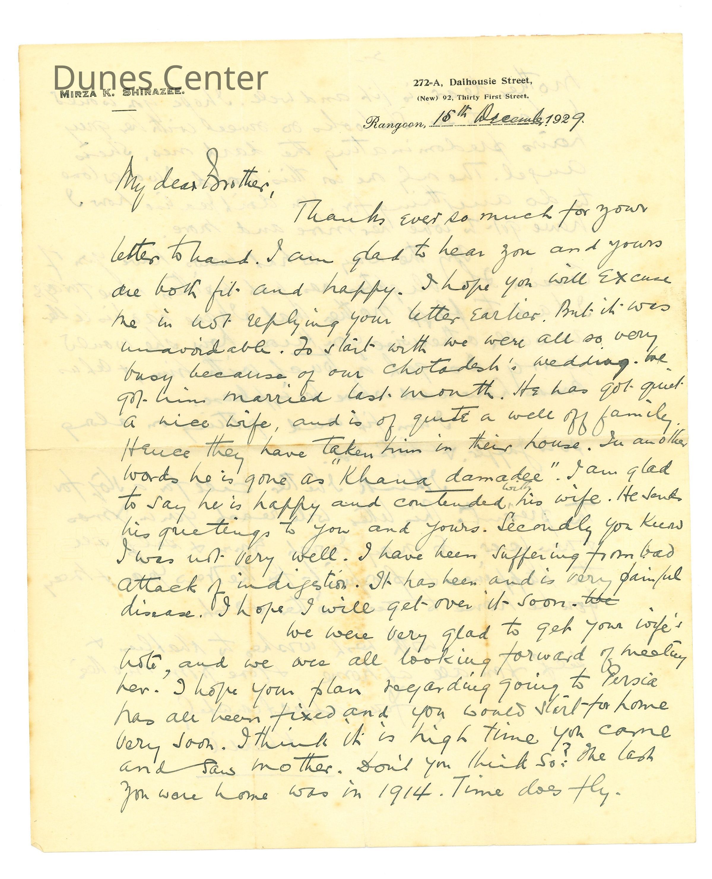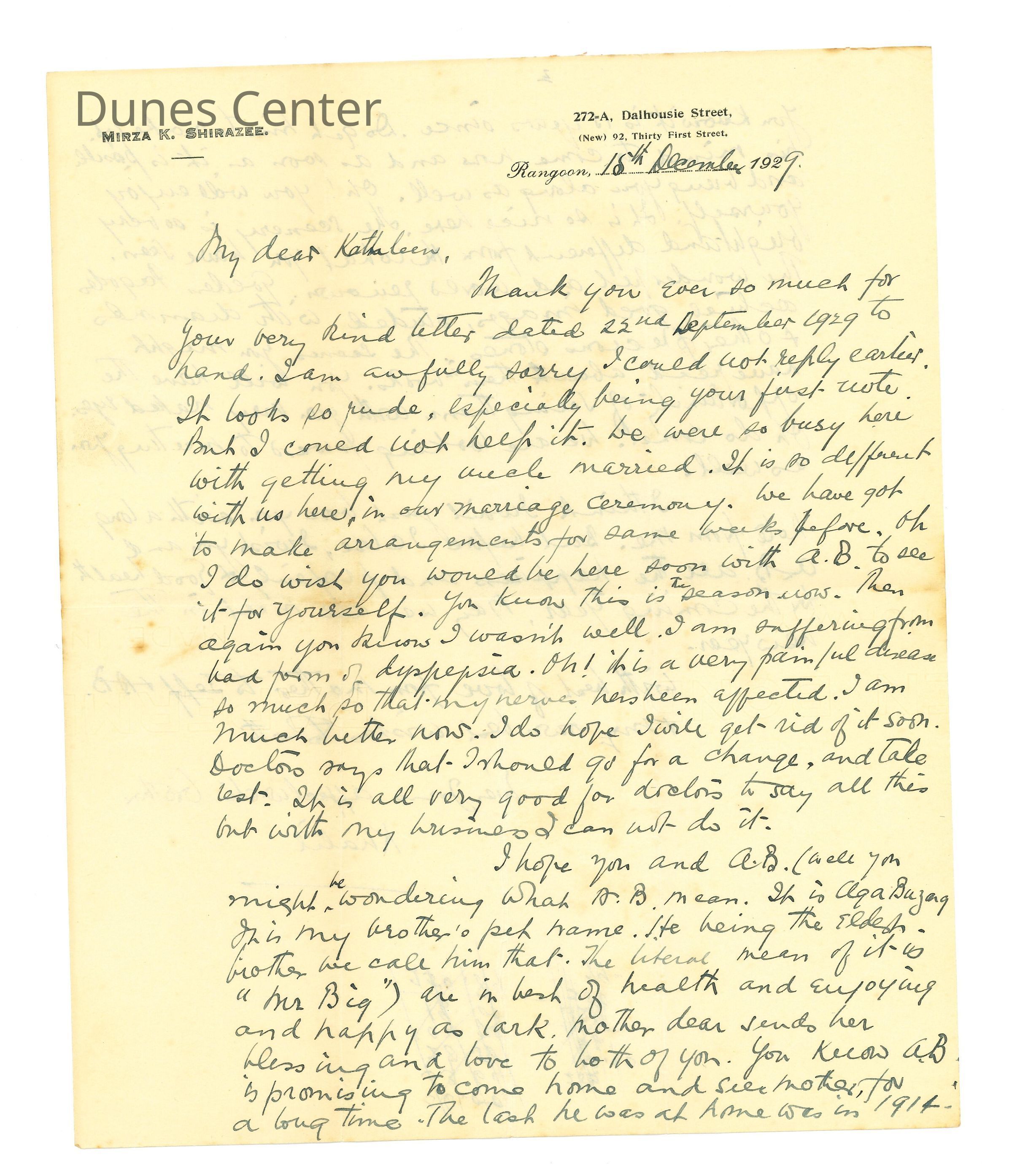 February 16, 1930, New York City, Letter from Kathleen Ali to W.R. Goddard & Family, winter, visiting the pictures, appendix operation, letters from Persia; December 15, 1929, Letters from Khahil (Ali's brother) to Kathleen and Ali, from Rangoon, BurmaEntry/Object ID