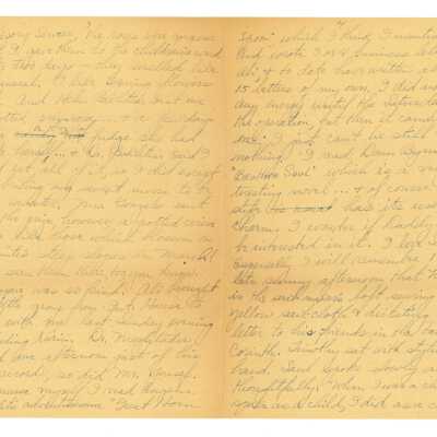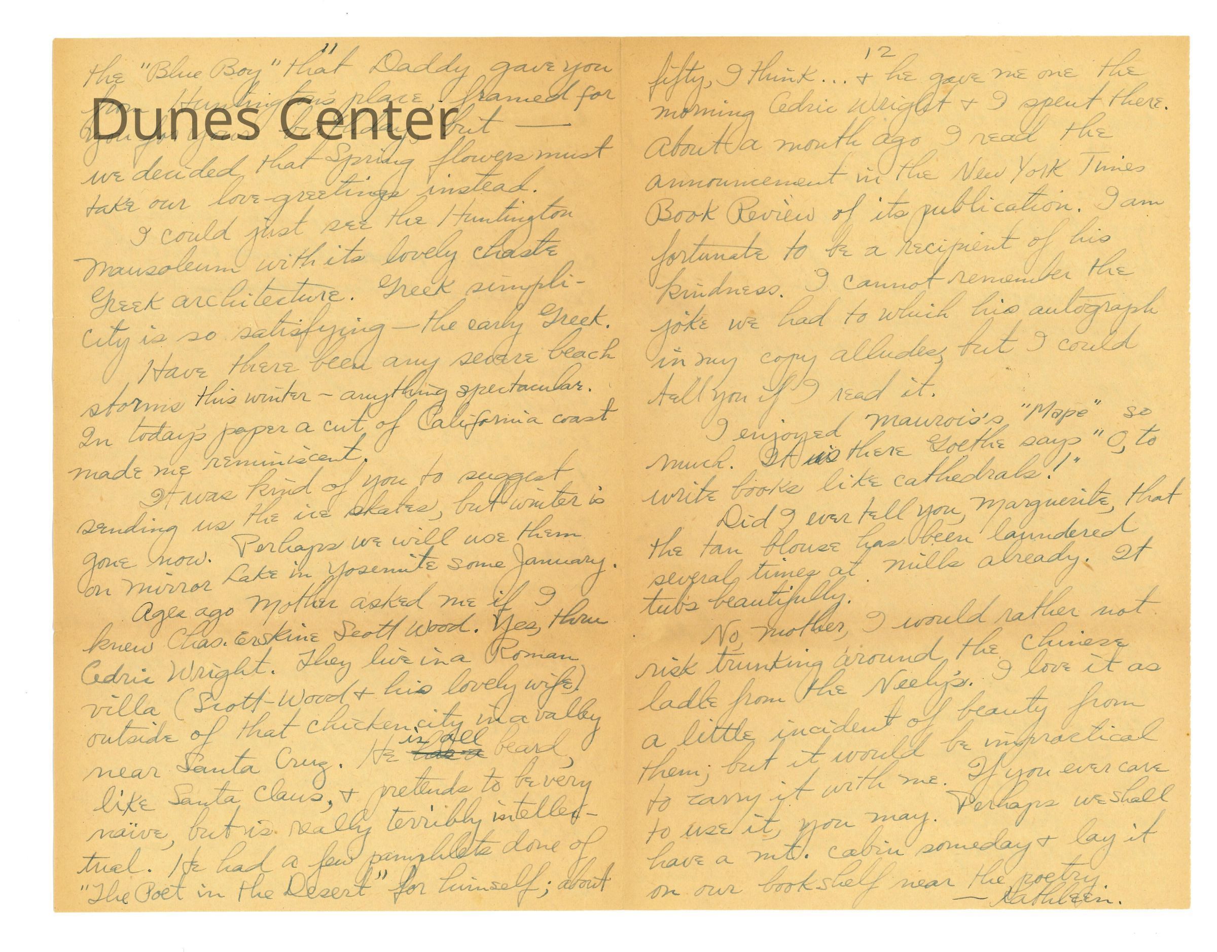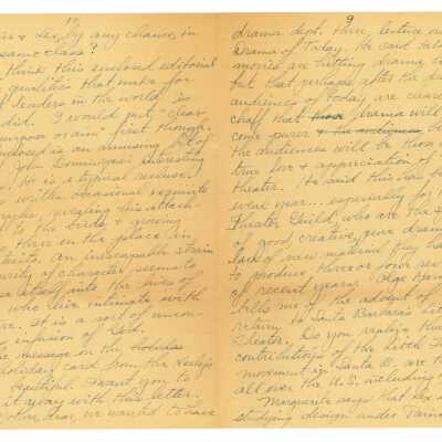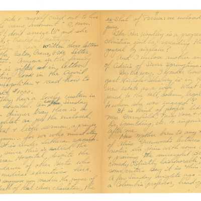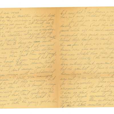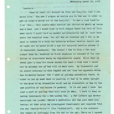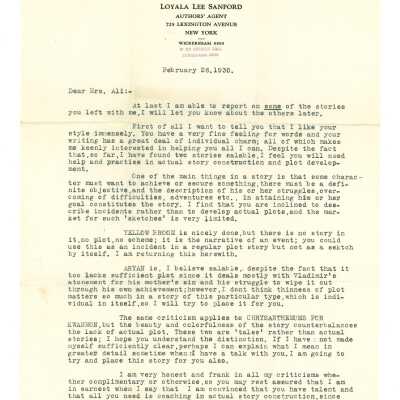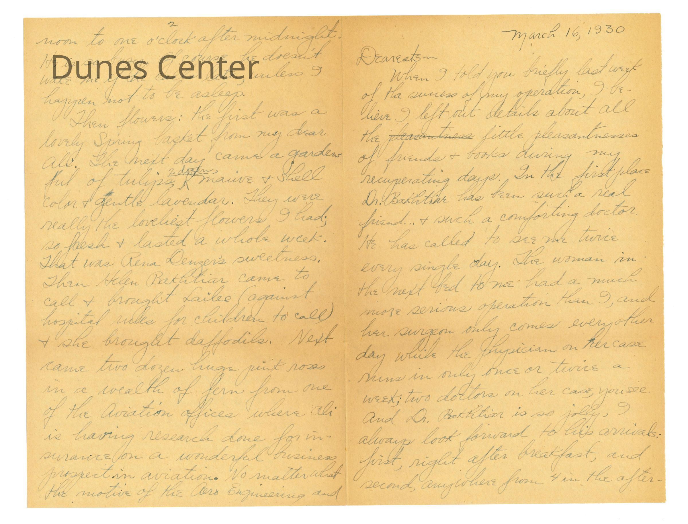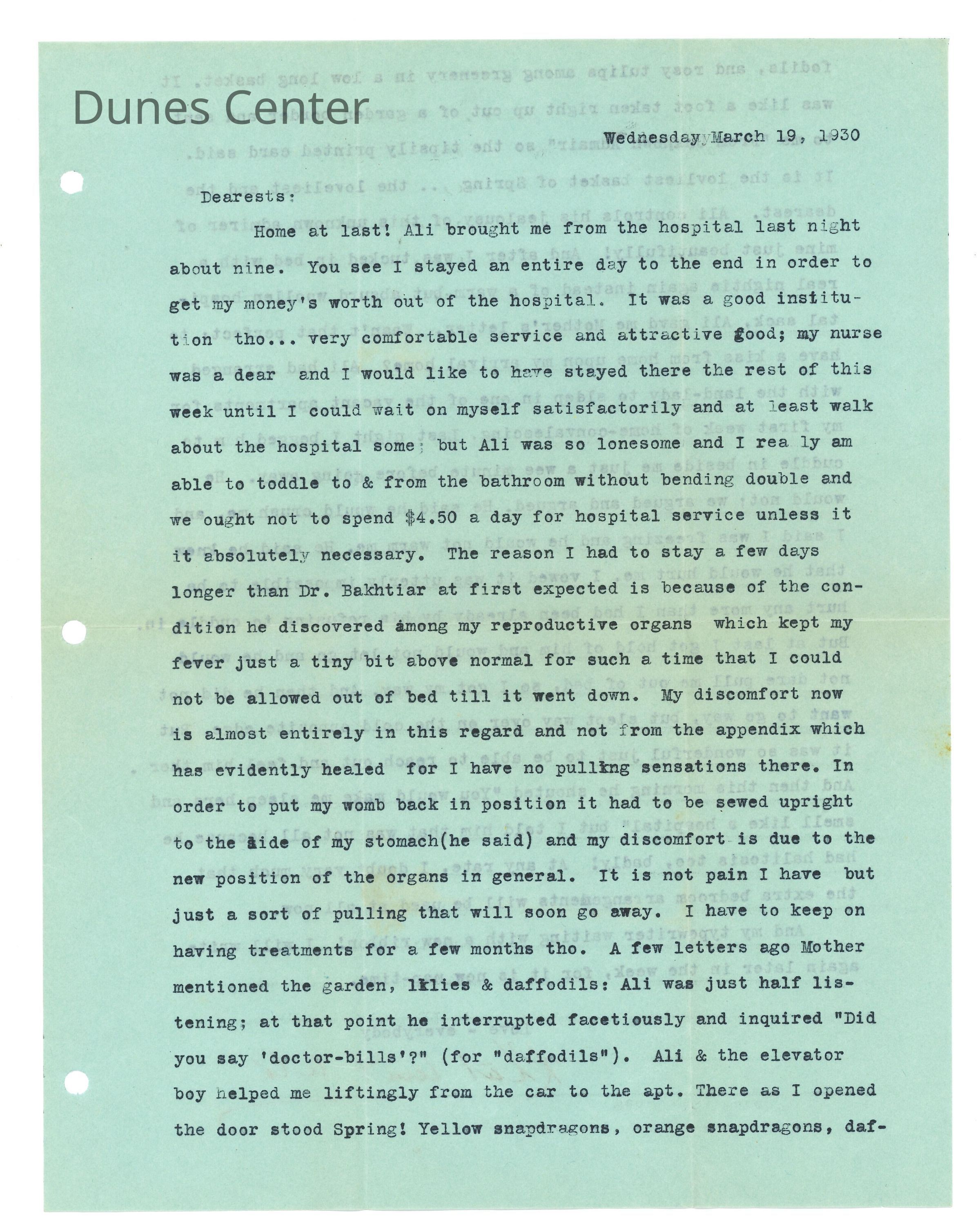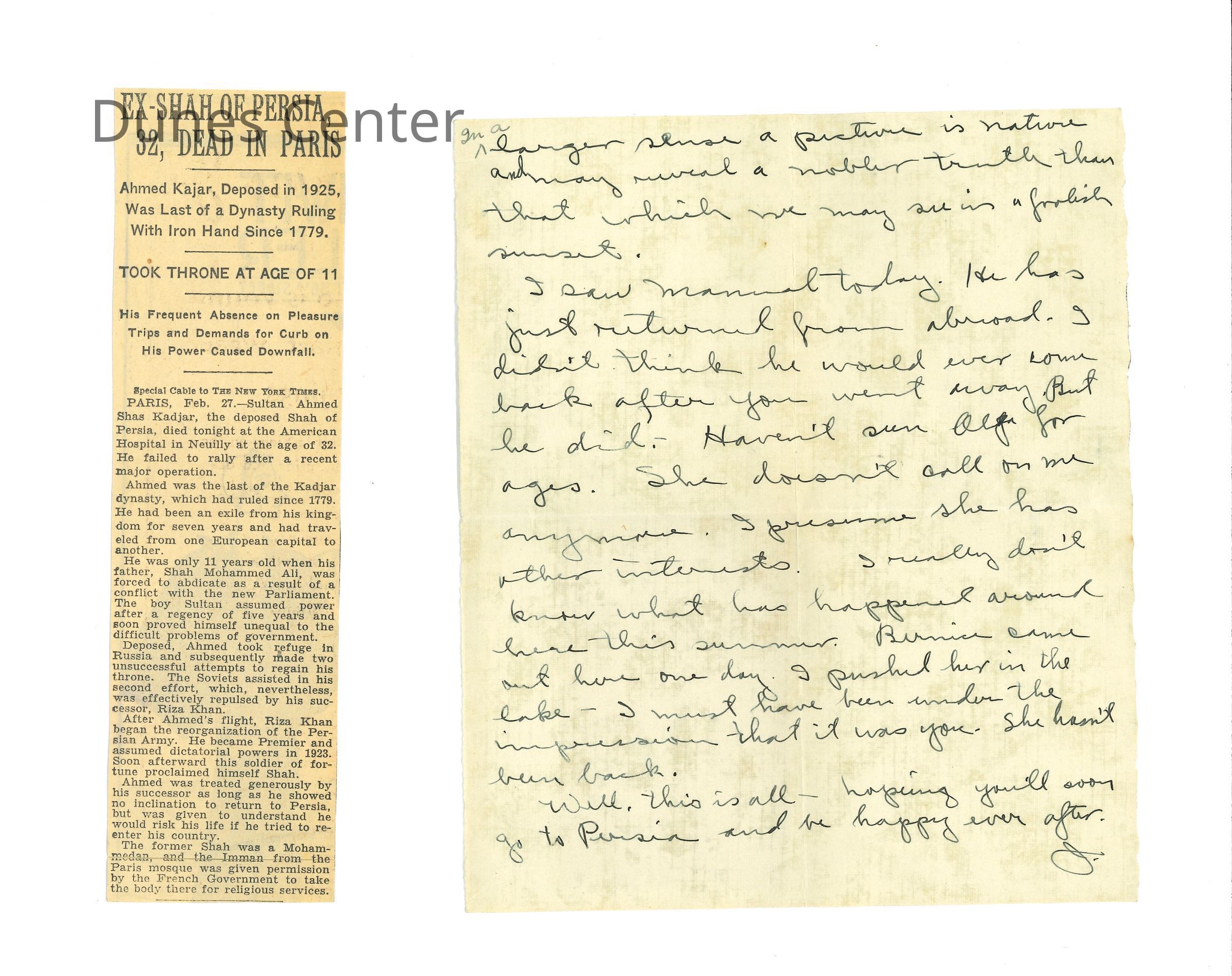 March 16, 1930, New York City, Letter from Kathleen Ali to W.R. Goddard & Family, describing Kathleen's hospital stay and visitors; March 19, 1930, typewritter typed letter from Kathleen Ali to W.R. Goddard & Family, Kathleen leaving the hospital and recovering at home, photo of tree included, envelope included; Christmas Greeting from Mrs. Goddard to Kathleen with drawing and poem; Undated Letter to Ali from unknown writer with newspaper article about the death of the shah in Persia; Letter to Kathleen Ali from Loyala Lee Sanford, authors' agent in New York, letter about stories Kathleen submitted for publishing,Dimensions
