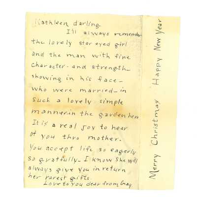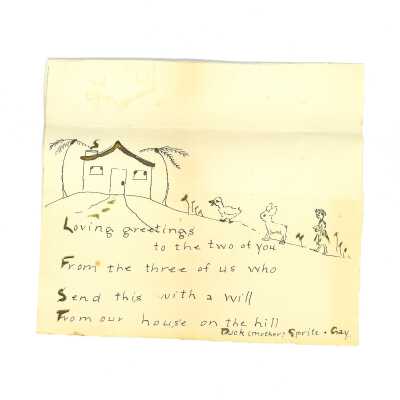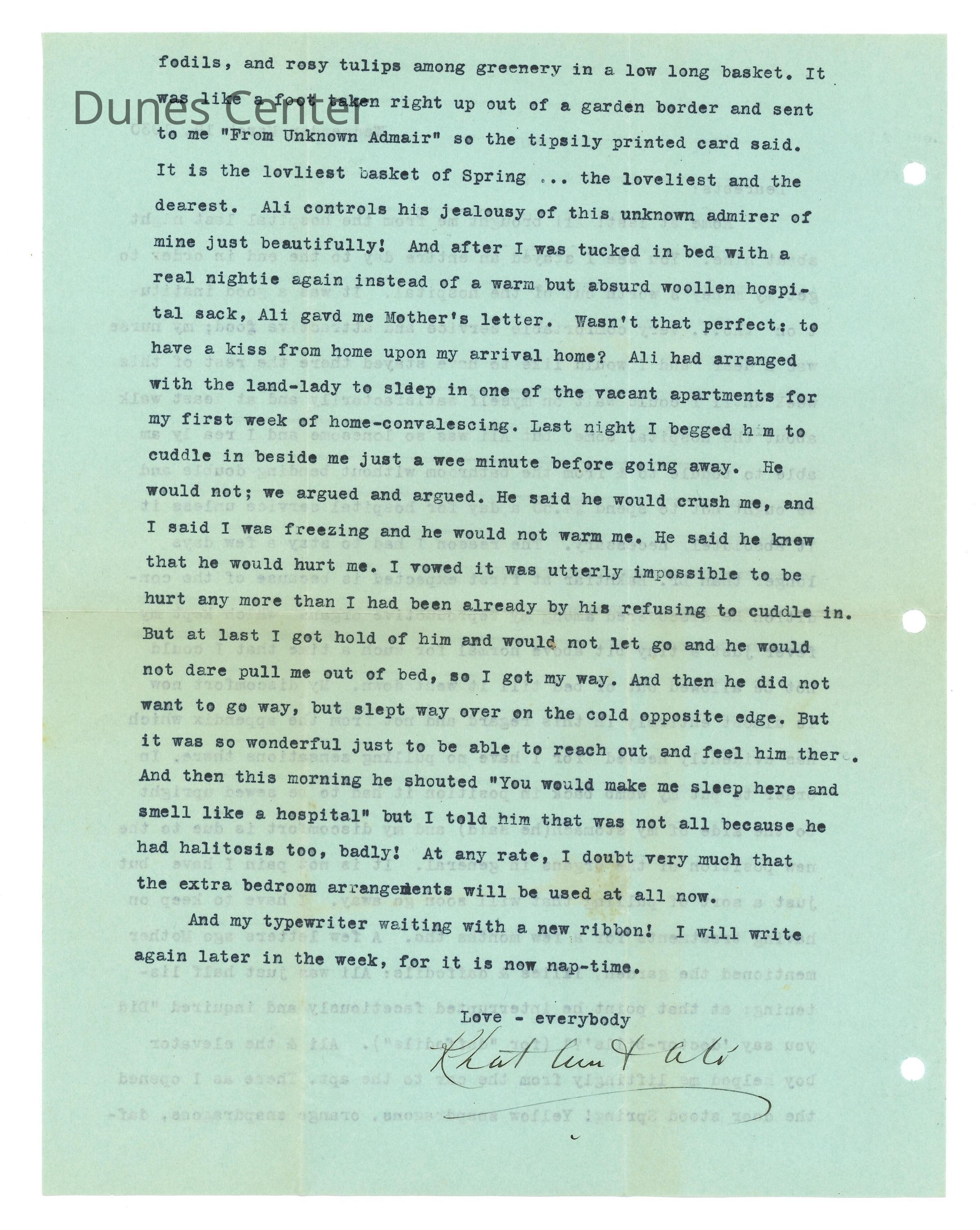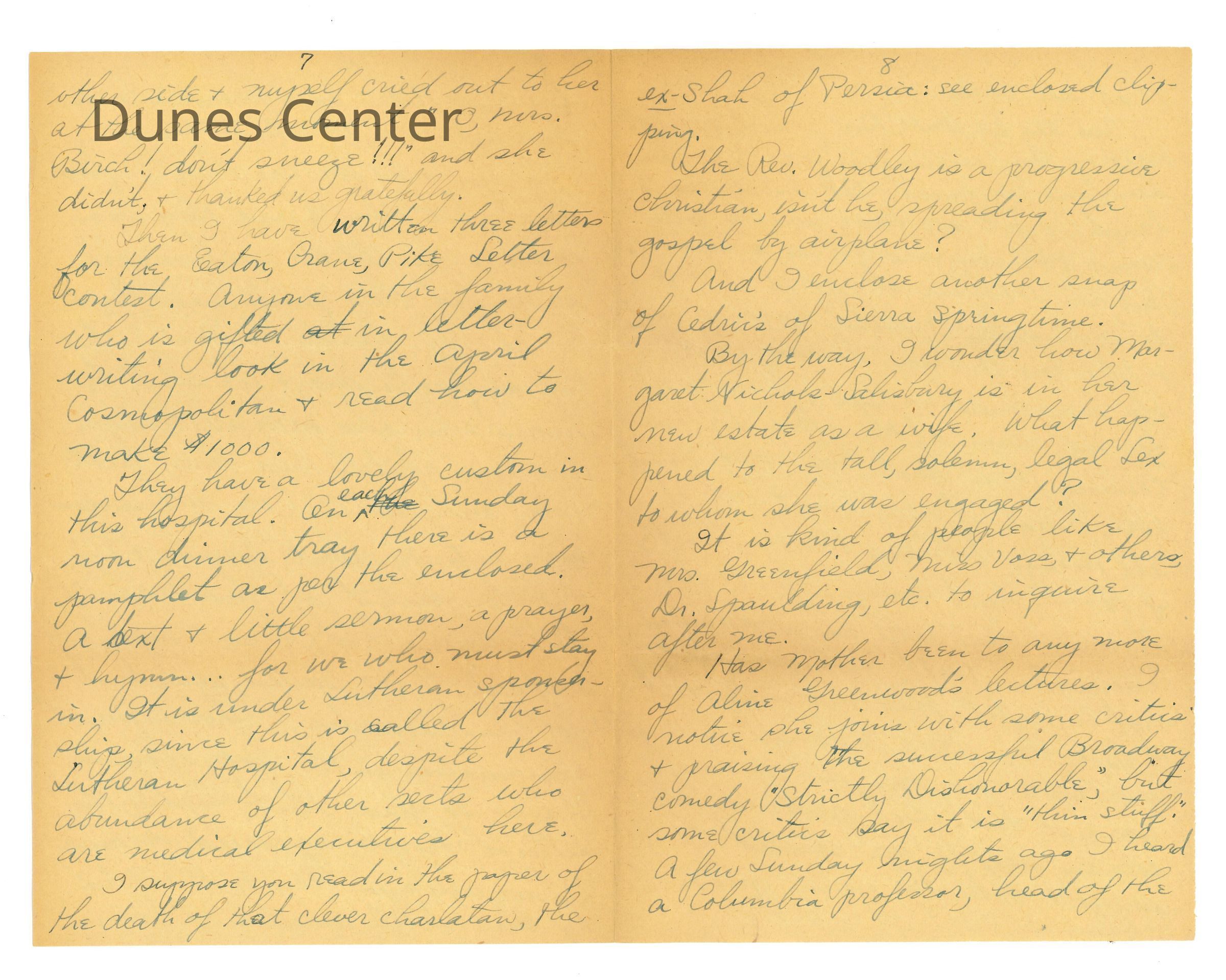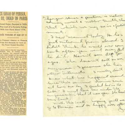 March 16, 1930, New York City, Letter from Kathleen Ali to W.R. Goddard & Family, describing Kathleen's hospital stay and visitors; March 19, 1930, typewritter typed letter from Kathleen Ali to W.R. Goddard & Family, Kathleen leaving the hospital and recovering at home, photo of tree included, envelope included; Christmas Greeting from Mrs. Goddard to Kathleen with drawing and poem; Undated Letter to Ali from unknown writer with newspaper article about the death of the shah in Persia; Letter to Kathleen Ali from Loyala Lee Sanford, authors' agent in New York, letter about stories Kathleen submitted for publishing,Entry/Object ID