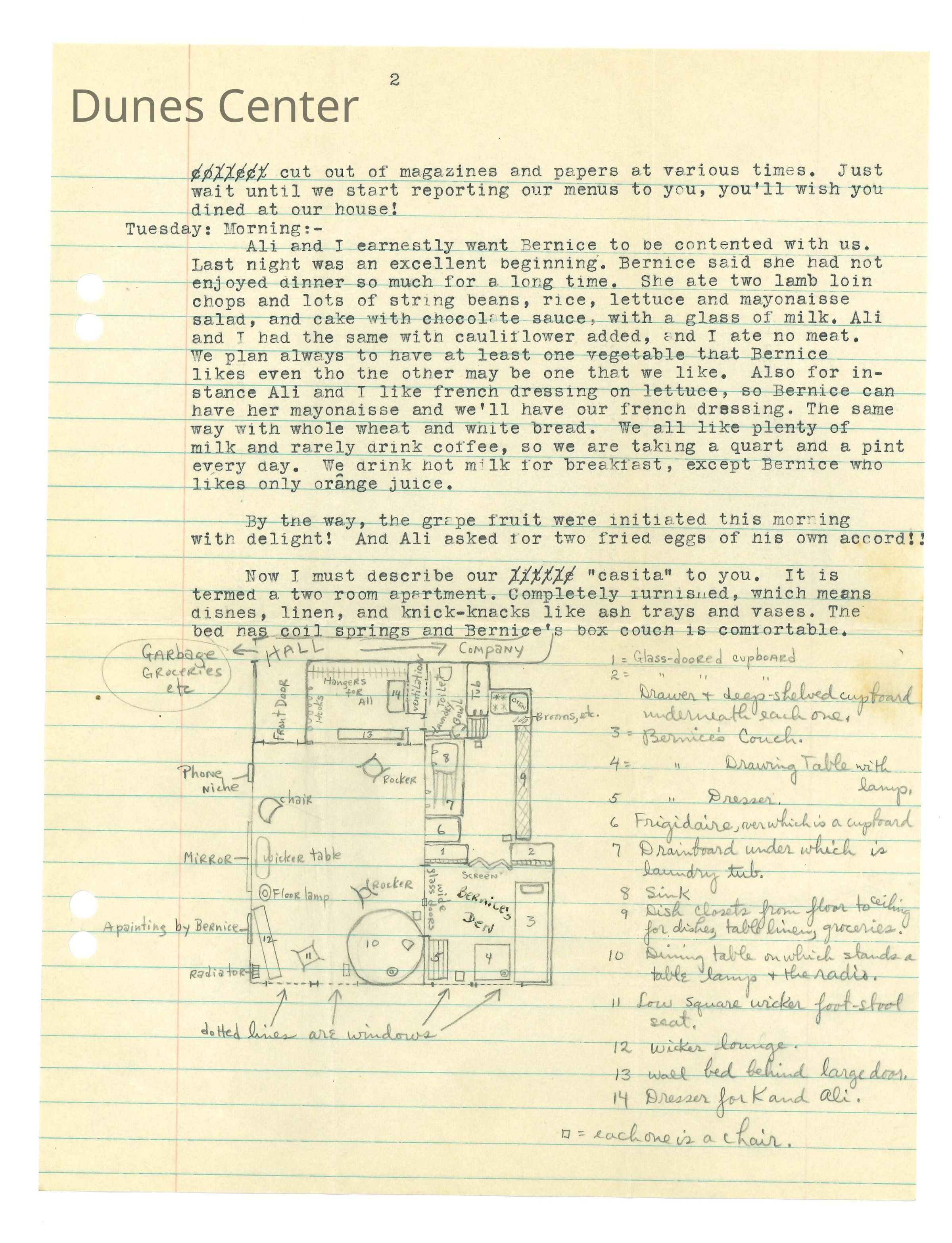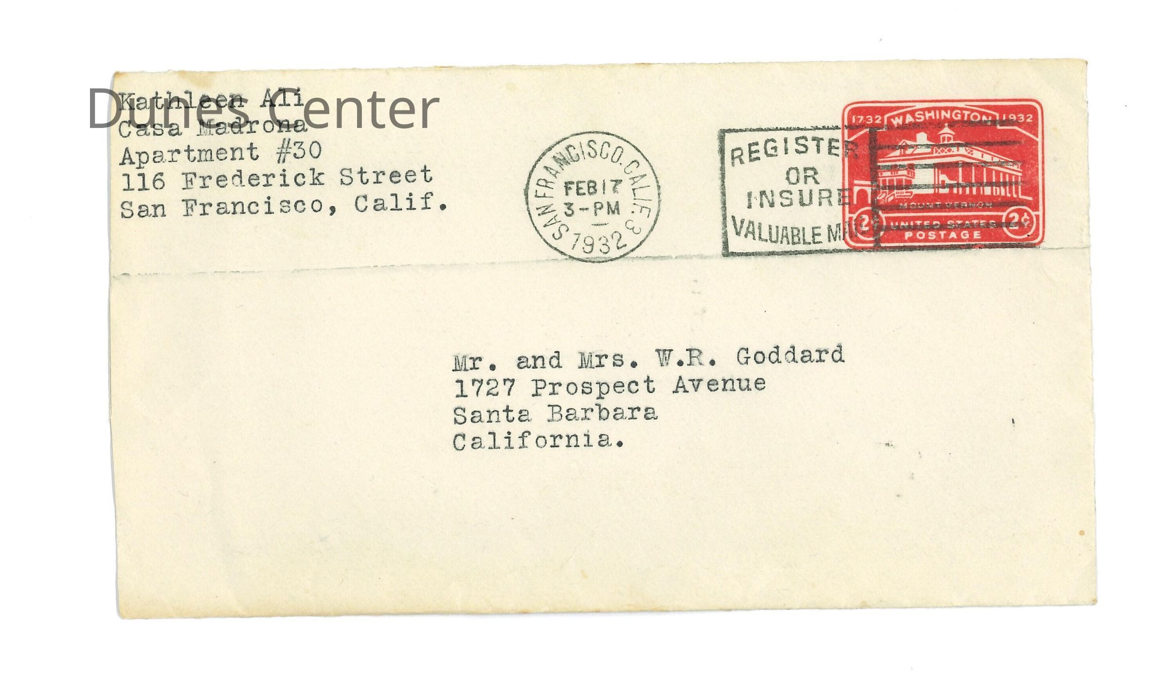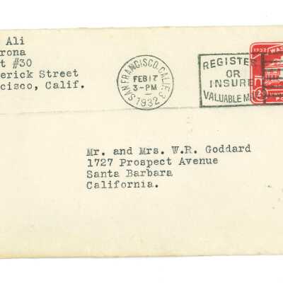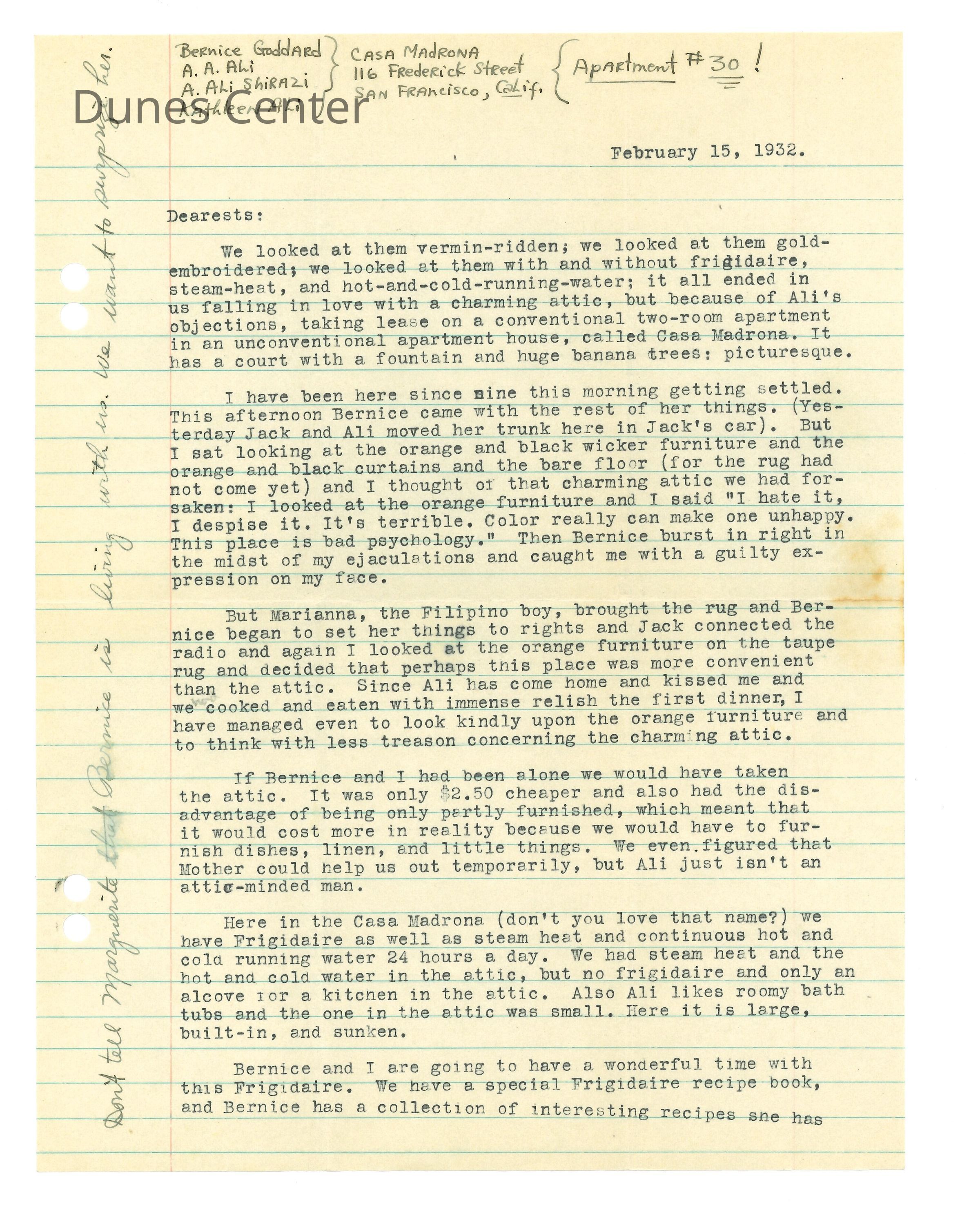 February 15, 1932, San Francisco, Typed letter from Kathleen Ali to W.R. Goddard & Family, new apartment with sister and money issues, drawing of apartment floorplan, envelope includedEntry/Object ID