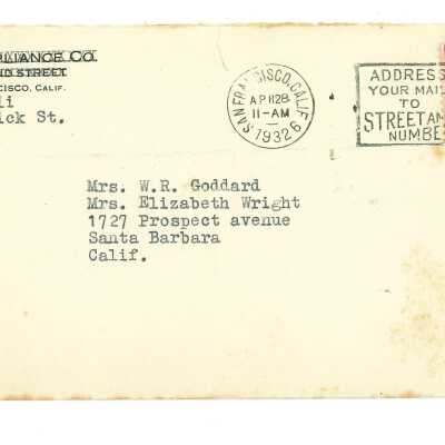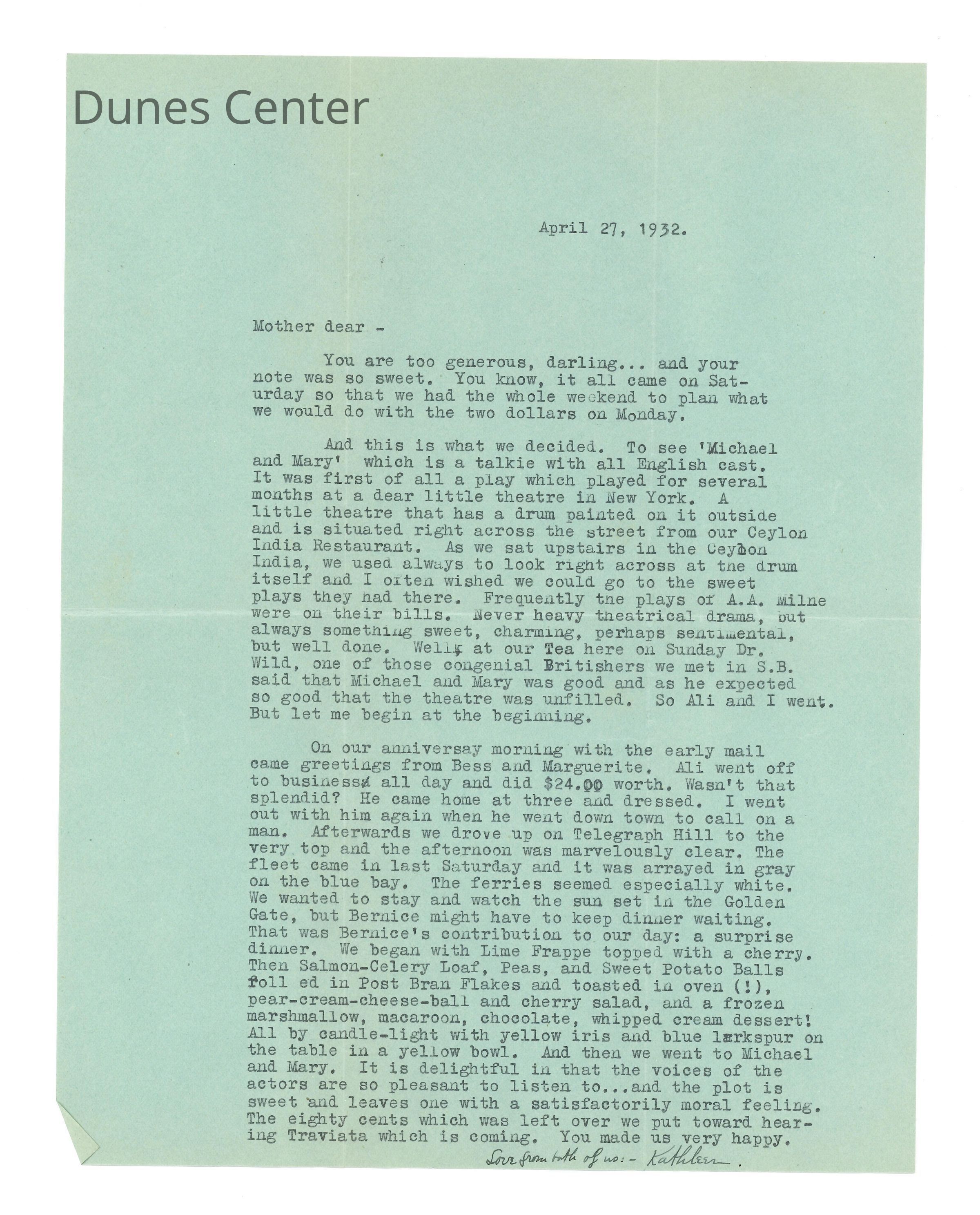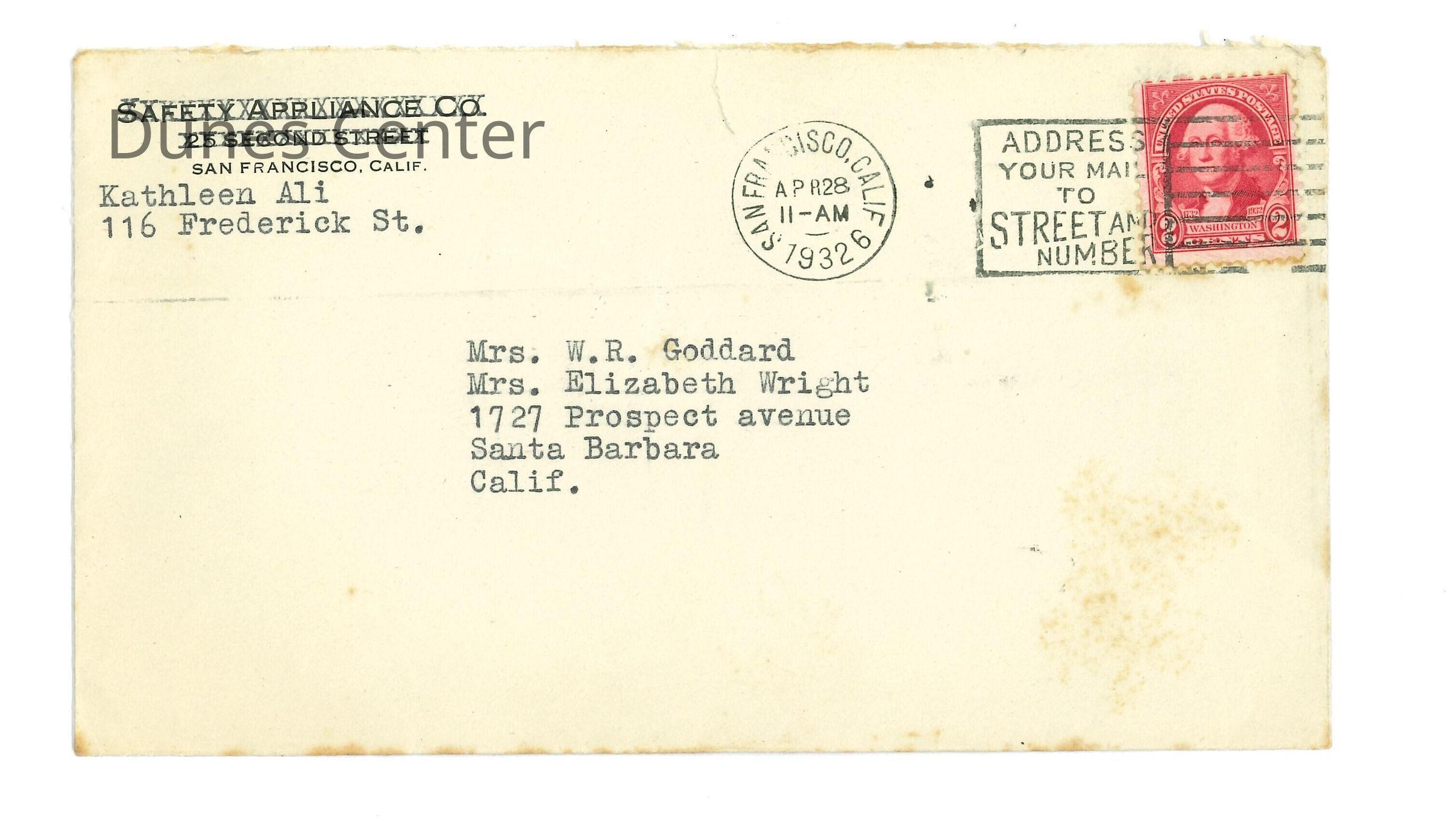 April 27, 1932, San Francisco, Letter typed on blue paper from Kathleen Ali to Mrs. W.R. Goddard, going to a talkie, wedding anniversary, envelope includedEntry/Object ID