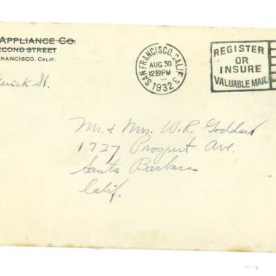 August 30, 1932, San Francisco, Letter from Kathleen Ali to Mr. & Mrs. W.R. Goddard, moving out of apartment, laundrey cost, looking for a new room for Kathleen's sister, envelope includedEntry/Object ID