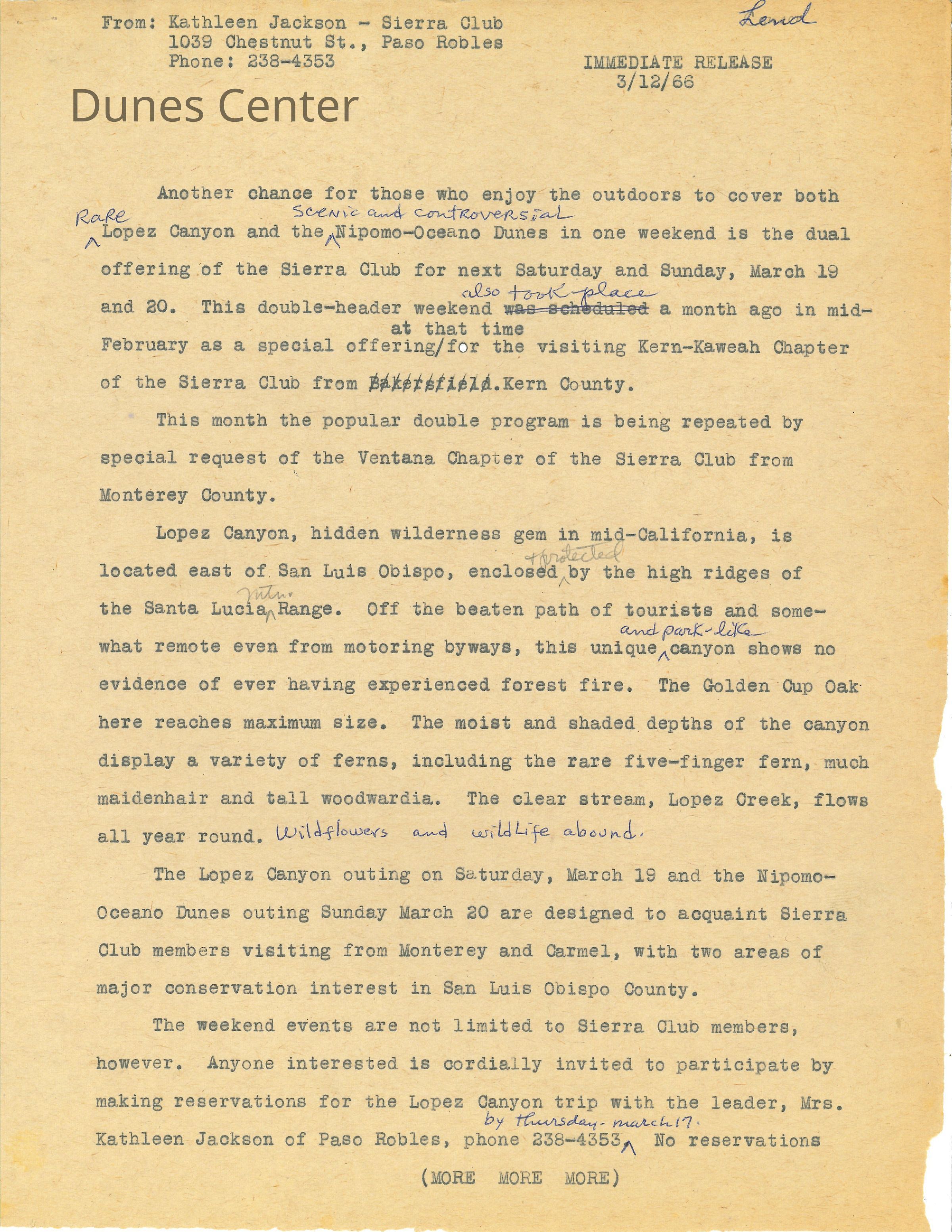 March 12, 1966, Press release from Kathleen Goddard-Jones about a Sierra Club hike.