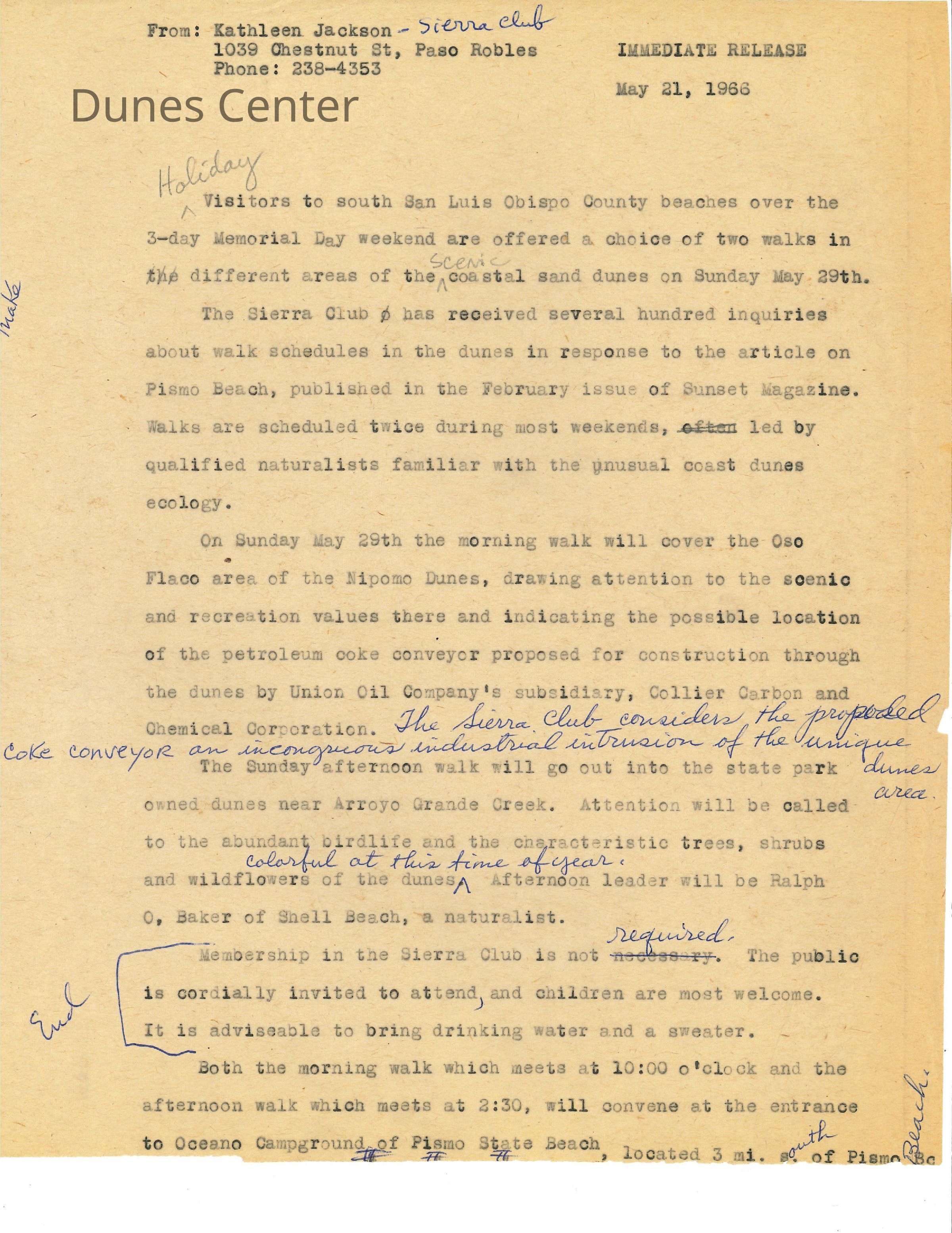 May 21, 1966, Press release from Kathleen Goddard-Jones about a Sierra Club hike.