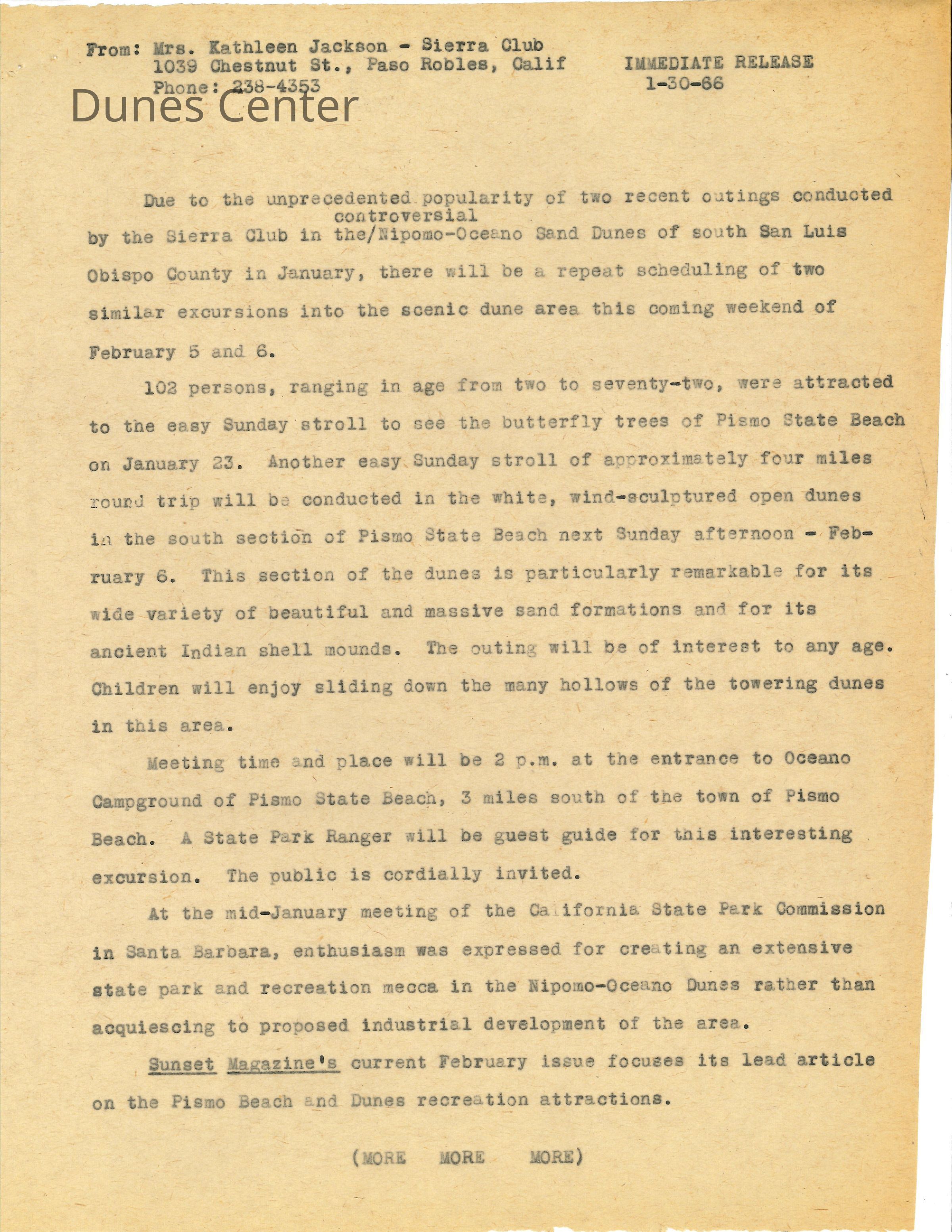 January 30, 1966, Press release from Kathleen Goddard-Jones about upcoming outings in the dunes.