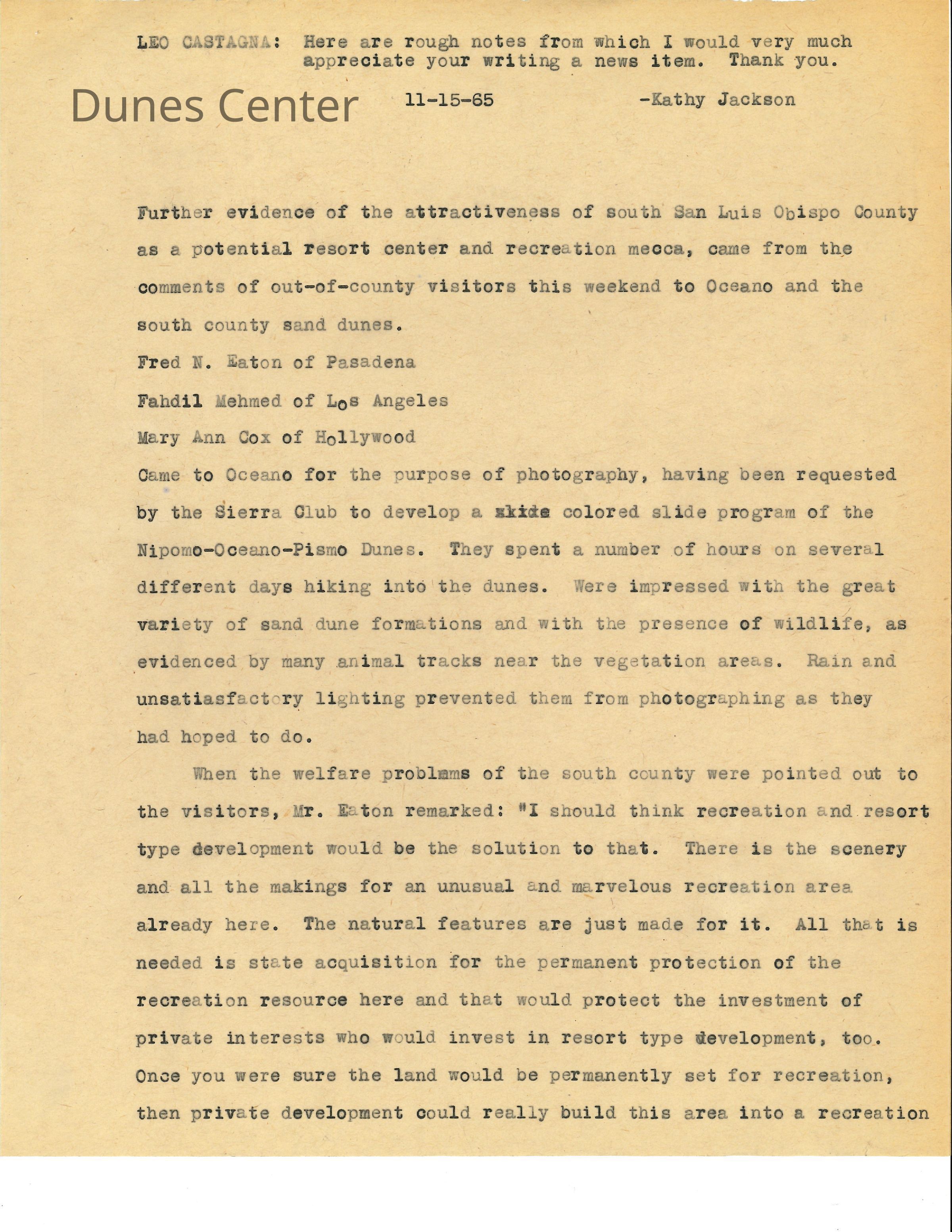 November 15, 1965, Press Release from Kathleen Goddard-Jones about the potential of south San Luis Obispo County as a potential resort and recreation center.