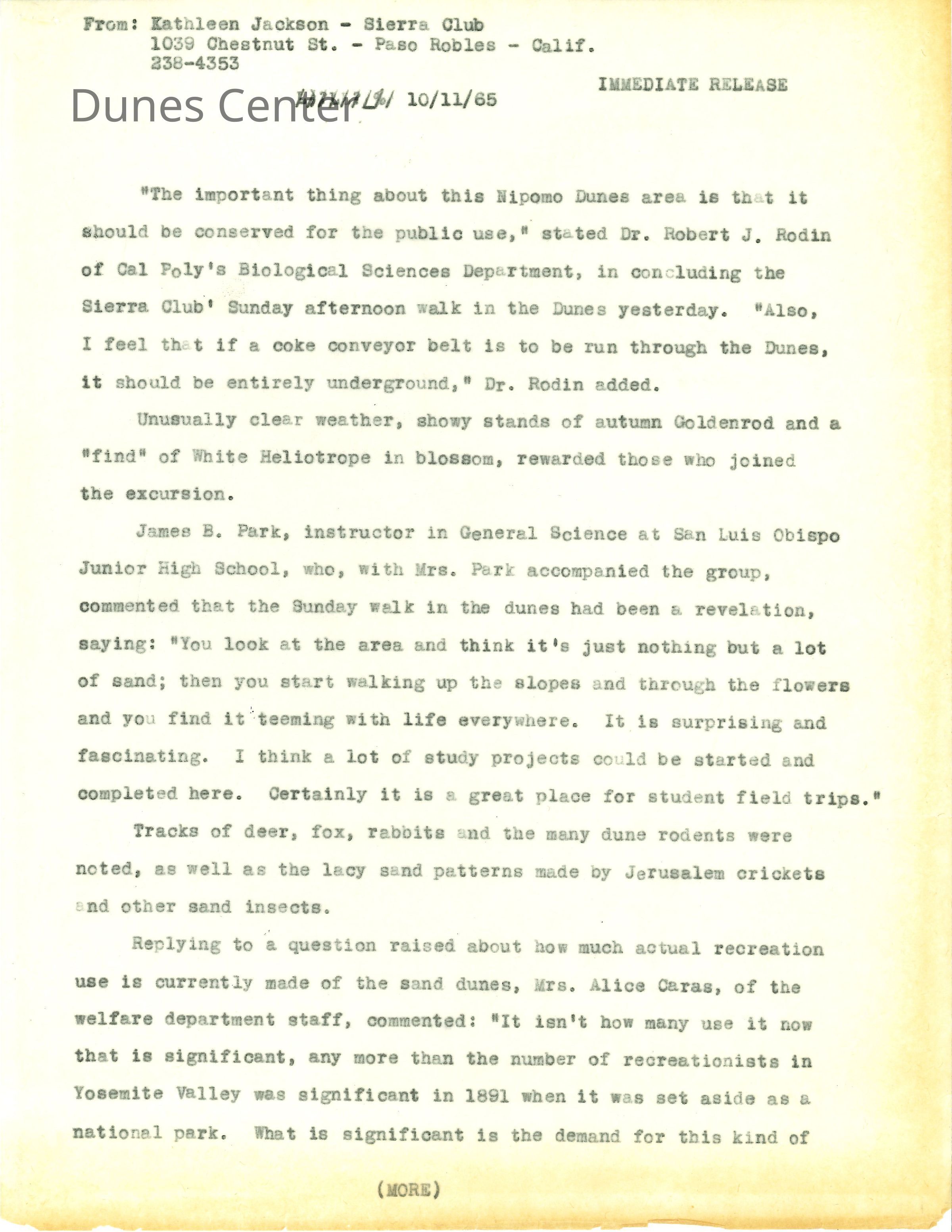 October 11, 1965, Press release from Kathleen Goddard-Jones about the value of conserving the dunes for public use.