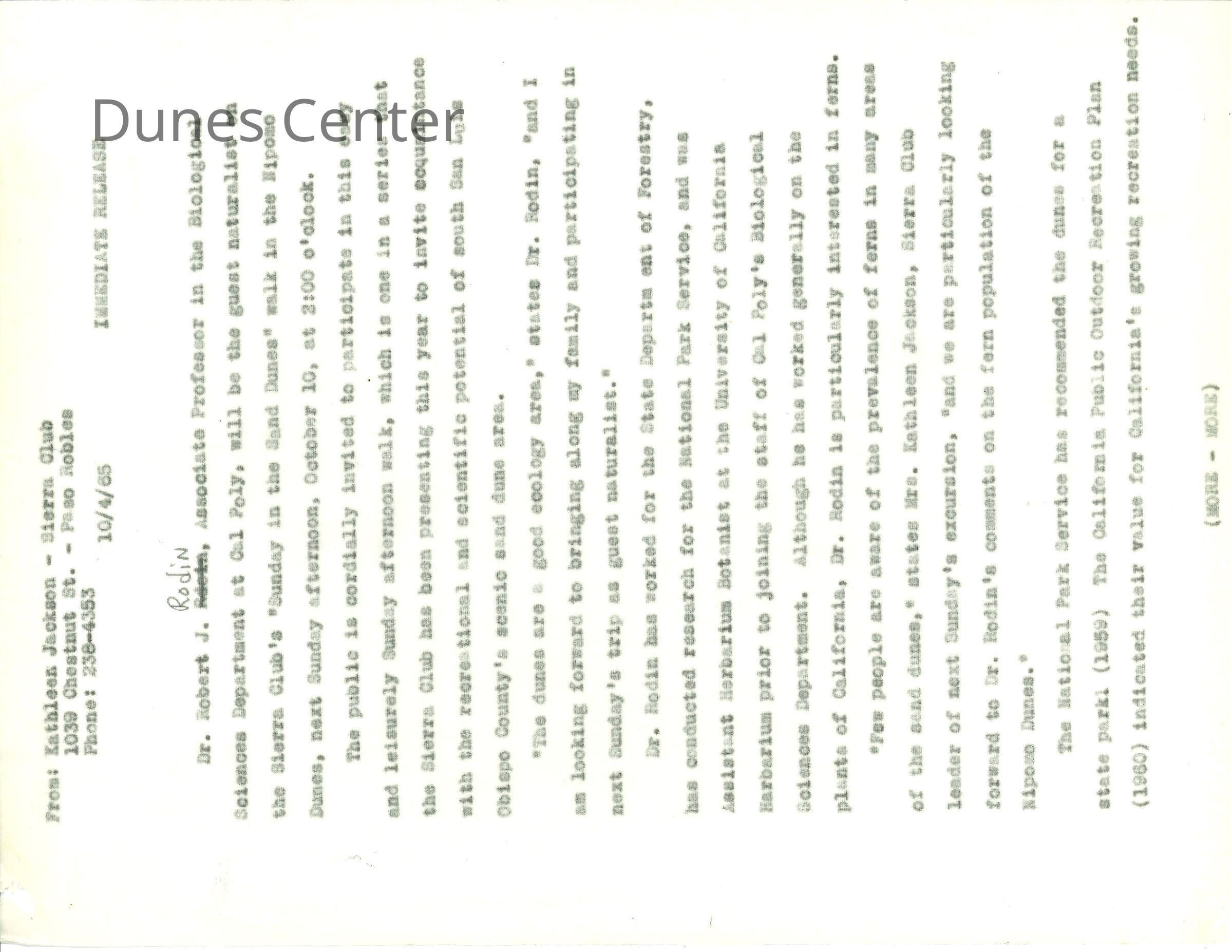 October 4, 1965, Press release from Kathleen Goddard-Jones about the value of conserving the dunes for public use.